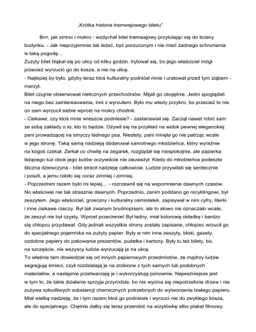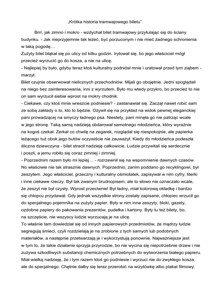 „Krótka historia tramwajowego biletu” Brrr, jak zimno i mokro - wzdychał bilet tramwajowy przytulając się do ściany budynku. - Jak nieprzyjemnie tak leżeć, być porzuconym i nie mieć żadnego schronienia w taką pogodę… Zużyty bilet błąkał się po ulicy od kilku godzin. Irytował się, bo jego właściciel mógł przecież wyrzucić go do kosza, a nie na ulicę. - Najlepiej by było, gdyby teraz ktoś kulturalny podniósł mnie i uratował przed tym ziąbem marzył. Bilet czujnie obserwował nielicznych przechodniów. Mijali go obojętnie. Jedni spoglądali na niego bez zainteresowania, inni z wyrzutem. Było mu wtedy przykro, bo przecież to nie on sam wyrzucił siebie wprost na mokry chodnik. - Ciekawe, czy ktoś mnie wreszcie podniesie? - zastanawiał się. Zaczął nawet robić sam ze sobą zakłady o to, kto to będzie. Ożywił się na przykład na widok pewnej eleganckiej pani prowadzącej na smyczy ładnego psa. Niestety, pani minęła go nie patrząc wcale w jego stronę. Taką samą nadzieją obdarował samotnego młodzieńca, który wyraźnie na kogoś czekał. Zerkał co chwilę na zegarek, rozglądał się niespokojnie, ale papierka leżącego tuż obok jego butów oczywiście nie zauważył. Kiedy do młodzieńca podeszła śliczna dziewczyna - bilet stracił nadzieję całkowicie. Ludzie przywitali się serdecznie i poszli, a jemu robiło się coraz zimniej i zimniej. - Poprzednim razem było mi lepiej… - rozrzewnił się na wspomnienie dawnych czasów. No właściwie nie tak strasznie dawnych. Poprzednio, zanim poddano go recyklingowi, był zeszytem. Jego właściciel, grzeczny i kulturalny ośmiolatek, zapisywał w nim cyfry, literki i inne ciekawe rzeczy. Był tak zwanym brudnopisem, ale to słowo nie oznaczało wcale, że zeszyt nie był czysty. Wprost przeciwnie! Był ładny, miał kolorową okładkę i bardzo się chłopcu przydawał. Gdy jednak wszystkie strony zostały zapisane, chłopiec wrzucił go do specjalnego pojemnika na zużyty papier. Były w nim inne zeszyty, bloki, gazety, ozdobne papiery do pakowania prezentów, pudełka i kartony. Były tu też bilety, bo, na szczęście, nie wszyscy ludzie wyrzucają je na ulicę. To właśnie tam dowiedział się od innych papierowych przedmiotów, że mądrzy ludzie segregują śmieci, czyli rozdzielają je na zrobione z tych samych lub podobnych materiałów, a następnie przetwarzają je i wykorzystują ponownie. Najważniejsze jest w tym to, że takie działanie sprzyja przyrodzie, bo nie wycina się niepotrzebnie drzew i nie zużywa szkodliwych substancji chemicznych potrzebnych do wytworzenia białego papieru. Miał wielką nadzieję, że i tym razem ktoś go podniesie i wyrzuci nie do zwykłego kosza, ale do specjalnego. Chętnie dałby się teraz przerobić na wizytówkę albo plakat filmowy. Może to następne życie byłoby nieco dłuższe i wygodniejsze niż krótki żywot tramwajowego biletu? Noc minęła. Zimno było dokuczliwe, ale jakoś udało się je wytrzymać. Bilet, by dodać sobie otuchy pomyślał, że dobrą stroną sytuacji jest to, iż bilety nie łapią kataru ani grypy. Pocieszając tak samego siebie, pofrunął na sąsiednią ulicę. Wiatr przybrał na sile, a niebo zakryły duże, ciemne chmury. - Oj, na pewno zaraz lunie deszcz - pomyślał. - Chyba przemoknę zupełnie. Tak się jednak nie stało, bo zza rogu budynku wyszła młoda pani trzymająca za rękę małą dziewczynkę. - O, śmieć! - zawołało dziecko na widok pomiętego papierka. Bilet posmutniał i zrobiło mu się przykro. To było takie nieładne słowo. Dziewczynka jednak schyliła się i… wzięła go do ręki. - Mamusiu, czy wyrzucimy ten papierek do kosza? - zapytała. - Nie, kochanie. Przed przedszkolem stoi przecież pojemnik na papier, to tam go zostawimy. - Jestem uratowany! - ucieszył się bilet i natychmiast wybaczył dobrze wychowanej dziewczynce to brzydkie słowo, którym go chwilę wcześniej obdarowała. Po kilku minutach znalazł się nareszcie w suchym kontenerze, gdzie leżało już sporo różnych papierów. - Jak to dobrze - pomyślał. - Skoro jest nas tu tak pełno, to pewnie wkrótce zostaniemy przetworzeni na coś nowego. Gdybym jednak miał znów zostać biletem, to liczę, że ktoś, kto będzie moim właścicielem, zachowa się rozsądnie, a ja nie będę musiał błąkać się po ulicy. A że przy okazji zyska na tym środowisko, to już zupełnie inna sprawa… Dla ciekawych Recykling to odzyskiwanie różnych materiałów i substancji zawartych w niektórych odpadach. Przy użyciu nowoczesnych technologii można powtórnie przetworzyć papier, metal, plastik i szkło. W ten pożyteczny sposób zmniejsza się rosnącą stale na świecie ilość śmieci.