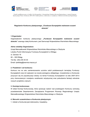 Projekt współfinansowany ze środków Unii Europejskiej z Europejskiego Funduszu Rozwoju Regionalnego w ramach Programu Operacyjnego Pomoc Techniczna 2007-2013 i budŜet państwa, realizowany we współpracy z Ministerstwem Rozwoju Regionalnego Regulamin Konkursu plastycznego „Fundusze Europejskie malowane oczami dziecka” 1.Organizator Organizatorem konkursu plastycznego „Fundusze Europejskie malowane oczami dziecka” zwanego dalej Konkursem, jest Samorząd Województwa Warmińsko-Mazurskiego. Adres siedziby Organizatora: Urząd Marszałkowski Województwa Warmińsko-Mazurskiego w Olsztynie Lokalny Punkt Informacyjny Funduszy Europejskich w Elblągu ul. Zacisze 18 82 – 300 Elbląg Tel./fax (55) 235 35 30 Email: [email protected] 2. Przedmiot i cel konkursu Konkurs ma na celu zainteresowanie uczniów szkół podstawowych tematyką Funduszy Europejskich oraz ich wpływem na rozwój subregionu elbląskiego. Uczestnictwo w Konkursie przyczyni się do popularyzacji wiedzy na temat Funduszy Europejskich na lata 2007-2013 przy równoczesnym rozwijaniu wraŜliwości artystycznej oraz pobudzenia fantazji odnośnie nowych projektów unijnych. 3. Komisja konkursowa W skład Komisji Konkursowej, która sprawuje nadzór nad przebiegiem Konkursu wchodzą przedstawiciele Departamentu Zarządzania Programami Rozwoju Regionalnego Urzędu Marszałkowskiego Województwa Warmińsko-Mazurskiego w Olsztynie. 4. Warunki uczestnictwa w Konkursie plastycznym 1. Udział w Konkursie jest dobrowolny i bezpłatny. 1 Projekt współfinansowany ze środków Unii Europejskiej z Europejskiego Funduszu Rozwoju Regionalnego w ramach Programu Operacyjnego Pomoc Techniczna 2007-2013 i budŜet państwa, realizowany we współpracy z Ministerstwem Rozwoju Regionalnego 2. Konkurs adresowany jest do uczniów klas czwartych, piątych oraz szóstych szkół podstawowych z subregionu elbląskiego. 3. Uczniowie klasy czwartej, piątej oraz szóstej przygotowują odręcznie wykonane prace plastyczne o tematyce związanej z Funduszami Europejskimi. Tematyka konkursu dotyczy nie tylko zrealizowanych projektów z Funduszy Unijnych na terenie subregionu elbląskiego, ale równieŜ przedstawienia wizji uczniów w pozyskiwaniu środków na inwestycje obejmujące teren subregionu elbląskiego w przyszłości, np. infrastruktura sportowo-rekreacyjna, turystyczna, a takŜe dodatkowe zajęcia pozalekcyjne, kursy językowe, współpraca i kontakty ze szkołami z obszaru Unii Europejskiej itp. 4. Uczniowie wykonują pracę plastyczną dowolną techniką artystyczną, przy uŜyciu róŜnych form plastycznych np. wycinanki, rysunki, róŜne techniki malarskie itp. 5. Prace mają być wykonane w formacie A4 (210 mm x 297 mm). 6. Prace konkursowe muszą być pracami przygotowanymi w celu uczestnictwa w Konkursie i nie mogą być zgłaszane w innych konkursach. Nadesłanie prac na Konkurs jest jednoznaczne ze złoŜeniem deklaracji o tych faktach. 7. KaŜdy uczeń szkoły podstawowej moŜe zgłosić do Konkursu tylko jedną, samodzielnie wykonaną pracę plastyczną. 8. Warunkiem zakwalifikowania pracy do udziału w Konkursie jest czytelne podpisanie jej imieniem i nazwiskiem autora pracy, wraz z podaniem klasy, nazwy szkoły, adresu i numeru telefonu oraz imienia i nazwiska opiekuna szkolnego. 9. Wraz z pracą naleŜy dostarczyć zgłoszenie do Konkursu (dostępne w formie elektronicznej na stronie internetowej www.rpo.warmia.mazury.pl oraz w siedzibie Organizatora (załącznik nr 1). 10. Nauczyciel przesyła prace oraz formularze zgłoszeniowe do Konkursu. Podpisane przez prawnych opiekunów formularze zgłoszeniowe są jednoczesnym potwierdzeniem informacji, Ŝe: a) kaŜda zgłoszona przez niego do Konkursu praca jest oryginalna, wynikiem samodzielnej twórczości zgłoszonego dziecka, b) przysługują mu autorskie prawa osobiste i majątkowe do pracy konkursowej i nie są w Ŝaden sposób ograniczone lub obciąŜone prawami osób trzecich oraz, Ŝe materiały konkursowe nie naruszają praw osób trzecich, c) nie udzielił Ŝadnej licencji uprawniającej do korzystania z materiałów konkursowych, 2 Projekt współfinansowany ze środków Unii Europejskiej z Europejskiego Funduszu Rozwoju Regionalnego w ramach Programu Operacyjnego Pomoc Techniczna 2007-2013 i budŜet państwa, realizowany we współpracy z Ministerstwem Rozwoju Regionalnego d) posiada wyłączne prawo do udzielania zezwoleń na rozporządzanie i korzystanie z materiałów konkursowych, e) przenosi te prawa nieodpłatnie na Organizatora zezwalając mu na wykorzystanie pracy konkursowej w sposób określony niniejszym Regulaminem w zakresie pół eksploatacji wymienionych w ust. 11 11. Organizator zastrzega sobie prawo do nieodpłatnego wykorzystywania wszystkich nadesłanych prac związanych z Konkursem w celach promocyjnych sieci Punktów Informacyjnych o Funduszach Europejskich, pola eksploatacji stanowią w szczególności : 1) w zakresie utrwalania i zwielokrotniania – wytwarzanie określoną techniką egzemplarzy, w tym techniką drukarską, reprograficzną, zapisu magnetycznego oraz techniką cyfrową; 2) w zakresie obrotu oryginałem albo egzemplarzami, na których pracę konkursową utrwalono – wprowadzanie do obrotu, uŜyczenie lub najem oryginału albo egzemplarzy; 3) w zakresie rozpowszechniania w sposób inny niŜ określony w pkt 2 – publiczne wykonanie, wystawienie, wyświetlenie, odtworzenie oraz nadawanie i reemitowanie, a takŜe publiczne udostępnianie w taki sposób, aby kaŜdy mógł mieć do niego dostęp w miejscu i w czasie przez siebie wybranym. 12. Uczestnik przystępując do Konkursu wyraŜa zgodę na treść postanowień ust. 10 i ust. 11 i zobowiązuje się nie zgłaszać Ŝadnych roszczeń względem Organizatora. 5. Przebieg konkursu 1. Prace naleŜy przesłać lub dostarczyć osobiście do siedziby Organizatora w terminie od 01 do 31 października 2013 r. 2. Spośród przygotowanych prac Komisja wybierze, trzy najlepsze prace konkurs