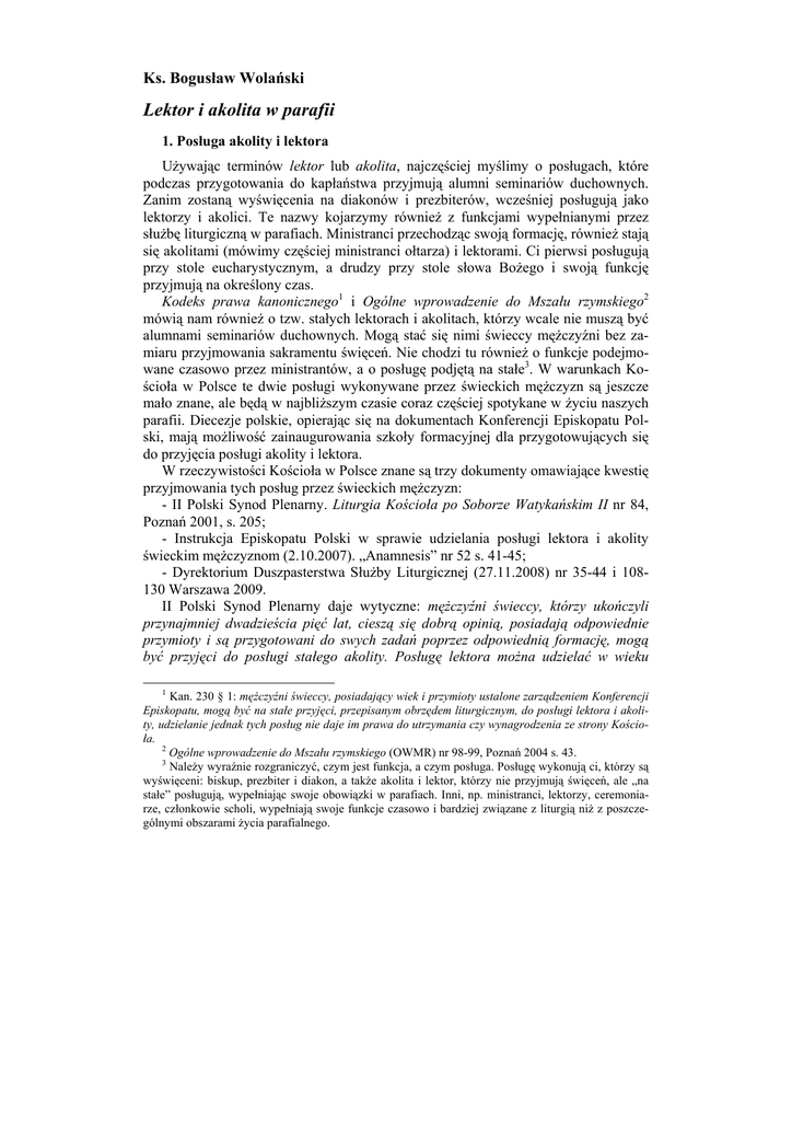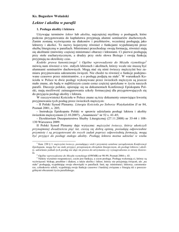 Ks. Bogusław Wolański Lektor i akolita w parafii 1. Posługa akolity i lektora Używając terminów lektor lub akolita, najczęściej myślimy o posługach, które podczas przygotowania do kapłaństwa przyjmują alumni seminariów duchownych. Zanim zostaną wyświęcenia na diakonów i prezbiterów, wcześniej posługują jako lektorzy i akolici. Te nazwy kojarzymy również z funkcjami wypełnianymi przez służbę liturgiczną w parafiach. Ministranci przechodząc swoją formację, również stają się akolitami (mówimy częściej ministranci ołtarza) i lektorami. Ci pierwsi posługują przy stole eucharystycznym, a drudzy przy stole słowa Bożego i swoją funkcję przyjmują na określony czas. Kodeks prawa kanonicznego1 i Ogólne wprowadzenie do Mszału rzymskiego2 mówią nam również o tzw. stałych lektorach i akolitach, którzy wcale nie muszą być alumnami seminariów duchownych. Mogą stać się nimi świeccy mężczyźni bez zamiaru przyjmowania sakramentu święceń. Nie chodzi tu również o funkcje podejmowane czasowo przez ministrantów, a o posługę podjętą na stałe3. W warunkach Kościoła w Polsce te dwie posługi wykonywane przez świeckich mężczyzn są jeszcze mało znane, ale będą w najbliższym czasie coraz częściej spotykane w życiu naszych parafii. Diecezje polskie, opierając się na dokumentach Konferencji Episkopatu Polski, mają możliwość zainaugurowania szkoły formacyjnej dla przygotowujących się do przyjęcia posługi akolity i lektora. W rzeczywistości Kościoła w Polsce znane są trzy dokumenty omawiające kwestię przyjmowania tych posług przez świeckich mężczyzn: - II Polski Synod Plenarny. Liturgia Kościoła po Soborze Watykańskim II nr 84, Poznań 2001, s. 205; - Instrukcja Episkopatu Polski w sprawie udzielania posługi lektora i akolity świeckim mężczyznom (2.10.2007). „Anamnesis” nr 52 s. 41-45; - Dyrektorium Duszpasterstwa Służby Liturgicznej (27.11.2008) nr 35-44 i 108130 Warszawa 2009. II Polski Synod Plenarny daje wytyczne: mężczyźni świeccy, którzy ukończyli przynajmniej dwadzieścia pięć lat, cieszą się dobrą opinią, posiadają odpowiednie przymioty i są przygotowani do swych zadań poprzez odpowiednią formację, mogą być przyjęci do posługi stałego akolity. Posługę lektora można udzielać w wieku 1 Kan. 230 § 1: mężczyźni świeccy, posiadający wiek i przymioty ustalone zarządzeniem Konferencji Episkopatu, mogą być na stałe przyjęci, przepisanym obrzędem liturgicznym, do posługi lektora i akolity, udzielanie jednak tych posług nie daje im prawa do utrzymania czy wynagrodzenia ze strony Kościoła. 2 Ogólne wprowadzenie do Mszału rzymskiego (OWMR) nr 98-99, Poznań 2004 s. 43. 3 Należy wyraźnie rozgraniczyć, czym jest funkcja, a czym posługa. Posługę wykonują ci, którzy są wyświęceni: biskup, prezbiter i diakon, a także akolita i lektor, którzy nie przyjmują święceń, ale „na stałe” posługują, wypełniając swoje obowiązki w parafiach. Inni, np. ministranci, lektorzy, ceremoniarze, członkowie scholi, wypełniają swoje funkcje czasowo i bardziej związane z liturgią niż z poszczególnymi obszarami życia parafialnego. Ks. Bogusław Wolański 108 wcześniejszym4. Natomiast wspomniane powyżej Instrukcja Episkopatu Polski i Dyrektorium Duszpasterstwa Służby Liturgicznej precyzują różne kwestie związane z doborem i formacją kandydatów na lektorów i akolitów, wyznaczając im różne zadania we wspólnotach parafialnych. 2. Lektor i akolita we wspólnocie parafialnej A. Lektor Lektor wspiera kapłanów i diakonów w głoszeniu słowa Bożego i formacji wiernych. W liturgii może proklamować słowo Boże z wyjątkiem Ewangelii. Gdy nie ma psałterzysty, może wykonać psalm między czytaniami, a jeśli nie ma diakona, może podawać intencje modlitwy powszechnej. Może on także prowadzić modlitwę przy zmarłym i prowadzić przy pogrzebie stacje w domu zmarłego i na cmentarzu. Natomiast poza liturgią pomaga duszpasterzom w pełnieniu posługi ewangelizacyjnej. Przykładowe obszary życia wspólnoty parafialnej, które mogą być powierzone ustanowionym lektorom: - przygotowanie wiernych do godnego przyjęcia sakramentów. Może on zaangażować się w przygotowanie rodziców i chrzestnych do chrztu dziecka, może prowadzić grupy młodzieży przygotowujące się do bierzmowania lub grupy ich rodziców i świadków, a także pomagać w przygotowaniu narzeczonych do sakramentu małżeństwa; - pomoc w przygotowaniu i prowadzeniu katechezy dorosłych. Może on prowadzić małe grupy formacyjne i apostolskie, organizować kręgi biblijne, kursy ewangelizacyjne, pomagać w prowadzeniu rekolekcji zamkniętych, a także prowadzić katechezy dla różnych grup; - zaangażowanie w inne posługi słowa w parafii. Jako zadanie dla lektora wymienia się apostolat biblijny, redakcję gazetki parafialnej i strony internetowej, prowadzenie gablotek, kolportaż czasopism religijnych i promocję czytelnictwa książek, przygotowanie i prowadzenie osób pragnących pełnić w liturgii funkcję czytania słowa Bożego, organizowanie jasełek lub innych misteriów; - ożywienie misyjnych zadań parafii. Poprzez zaangażowanie w życie parafii lektor może docierać do ludzi zaniedbujących praktykę religijną, z nimi rozmawiać, za nich się modlić, ukazywać im drogę do sakramentów świętych. Może również wspierać misjonarzy pracujących w różnych krajach świata; - animowanie życia modlitewnego w parafii. Jest on powołany, by pomagać duszpasterzom w przygotowaniu nabożeństw oraz ich prowadzeniu (np. różaniec, droga krzyżowa, adoracja w czasie Triduum Paschalnego, czterdziestogodzinne nabożeństwo, godzina święta w pierwszy czwartek miesiąca). Może prowadzić grupy modlitewne, troszcząc się o formację ich członków; - wspieranie rodzin przed pogrzebem i po pogrzebie bliskich. Rodzina potrzebuje wsparcia modlitewnego, a ni