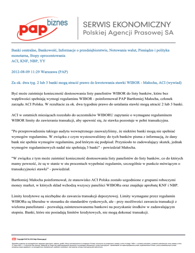 Banki centralne, Bankowość, Informacje o przedsiębiorstwie, Notowania walut, Pieniądze i polityka monetarna, Stopy oprocentowania ACI, KNF, NBP, YY 2012-08-09 11:29 Warszawa (PAP) Za ok. dwa tyg. 2 lub 3 banki mogą stracić prawo do kwotowania stawki WIBOR - Małocha, ACI (wywiad) Być może zaistnieje konieczność dostosowania listy panelistów WIBOR do listy banków, które bez wątpliwości spełniają wymogi regulaminu WIBOR - poinformował PAP Bartłomiej Małocha, członek zarządu ACI Polska. W rezultacie za ok. dwa tygodnie prawo do ustalania stawki mogą utracić 2 lub 3 banki. ACI w ostatnich miesiącach rozesłało do uczestników WIBORU zapytanie o wymagane regulaminem WIBOR limity do zawierania transakcji, aby upewnić się, że stawka pozostaje w pełni transakcyjna. "Po przeprowadzeniu takiego audytu wewnętrznego zauważyliśmy, że niektóre banki mogą nie spełniać wymogów regulaminu. W związku z czym wystosowaliśmy do tych banków pisma z informacją, że dany bank nie spełnia wymogów regulaminu, pod którym się podpisał. Przyniosło to zadowalający skutek, jednak wymogów regulaminowych nadal nie spełniają 3 banki" - powiedział Małocha. "W związku z tym może zaistnieć konieczność dostosowania listy panelistów do listy banków, co do których mamy pewność, że są w stanie w stu procentach wypełniać regulamin, szczególnie w punkcie mówiącym o transakcyjności stawki" - powiedział. Bartłomiej Małocha poinformował, że stanowisko ACI Polska zostało uzgodnione z grupami roboczymi money market, w których skład wchodzą wszyscy paneliści WIBORu oraz znajduje aprobatę KNF i NBP. Limity kredytowe są niezbędne do zawarcia transakcji depozytowej. Limity wymagane przez regulamin WIBORu są liberalne w stosunku do standardów rynkowych, ale - przy możliwości zawarcia transakcji z wieloma panelistami - pozwalają zainteresowanemu bankowi na pozyskanie środków w zadawalającym stopniu. Banki, które nie posiadają limitów kredytowych, nie mogą dokonać transakcji. Copyright PAP SA 2012 http://biznes.pap.pl ACI ma nadzieję, że dostosowanie listy panelistów do banków, które posiadają wymagane limity, w związku z czym z pewnością są w stanie sfinalizować ewentualną transakcję, podniesie poziom zaufania na rynku międzybankowym i dodatnio wpłynie na płynność sektora. „Zależy nam, aby było to elitarne grono przyjmujące odpowiedzialność za stawkę, którą kwotuje” powiedział Małocha. Jego zdaniem istnieje zagrożenie, że dwa lub trzy banki pomimo "postępowania naprawczego" mogą nie dostosować się do wymogów regulaminu. "Uważamy, że ich udział w kwotowaniu stawki podważa zaufanie nie tylko do sektora, ale także do regulatora” - powiedział Małocha zaznaczając, że KNF podziela to stanowisko. "KNF - powiedział Małocha - uważa, że polityka kredytowa powinna być prowadzona w kraju i powinna odzwierciedlać kondycję sektora krajowego a nie zagranicznego". „Nasz sektor jest w nieporównywalnie lepszej sytuacji i to powinno być odzwierciedlone w liniach kredytowych. Zaufanie między bankami znajdującymi się w Polsce powinno być wyższe” - powiedział. Przedstawiciel ACI podkreślił, że usunięcie banku z listy panelistów WIBORu nie wpłynie negatywnie na jego kondycję finansową, lecz koszt pozyskania pieniądza na rynku w przypadku takiego banku może być lekko wyższy. „Jeżeli bank nie jest dilerem rynku pieniężnego, nie posiada limitów albo inne banki nie posiadają limitów na niego, to cena pieniądza może być skorygowana o premię za ryzyko. Ta premia może być różna, aczkolwiek te stawki nie różnią się jakoś drastycznie” - powiedział. Bartłomiej Małocha zaznaczył też, że niechęć niektórych banków do pokazania limitów związana jest z polityką kredytową jednostki i jej oceną ryzyka, w żadnym wypadku zaś nie należy łączyć tej sytuacji np. z kondycją finansową jednostki. „To oznacza jedynie, że ich ocena ryzyka kredytowego sektora jest mocno podwyższona” - powiedział. Jeżeli banki, do których skierowano pisma, nie dostosują się do regulaminu WIBOR, zmiany wejdą w życie najprawdopodobniej za dwa tygodnie. „Czekamy na odpowiedź. Termin odpowiedzi upływa z końcem bieżącego tygodnia. Potem jest 14 dni okresu wypowiedzenia regulaminu. Potem zmiany wchodzą w życie. Rynek zostanie poinformowany Copyright PAP SA 2012 http://biznes.pap.pl niezwłocznie po podjęciu decyzji o usunięciu banku z grona panelistów lub otrzymaniu przez nas pisma, że dany bank rezygnuje z uczestnictwa, do czego też obliguje nas regulamin” - powiedział Małocha. Przedstawiciel ACI przypomniał, że liczba uczestników WIBOR spadnie także w wyniku konsolidacji sektora, m.in. połączenia Kredyt Banku i BZ WBK. Poinformował natomiast, że stowarzyszenie prowadzi rozmowy z dwoma bankami, które mogą dołączyć do listy. Małocha uważa, że zmiana liczby banków, które kwotują stawkę nie wpłynie na jej jakość. WIBOR wskazuje wysokość oprocentowania pożyczek na polskim rynku międzybankowym. WIBOR ustalany jest w każdy dzień roboczy o godzinie 11.00, na fixingu organizowanym przez Stowarzyszenie Rynków Finansowych ACI Polska na podstawie ofert złożonych przez 14 banków, po odrzuceniu dwóch najwyższych i dwóch najniższych wielkości. W ciągu 15 minut od publikacji indeksów ustalonych podczas fixingu uczestniczące w nim banki - jeżeli zajdzie taka potrzeba - zobowiązane są do zawierania między sobą transakcji według stawek nie gorszych niż zgłoszone danego dnia. WIBOR od LIBOR różni się tym, że ustalany jest dla transakcji, które - jeżeli zgłosi się chętny - muszą zostać zawarte, wobec czego jest to stawka transakcyjna. LIBOR jest stawką indykacyjną. Banki uczestniczące w fixingu wskazują po jakim koszcie one same są się w stanie sfinansować. Nie jest to wskazanie warunków na jakich są skłonne po