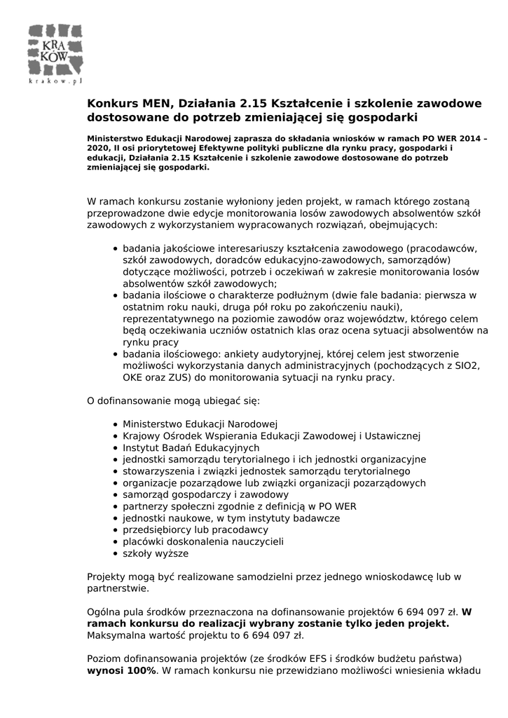 Konkurs MEN, Działania 2.15 Kształcenie i szkolenie zawodowe dostosowane do potrzeb zmieniającej się gospodarki Ministerstwo Edukacji Narodowej zaprasza do składania wniosków w ramach PO WER 2014 – 2020, II osi priorytetowej Efektywne polityki publiczne dla rynku pracy, gospodarki i edukacji, Działania 2.15 Kształcenie i szkolenie zawodowe dostosowane do potrzeb zmieniającej się gospodarki. W ramach konkursu zostanie wyłoniony jeden projekt, w ramach którego zostaną przeprowadzone dwie edycje monitorowania losów zawodowych absolwentów szkół zawodowych z wykorzystaniem wypracowanych rozwiązań, obejmujących: badania jakościowe interesariuszy kształcenia zawodowego (pracodawców, szkół zawodowych, doradców edukacyjno-zawodowych, samorządów) dotyczące możliwości, potrzeb i oczekiwań w zakresie monitorowania losów absolwentów szkół zawodowych; badania ilościowe o charakterze podłużnym (dwie fale badania: pierwsza w ostatnim roku nauki, druga pół roku po zakończeniu nauki), reprezentatywnego na poziomie zawodów oraz województw, którego celem będą oczekiwania uczniów ostatnich klas oraz ocena sytuacji absolwentów na rynku pracy badania ilościowego: ankiety audytoryjnej, której celem jest stworzenie możliwości wykorzystania danych administracyjnych (pochodzących z SIO2, OKE oraz ZUS) do monitorowania sytuacji na rynku pracy. O dofinansowanie mogą ubiegać się: Ministerstwo Edukacji Narodowej Krajowy Ośrodek Wspierania Edukacji Zawodowej i Ustawicznej Instytut Badań Edukacyjnych jednostki samorządu terytorialnego i ich jednostki organizacyjne stowarzyszenia i związki jednostek samorządu terytorialnego organizacje pozarządowe lub związki organizacji pozarządowych samorząd gospodarczy i zawodowy partnerzy społeczni zgodnie z definicją w PO WER jednostki naukowe, w tym instytuty badawcze przedsiębiorcy lub pracodawcy placówki doskonalenia nauczycieli szkoły wyższe Projekty mogą być realizowane samodzielni przez jednego wnioskodawcę lub w partnerstwie. Ogólna pula środków przeznaczona na dofinansowanie projektów 6 694 097 zł. W ramach konkursu do realizacji wybrany zostanie tylko jeden projekt. Maksymalna wartość projektu to 6 694 097 zł. Poziom dofinansowania projektów (ze środków EFS i środków budżetu państwa) wynosi 100%. W ramach konkursu nie przewidziano możliwości wniesienia wkładu własnego beneficjenta. Wnioski można składać w terminie od 30 czerwca 2016 r. do 12 sierpnia 2016 r. Szczegółowe informacje można uzyskać na stronie internetowej pod adresem: http://www.power.gov.pl/nabory/215-ksztalcenie-i-szkolenie-zawodowe-dostosowanedo-potrzeb-zmieniajacej-sie-gospodarki-6/ Powered by TCPDF (www.tcpdf.org)