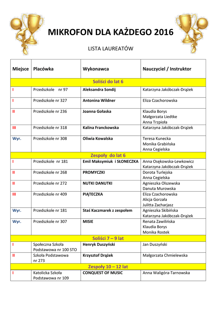 MIKROFON DLA KAŻDEGO 2016 LISTA LAUREATÓW Miejsce Placówka Wykonawca Nauczyciel / Instruktor Soliści do lat 6 I Przedszkole nr 97 Aleksandra Sondij Katarzyna Jakóbczak-Drążek I Przedszkole nr 327 Antonina Wildner Eliza Czachorowska II Przedszkole nr 236 Joanna Gołaska III Przedszkole nr 318 Kalina Franckowska Klaudia Borys Małgorzata Liedtke Anna Trzpioła Katarzyna Jakóbczak-Drążek Wyr. Przedszkole nr 308 Oliwia Kowalska Teresa Kunecka Monika Grabińska Anna Cegielska Zespoły do lat 6 I Przedszkole nr 181 II Przedszkole nr 268 II Przedszkole nr 272 III Przedszkole nr 409 Wyr. Przedszkole nr 181 Wyr. Przedszkole nr 307 Emil Maksymiuk i SŁONECZKA Anna Osękowska-Lewkowicz Katarzyna Jakóbczak-Drążek PROMYCZKI Dorota Turlejska Anna Cegielska NUTKI DANUTKI Agnieszka Olszewska Danuta Murowska PIĄTECZKA Eliza Czachorowska Alicja Gorzała Julitta Zacharjasz Staś Kaczmarek z zespołem Agnieszka Skibińska Katarzyna Jakóbczak-Drążek MISIE Renata Zawilińska Klaudia Borys Monika Rostek Soliści 7 – 9 lat I II Społeczna Szkoła Podstawowa nr 100 STO Szkoła Podstawowa nr 273 Henryk Duszyński Jan Duszyński Krzysztof Drążek Małgorzata Chmielewska Zespoły 10 – 12 lat I Katolicka Szkoła Podstawowa nr 109 CONQUEST OF MUSIC Anna Waligóra-Tarnowska Soliści 10 – 12 lat I II II III Wyr. Wyr. Szkoła Podstawowa nr 293 Szkoła Podstawowa nr 133 Szkoła Podstawowa nr 133 Szkoła Podstawowa nr 263 Bielańskie Centrum Edukacji Kulturalnej Szkoła Podstawowa nr 293 Franciszek Szajewski Eliza Czachorowska Aleksandra Makowska Luba Panow Iza Szczęsna Marcin Wortmann Iza Szczęsna Aleksander Góral Monika Dragan Aleksandra Sopińska Mariola Strukowska Jagoda Król Teresa Budzanowska Soliści 13 – 15 lat I II II III Bielańskie Centrum Edukacji Kulturalnej Gimnazjum nr 72 Gabriela Biesiakirska Mariola Strukowska Aleksandra Matuszczyk Andrzej Machowski Niepubliczne Gimnazjum nr 12 Bielańskie Centrum Edukacji Kulturalnej Natalia Banaszkiewicz Zgłoszenie indywidualne Marta Tłokińska Mariola Strukowska Zespoły 13 – 15 lat II Gimnazjum nr 72 Chór DOMINANTA Andrzej Machowski II Bielańskie Centrum Edukacji Kulturalnej Ognisko BIELANY Zespół wokalny M.A.T. Mariola Strukowska PRINK GIRLS Ewa Błachnio III Soliści od 16 lat I II III Młodzieżowy Dom Kultury im. M. Gwizdak XXII Liceum Ogólnokształcące im. Jose Marti Młodzieżowy Dom Kultury BIELANY Iwona Janus Małgorzata Hutek Wiktoria Kościelniak Sandra Zaleska Jacek Niemaszyk Wojciech Wielechowski