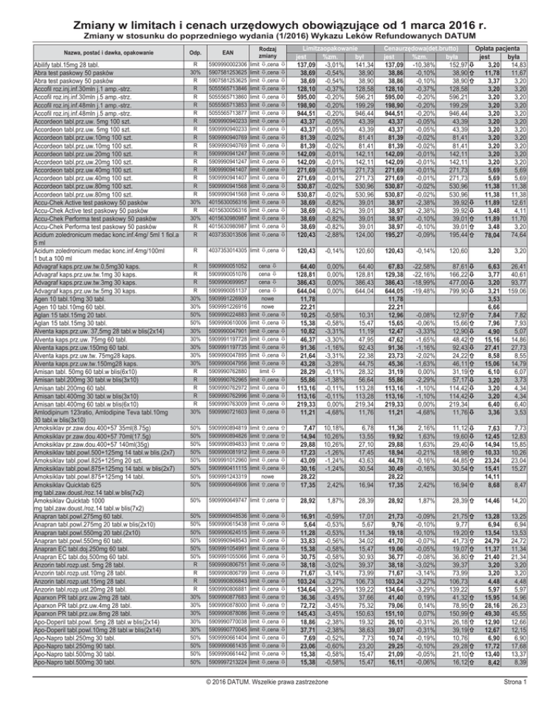 Zmiany w limitach i cenach urzędowych obowiązujące od 1 marca 2016 r. Zmiany w stosunku do poprzedniego wydania (1/2016) Wykazu Leków Refundowanych DATUM Nazwa, postać i dawka, opakowanie Abilify tabl.15mg 28 tabl. Abra test paskowy 50 pasków Abra test paskowy 50 pasków Accofil roz.inj.inf.30mln j.1 amp.-strz. Accofil roz.inj.inf.30mln j.5 amp.-strz. Accofil roz.inj.inf.48mln j.1 amp.-strz. Accofil roz.inj.inf.48mln j.5 amp.-strz. Accordeon tabl.prz.uw. 5mg 100 szt. Accordeon tabl.prz.uw. 5mg 100 szt. Accordeon tabl.prz.uw.10mg 100 szt. Accordeon tabl.prz.uw.10mg 100 szt. Accordeon tabl.prz.uw.20mg 100 szt. Accordeon tabl.prz.uw.20mg 100 szt. Accordeon tabl.prz.uw.40mg 100 szt. Accordeon tabl.prz.uw.40mg 100 szt. Accordeon tabl.prz.uw.80mg 100 szt. Accordeon tabl.prz.uw.80mg 100 szt. Accu-Chek Active test paskowy 50 pasków Accu-Chek Active test paskowy 50 pasków Accu-Chek Performa test paskowy 50 pasków Accu-Chek Performa test paskowy 50 pasków Acidum zoledronicum medac konc.inf.4mg/ 5ml 1 fiol.a 5 ml Acidum zoledronicum medac konc.inf.4mg/100ml 1 but.a 100 ml Advagraf kaps.prz.uw.tw.0,5mg30 kaps. Advagraf kaps.prz.uw.tw.1mg 30 kaps. Advagraf kaps.prz.uw.tw.3mg 30 kaps. Advagraf kaps.prz.uw.tw.5mg 30 kaps. Agen 10 tabl.10mg 30 tabl. Agen 10 tabl.10mg 60 tabl. Aglan 15 tabl.15mg 20 tabl. Aglan 15 tabl.15mg 30 tabl. Alventa kaps.prz.uw. 37,5mg 28 tabl.w blis(2x14) Alventa kaps.prz.uw. 75mg 60 tabl. Alventa kaps.prz.uw.150mg 60 tabl. Alventa kaps.prz.uw.tw. 75mg28 kaps. Alventa kaps.prz.uw.tw.150mg28 kaps. Amisan tabl. 50mg 60 tabl.w blis(6x10) Amisan tabl.200mg 30 tabl.w blis(3x10) Amisan tabl.200mg 60 tabl. Amisan tabl.400mg 30 tabl.w blis(3x10) Amisan tabl.400mg 60 tabl.w blis(6x10) Amlodipinum 123ratio, Amlodipine Teva tabl.10mg 30 tabl.w blis(3x10) Amoksiklav pr.zaw.dou.400+57 35ml(8.75g) Amoksiklav pr.zaw.dou.400+57 70ml(17.5g) Amoksiklav pr.zaw.dou.400+57 140ml(35g) Amoksiklav tabl.powl.500+125mg 14 tabl.w blis.(2x7) Amoksiklav tabl.powl.825+125mg 20 szt. Amoksiklav tabl.powl.875+125mg 14 tabl. w blis(2x7) Amoksiklav tabl.powl.875+125mg 14 tabl. Amoksiklav Quicktab 625 mg tabl.zaw.doust./roz.14 tabl.w blis(7x2) Amoksiklav Quicktab 1000 mg tabl.zaw.doust./roz.14 tabl.w blis(7x2) Anapran tabl.powl.275mg 60 tabl. Anapran tabl.powl.275mg 20 tabl.w blis(2x10) Anapran tabl.powl.550mg 20 tabl.(2x10) Anapran tabl.powl.550mg 60 tabl. Anapran EC tabl.doj.250mg 60 tabl. Anapran EC tabl.doj.500mg 60 tabl. Anzorin tabl.rozp.ust. 5mg 28 tabl. Anzorin tabl.rozp.ust.10mg 28 tabl. Anzorin tabl.rozp.ust.15mg 28 tabl. Anzorin tabl.rozp.ust.20mg 28 tabl. Aparxon PR tabl.prz.uw.2mg 28 tabl. Aparxon PR tabl.prz.uw.4mg 28 tabl. Aparxon PR tabl.prz.uw.8mg 28 tabl. Apo-Doperil tabl.powl. 5mg 28 tabl.w blis(2x14) Apo-Doperil tabl.powl.10mg 28 tabl.w blis(2x14) Apo-Napro tabl.250mg 30 tabl. Apo-Napro tabl.250mg 90 tabl. Apo-Napro tabl.500mg 30 tabl. Apo-Napro tabl.500mg 30 tabl. Limitzaopakowanie jest %zm. był 137,09 -3,01% 141,34 38,69 -0,54% 38,90 38,69 -0,54% 38,90 128,10 -0,37% 128,58 595,00 -0,20% 596,21 198,90 -0,20% 199,29 944,51 -0,20% 946,44 43,37 -0,05% 43,39 43,37 -0,05% 43,39 81,39 -0,02% 81,41 81,39 -0,02% 81,41 142,09 -0,01% 142,11 142,09 -0,01% 142,11 271,69 -0,01% 271,73 271,69 -0,01% 271,73 530,87 -0,02% 530,96 530,87 -0,02% 530,96 38,69 -0,82% 39,01 38,69 -0,82% 39,01 38,69 -0,82% 39,01 38,69 -0,82% 39,01 120,43 -2,88% 124,00 Cenaurzędowa(det.brutto) Opłata pacjenta jest %zm. była jest była 137,09 -10,38% 152,97 Ø 14,83 3,20 38,86 -0,10% 38,90 × 11,78 11,67 38,86 -0,10% 38,90 × 3,20 3,37 128,10 -0,37% 128,58 3,20 3,20 595,00 -0,20% 596,21 3,20 3,20 198,90 -0,20% 199,29 3,20 3,20 944,51 -0,20% 946,44 3,20 3,20 43,37 -0,05% 43,39 3,20 3,20 43,37 -0,05% 43,39 3,20 3,20 81,39 -0,02% 81,41 3,20 3,20 81,39 -0,02% 81,41 3,20 3,20 142,09 -0,01% 142,11 3,20 3,20 142,09 -0,01% 142,11 3,20 3,20 271,69 -0,01% 271,73 5,69 5,69 271,69 -0,01% 271,73 5,69 5,69 530,87 -0,02% 530,96 11,38 11,38 530,87 -0,02% 530,96 11,38 11,38 38,97 -2,38% 39,92 Ø 11,89 12,61 38,97 -2,38% 39,92 Ø 4,11 3,48 38,97 -0,10% 39,01 × 11,89 11,70 38,97 -0,10% 39,01 × 3,20 3,48 195,27 -0,09% 195,44 × 78,04 74,64 4037353014305 limit Ø,cena Ø 120,43 -0,14% 120,60 120,43 -0,14% R R R R 30% 30% 50% 50% 30% 30% 30% 30% 30% R R R R R 30% 5909990051052 5909990051076 5909990699957 5909990051137 5909991226909 5909991226916 5909990224883 5909990610006 5909990047901 5909991197728 5909991197735 5909990047895 5909990047956 5909990762880 5909990762965 5909990762972 5909990762996 5909990763009 5909990721603 cena Ø cena Ø cena Ø cena Ø nowe nowe limit Ø,cena Ø limit Ø,cena Ø limit Ø,cena Ø limit Ø,cena Ø limit Ø,cena Ø limit Ø,cena Ø limit Ø,cena Ø limit Ø limit Ø,cena Ø limit Ø,cena Ø limit Ø,cena Ø limit Ø,cena Ø limit Ø,cena Ø 64,40 128,81 386,43 644,04 11,78 22,21 10,25 15,38 10,82 46,37 91,36 21,64 43,28 28,29 55,86 113,16 113,16 219,33 11,21 0,00% 0,00% 0,00% 0,00% 64,40 128,81 386,43 644,04 -22,58% -22,16% -18,99% -19,48% 87,61 Ø 166,22 Ø 477,00 Ø 799,90 Ø -0,58% -0,58% -3,31% -3,30% -1,16% -3,31% -3,28% -0,11% -1,38% -0,11% -0,11% 0,00% -4,68% 10,31 15,47 11,19 47,95 92,43 22,38 44,75 28,32 56,64 113,28 113,28 219,34 11,76 67,83 129,38 386,43 644,05 11,78 22,21 12,96 15,65 12,47 47,62 91,36 23,73 45,36 31,19 55,86 113,16 113,16 219,33 11,21 -0,08% -0,06% -3,33% -1,65% -1,16% -2,02% -1,63% 0,00% -2,29% -1,10% -1,10% 0,00% -4,68% 12,97 × 15,66 × 12,90 Ø 48,42 × 92,43 Ø 24,22 × 46,11 × 31,19 × 57,17 Ø 114,42 Ø 114,42 Ø 219,34 11,76 Ø 50% 50% 50% 50% 50% 50% 50% 50% 5909990894819 5909990894826 5909990894833 5909990081912 5909991012960 5909990411115 5909991243319 5909990646906 limit ×,cena × limit ×,cena × limit ×,cena × limit Ø,cena Ø limit Ø,cena Ø limit Ø,cena Ø nowe limit ×,cena × 7,47 14,94 29,88 17,23 43,09 30,16 28,22 17,35 10,18% 10,26% 10,26% -1,26% -1,24% -1,24% 6,78 13,55 27,10 17,45 43,63 30,54 2,16% 1,63% 1,63% -0,21% -0,16% -0,16% 11,12 Ø 19,60 Ø 29