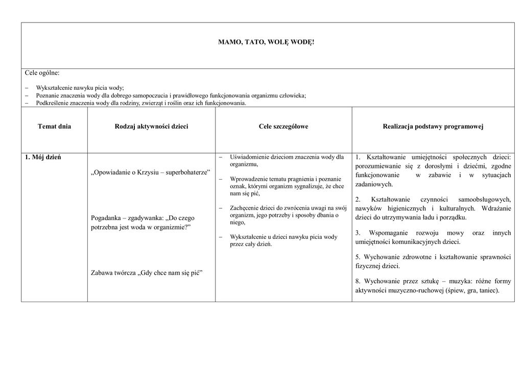 MAMO, TATO, WOLĘ WODĘ! Cele ogólne: Temat dnia Rodzaj