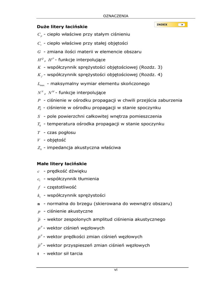 OZNACZENIA Duże litery łacińskie C p - ciepło właściwe przy stałym ciśnieniu Cv - ciepło właściwe przy stałej objętości G - zmiana ilości materii w elemencie obszaru H Q , H P - funkcje interpolujące K - współczynnik sprężystości objętościowej (Rozdz. 3) K f - współczynnik sprężystości objętościowej (Rozdz. 4) Lmax - maksymalny wymiar elementu skończonego N N , N M - funkcje interpolujące P - ciśnienie w ośrodku propagacji w chwili przejścia zaburzenia P0 - ciśnienie w ośrodku propagacji w stanie spoczynku S - pole powierzchni całkowitej wnętrza pomieszczenia T0 - temperatura ośrodka propagacji w stanie spoczynku T - czas pogłosu V - objętość Z 0 - impedancja akustyczna właściwa Małe litery łacińskie c - prędkość dźwięku c1 - współczynnik tłumienia f - częstotliwość k1 - współczynnik sprężystości n - normalna do brzegu (skierowana do wewnątrz obszaru) p - ciśnienie akustyczne ~ p - wektor zespolonych amplitud ciśnienia akustycznego p P - wektor ciśnień węzłowych p& P - wektor prędkości zmian ciśnień węzłowych &p& P - wektor przyspieszeń zmian ciśnień węzłowych t - wektor sił tarcia vi OZNACZENIA t - czas u - wektor przemieszczenia cząstki akustycznej (Rozdz. 3) u f - wektor przemieszczenia cząstki akustycznej (Rozdz. 4) ~ f -wektor zespolonych amplitud przemieszczenia cząstki akustycznej u u& f - wektor prędkości cząstki akustycznej u m - wektor przemieszczeń struktury u& M - wektor prędkości węzłowych struktury && M - wektor przyspieszeń węzłowych struktury u u N - wektor przemieszczeń węzłowych struktury v - wektor prędkości cząstki akustycznej Duże litery greckie Ω - częstość kołowa Małe litery greckie α - współczynnik pochłaniania dźwięku α c - współczynnik tłumienia α śr - średni pogłosowy współczynnik pochłaniania dźwięku β - współczynnik odbicia fali dźwiękowej β N - funkcja interpolująca δ - względne zagęszczenie ośrodka δ ij - delta Kroneckera ε , ε ij - tensor odkształcenia γ - współczynnik przenikania dźwięku (Rozdz. 5) γ - tłumienie objętościowe (Rozdz. 4) η ' - współczynnik lepkości objętościowej κ - stosunek ciepła właściwego przy stałym ciśnieniu, do ciepła właściwego przy stałej objętości λ - stała Lamé µ - stała Lamé vii OZNACZENIA µ ' - dynamiczny współczynnik tarcia wewnętrznego lepkości ϑ - względna zmiana objętości ρ - gęstość ośrodka propagacji w chwili przejścia zaburzenia ρ (t ) - gęstość akustyczna ρ 0 , ρ f - gęstość ośrodka propagacji w stanie spoczynku σ , σ ij - tensor naprężenia viii