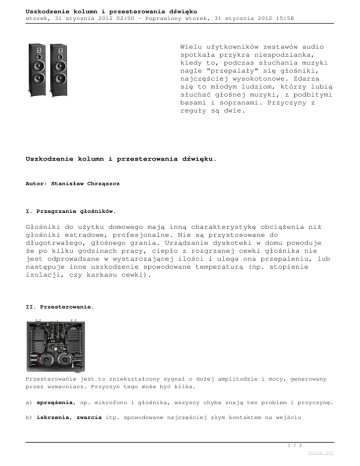 Uszkodzenie kolumn i przesterowania dźwięku wtorek, 31 stycznia 2012 02:00 - Poprawiony wtorek, 31 stycznia 2012 15:58 Wielu użytkowników zestawów audio spotkała przykra niespodzianka, kiedy to, podczas słuchania muzyki nagle "przepalały" się głośniki, najczęściej wysokotonowe. Zdarza się to młodym ludziom, którzy lubią słuchać głośnej muzyki, z podbitymi basami i sopranami. Przyczyny z reguły są dwie. Uszkodzenie kolumn i przesterowania dźwięku. Autor: Stanisław Chrząszcz I. Przegrzanie głośników. Głośniki do użytku domowego mają inną charakterystykę obciążenia niż głośniki estradowe, profesjonalne. Nie są przystosowane do długotrwałego, głośnego grania. Urządzanie dyskoteki w domu powoduje że po kilku godzinach pracy, ciepło z rozgrzanej cewki głośnika nie jest odprowadzane w wystarczającej ilości i ulega ona przepaleniu, lub następuje inne uszkodzenie spowodowane temperaturą (np. stopienie izolacji, czy karkasu cewki). II. Przesterowanie. Przesterowanie jest to zniekształcony sygnał o dużej amplitudzie i mocy, generowany przez wzmacniacz. Przyczyn tego może być kilka. a) sprzężenia, np. mikrofonu i głośnika, wszyscy chyba znają ten problem i przyczynę. b) iskrzenia, zwarcia itp. spowodowane najczęściej złym kontaktem na wejściu 1 / 2 Phoca PDF Uszkodzenie kolumn i przesterowania dźwięku wtorek, 31 stycznia 2012 02:00 - Poprawiony wtorek, 31 stycznia 2012 15:58 wzmacniacza. Są groźne przy podkręceniu potencjometru głośności wzmacniacza na maksimum. c) przesterowanie spowodowane niedopasowaniem źródeł sygnału (np. odtwarzacza czy magnetofonu) i wzmacniacza. Jeżeli źródło podaje większe (lub mniejsze) napięcie na wejście wzmacniacza niż zaleca to producent, przy niewielkim nawet podkręceniu głośności, dźwięk w głośnikach słyszymy mocno zniekształcony. Natomiast przy niskim poziomie napięcia wejściowego, podkręcamy potencjometr by uzyskać zadowalającą głośność, w związku z tym bardzo łatwo o przypadkowe przesterowanie i uszkodzenie głośników. d) przesterowanie spowodowane niedopasowaniem mocy wzmacniacza i kolumn. Każdy wzmacniacz oddaje pełną moc przy określonym położeniu gałki potencjometru. Zwykle odpowiada to 11-13 godzinie na zegarze. Musimy jednakże pamiętać o tym, że potencjometr nie jest regulatorem mocy wzmacniacza, lecz regulatorem głośności słuchanej muzyki. Moc oddawana w danej chwili przez wzmacniacz jest zależna od rodzaju muzyki. Słuchanie wokalisty z gitarą to nie to samo co słuchanie orkiestry symfonicznej czy zespołu hard rockowego! Głośne słuchanie spokojnych fragmentów utworu nie powoduje oddawania dużej mocy przez wzmacniacz, natomiast muzyka energiczna, mocna, może łatwo spowodować jego przesterowanie, czyli oddanie dużej, chwilowej mocy na kolumny i w konsekwencji przepalenie głośnika. Paradoksalnie, im słabszy jest wzmacniacz tym łatwiej wpada w przesterowanie. Jeżeli zasilamy kolumny np. 100 watowe wzmacniaczem 30 watowym, to żeby osiągnąć większe natężenie dźwięku "podkręcamy" potencjometr na maksimum. Wzmacniacz po przekroczeniu mocy 30 W łatwo wzbudza się, a w głośnikach słyszymy "charczenie" Na głośniki podawana jest znaczna moc impulsowa, która może dochodzić nawet do kilkuset W! Do wzbudzania się wzmacniacza dochodzi jeszcze szybciej jeśli podkręcimy regulatory sopranów lub basów na maksimum. Natomiast, jeżeli 100 watowe kolumny zasilamy wzmacniaczem 80 watowym, zniekształcenia występują dopiero po przekroczeniu tej mocy, (pamiętajmy, że 80 W w pomieszczeniu to bardzo dużo), w konsekwencji prawdopodobieństwo uszkodzenia głośników jest mniejsze. Ponadto, jeżeli używamy kolumn które mają dużą sprawność (np. kolumny o sprawności 89-92 dB) ryzyko uszkodzenia jest mniejsze, ponieważ do uzyskania dużych natężeń dźwięku potrzeba mniejszej mocy. Stąd słabsze wzmacniacze doskonale sobie radzą z takimi kolumnami. Jak uchronić się przed zniszczeniem głośników? Unikać sprzężeń i przesterowań. Jeżeli usłyszymy w głośniku zniekształcony dźwięk, natychmiast ściszajmy. Do głośnego słuchania muzyki używajmy tak wzmacniacza jak i kolumn odpowiedniej mocy lub konstrukcji (dyskoteka na sprzęcie profesjonalnym, przystosowanym do długotrwałych obciążeń). A co mają robić wszyscy ci którzy mają słabsze wzmacniacze? Oczywiście - cieszyć się muzyką. Lecz nie na cały regulator! 2 / 2 Phoca PDF