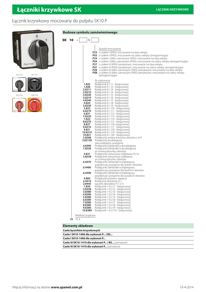 Łączniki krzywkowe SK ŁĄCZNIKI KRZYWKOWE Łącznik krzywkowy mocowany do pulpitu SK10 P Budowa symbolu zamówieniowego SK 10 - P03, P23 P04, P24 \ P23 P03 P24 P04 P27 P07 P28 P08 P07, P27 1.825 1.828 2.8211 2.8210 3.8220 3.8210 4.8240 4.824 5.8220 5.822 6.8210 6.821 7.8220 7.822 8.8270 8.827 9.8210 9.821 10.8210 10.821 3.8368 3.83139 P08, P28 4.8390 7.8538 4.831 5.8538 6.4470 6.4480 6.4490 4.883 2.4414 2.8445 1.834 2.8338 3.8380 4.8396 5.8380 6.8380 7.8380 8.8380 9.8380 10.8380 Sposób mocowania z czołem I (IP65), mocowanie na dwa wkręty z czołem I (IP65), mocowanie na cztery wkręty samogwintujące z czołem I żółto-czerwonym (IP65), mocowanie na dwa wkręty z czołem I żółto-czerwonym (IP65), mocowanie na cztery wkręty samogwintujące z czołem III (IP65) zamykanym, mocowanie na dwa wkręty z czołem III (IP65) zamykanym, mocowanie na cztery wkręty samogwintujące z czołem III żółto-czerwonym (IP65) zamykanym, mocowanie na dwa wkręty z czołem III żółto-czerwonym (IP65) zamykanym, mocowanie na cztery wkręty samogwintujące Nr wykonania Rozłącznik 0-1 (1 - biegunowy) Rozłącznik 0-1 (2 - biegunowy) Rozłącznik 0-1 (3 - biegunowy) Rozłącznik 0-1 (4 - biegunowy) Rozłącznik 0-1 (5 - biegunowy) Rozłącznik 0-1 (6 - biegunowy) Rozłącznik 0-1 (7 - biegunowy) Rozłącznik 0-1 (8 - biegunowy) Rozłącznik 0-1 (9 - biegunowy) Rozłącznik 0-1 (10 - biegunowy) Rozłącznik 0-1 (11 - biegunowy) Rozłącznik 0-1 (12 - biegunowy) Rozłącznik 0-1 (13 - biegunowy) Rozłącznik 0-1 (14 - biegunowy) Rozłącznik 0-1 (15 - biegunowy) Rozłącznik 0-1 (16- biegunowy) Rozłącznik 0-1 (17 - biegunowy) Rozłącznik 0-1 (18 - biegunowy) Rozłącznik 0-1 (19 - biegunowy) Rozłącznik 0-1 (20 - biegunowy) Przełącznik zmiany kierunku obrotów L-0-P Przełącznik dwubiegowy dwa oddzielne uzwojenia Przełącznik Dahlander'a dwubiegowy Przełącznik Dahlander'a dwubiegowy ze zmianą kierunku obrotów Przełącznik rozruchowy trójfazowy 0-Y-∆ Przełącznik rozruchowy trójfazowy ze zmianą kierunku obrotów Przełącznik Dahlander'a trójbiegowy pojedyncze uzwojenie dla niskich obrotów Przełącznik Dahlander'a trójbiegowy pojedyncze uzwojenie dla średnich obrotów Przełącznik Dahlander'a trójbiegowy pojedyncze uzwojenie dla wysokich obrotów Przełącznik pomiaru napięcia Rozłącznik obrotowy 0-1 Łącznik obwodów 0-1-2-3 Rozłącznik 1-0-2 (1 - biegunowy) Rozłącznik 1-0-2 (2 - biegunowy) Rozłącznik 1-0-2 (3 - biegunowy) Rozłącznik 1-0-2 (4 - biegunowy) Rozłącznik 1-0-2 (5 - biegunowy) Rozłącznik 1-0-2 (6 - biegunowy) Rozłącznik 1-0-2 (7 - biegunowy) Rozłącznik 1-0-2 (8 - biegunowy) Rozłącznik 1-0-2 (9 - biegunowy) Rozłącznik 1-0-2 (10 - biegunowy) Wielkość prądowa 10 10 A Elementy składowe Czoła łączników krzywkowych Czoło I SK10-1406 dla wykonań P... i BS... Czoło I SK10-1406 dla wykonań P... Czoło III SK10-1410 dla wykonań P... i BS…(zamykane) Czoło III SK10-1410 dla wykonań P…(zamykane) Więcej informacji na stronie www.spamel.com.pl 19-4-2014 Łączniki krzywkowe SK ŁĄCZNIKI KRZYWKOWE Wymiary 1...3 1) 2) 4 otw. ø3.8 8 8 32 12 2 otw. ø4.5 31 44 x 41 ø8 ø8 36 Rozstaw otworów mocujących dla wykonania: 1) P03, P04, P07, P08 (na 4 wkręty samogwintujące) 2) P23, P24, P27, P28 (na 2 wkręty) 48 L Liczba segmentów 1 2 3 4 5 6 7 8 9 10 L [mm] 28 36 44 52 60 68 76 84 92 100 Liczba segmentów w łączniku 1 ... 10 Dane techniczne Napięcie znamionowe izolacji Ue Napięcie znamionowe udarowe wytrzymywalne Uimp Prąd znamionowy ciągły Iu=Ith Prąd znamieniowy łączeniowy Ie w kat. AC-21A, AC-22A Znamionowa moc łączeniowa Pe w kat. AC-23A Znamionowa moc łączeniowa Pe w kat. AC-3 Prąd znamionowy łączeniowy Ie w kat. DC-21A Prąd znamionowy krótkotrwały wytrzymywalny Icw(1s) Prąd znamionowy załączalny zwarciowy Icm Prąd znamionowy zwarciowy umowny Prąd znamionowy wkładka bezpiecznikowa gG Przekrój przewodów przyłączeniowych Moment dokręcania zacisków Mocowanie łącznika do pulpitu Trwałość mechaniczna Temperatura otoczenia Stopień ochrony: PN-EN 60529 względem pulpitu Stopień ochrony obudowy OB Odporność na wibrację (wg IEC 60068-2-6) Odporność na udary (wg IEC 60068-2-27) Odporność na wilgotne gorąco cykliczne (IEC 60068-2-30) Odporność na mgłę solną cykliczną (wg IEC 60068-2-52) Więcej informacji na stronie www.spamel.com.pl 690 V 6 kV 16 A 10 A (230/400/500/690 V) 2 kW (230 V) 4 kW (400 V) 5 kW (500 V) 6 kW (690 V) 1,5 kW (230 V) 3 kW (400 V) 3,5 kW (500 V) 5 kW (690 V) 10 A (24 V) 6 A (110 V) 5 A (220 V) 0,25 kA 0,34 kA 10 kA 10 A 1...4 mm² 0,5 Nm 31/□36 3,0 mln (cykli przestawieniowych) -40 ... +70°C (pracy) -40 ... +70°C (przechowywania) IP65 IP65 2...13, 2...100 Hz (częstotliwość) ± 1 mm (amplituda przemieszczenia) ± 0,7 g (amplituda przyspieszenia) 15 g (przyspieszenie szczytowe) 11 ms (czas trwania impulsu) 55°C (temperatura otoczenia) 95% (wilgotność względna) ostrość próby 1 19-4-2014