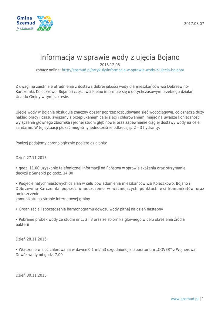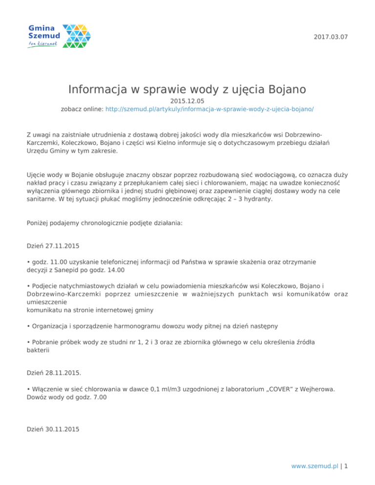 Informacja w sprawie wody z ujęcia Bojano