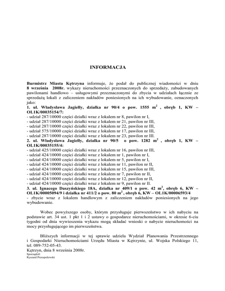INFORMACJA Burmistrz Miasta Kętrzyna informuje, Ŝe podał do publicznej wiadomości w dniu 8 września 2008r. wykazy nieruchomości przeznaczonych do sprzedaŜy, zabudowanych pawilonami handlowo – usługowymi przeznaczonymi do zbycia w udziałach łącznie ze sprzedaŜą lokali z zaliczeniem nakładów poniesionych na ich wybudowanie, oznaczonych jako: 1. ul. Władysława Jagiełły, działka nr 90/4 o pow. 1555 m2 , obręb 1, KW – OL1K/00035154/7: - udział 287/10000 części działki wraz z lokalem nr 8, pawilon nr I, - udział 287/10000 części działki wraz z lokalem nr 21, pawilon nr III, - udział 287/10000 części działki wraz z lokalem nr 22, pawilon nr III, - udział 575/10000 części działki wraz z lokalem nr 17, pawilon nr III, - udział 287/10000 części działki wraz z lokalem nr 23, pawilon nr III. 2. ul. Władysława Jagiełły, działka nr 90/5 o pow. 1282 m2 , obręb 1, KW – OL1K/00035155/4: - udział 425/10000 części działki wraz z lokalem nr 16, pawilon nr III, - udział 424/10000 części działki wraz z lokalem nr 1, pawilon nr I, - udział 424/10000 części działki wraz z lokalem nr 5, pawilon nr I, - udział 424/10000 części działki wraz z lokalem nr 11, pawilon nr II, - udział 424/10000 części działki wraz z lokalem nr 15, pawilon nr III, - udział 424/10000 części działki wraz z lokalem nr 7, pawilon nr II, - udział 424/10000 części działki wraz z lokalem nr 12, pawilon nr II, - udział 424/10000 części działki wraz z lokalem nr 9, pawilon nr II. 3. ul. Ignacego Daszyńskiego 18A, działka nr 409/1 o pow. 42 m2, obręb 6, KW – OL1K/00005094/9 i działka nr 411/2 o pow. 80 m2 , obręb 6, KW – OL1K/00006593/4 - zbycie wraz z lokalem handlowym z zaliczeniem nakładów poniesionych na jego wybudowanie. Wobec powyŜszego osoby, którym przysługuje pierwszeństwo w ich nabyciu na podstawie art. 34 ust. 1 pkt 1 i 2 ustawy o gospodarce nieruchomościami, w okresie 6-ciu tygodni od dnia wywieszenia wykazu mogą składać wnioski o nabycie nieruchomości na mocy przysługującego im pierwszeństwa. BliŜszych informacji w tej sprawie udziela Wydział Planowania Przestrzennego i Gospodarki Nieruchomościami Urzędu Miasta w Kętrzynie, ul. Wojska Polskiego 11, tel. 089-752-05-43. Kętrzyn, dnia 8 września 2008r. Sporządził: Ryszard Przespolewski