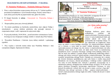 OGŁOSZENIA DUSZPASTERSKIE - 17.04.2016r. IV Niedziela Wielkanocy - Niedziela Dobrego Pasterza 1. Wraz z całym Kościołem rozpoczynamy dziś po raz 53. Tydzień modlitw o powołania do kapłaństwa i życia konsekrowanego. Prośmy zatem Pana o tych, którzy pozwolą Mu się poprowadzić tam, gdzie On zechce. 2. W liturgii Kościoła: w sobotę - Uroczystość św. Wojciecha, biskupa i męczennika. 3. Rozpoczęliśmy prace przy elewacji plebanii. 4. Na stronie parafialnej na facebooku umieściliśmy stare zdjęcia Chałup i mieszkańców - proszę młodsze pokolenie, aby pomogło starszym w rozpoznaniu miejsc i osób i zapraszam do opisywania zdjęć. 5. W przyszłą niedzielę, 24.04.2016r., przed kościołem wolontariusze Caritas kwestują na rzecz hospicjum rozdając żonkile w ramach akcji Pola Nadziei. 6. Wszystkim Parafianom i Gościom życzę dobrej niedzieli i spokojnego tygodnia. 7. Przy wyjściu z kościoła można nabyć nasz Parafialny Biuletyn i inne czasopisma religijne. Zapraszam do lektury. Biuletyn Parafialny Parafii p.w. Św. Anny w Chałupach Redakcja: Ks. Proboszcz Piotr Lewańczyk Chałupy, 17.04.2016 r. Rok VII, Numer 348 IV Niedziela Wielkanocy (16) Rzymskokatolicka Parafia p.w. św. Anny, CHAŁUPY, ul. Kaperska 30, 84-120 Władysławowo, Tel.: 507-032-544, e-mail: [email protected] Konto naszej Parafii: Nr rachunku: 75-8348-0003-0000-0014-3316-0003 Adres strony internetowej: http://chalupy.diecezja.gda.pl/ „Ja i Ojciec jedno jesteśmy”. (J 10,30) Wędrując duchowo przez okres wielkanocny, widzimy jak zmartwychwstanie Chrystusa przynosi owoce w życiu konkretnych ludzi, jak zmienia jakość ich życia, jak przekształca ich wzajemne relacje. To jest odpowiedź na wątpliwość, która może się rodzić w sercu każdego człowieka: czy zmartwychwstanie zmieniło coś w świecie, w życiu ludzi na ziemi? Jednak dzisiejsza Liturgia Słowa wprowadza jeszcze coś innego: ten, kto wierzy w zmartwychwstanie, nie tylko odmienia swoje życie tu na ziemi, ale także może liczyć na nieskończoną perspektywę życia i szczęścia wiecznego. Zyskuje nową nadzieję, której nic i nikt nie może mu odebrać. Czytania liturgii wielkanocnej podkreślają radość i odwagę tych, którzy uwierzyli i głosili prawdę o zmartwychwstaniu. Tak należy rozumieć niezachwianą odwagę Pawła i Barnaby po wyrzuceniu ich z miasta, jak również dzisiejszy apokaliptyczny opis tych, którzy w niebie stoją przed Barankiem: oni wszyscy, chociaż przychodzą z wielkiego ucisku i opłukiwali swe szaty we krwi Baranka (tzn. walczyli z grzechem, oczyszczając się w sakramencie pokuty), dostępują teraz nieskończonego szczęścia. W ten sam ton uderza dzisiejsza Ewangelia, przytaczając zapewnienie Chrystusa, że tych, których On umiłował i wybrał, nikt i nic nie jest w stanie „wyrwać z Jego ręki”. Nabierzmy więc odwagi i pewności, że Bóg — poprzez zmartwychwstanie — zawarł z nami przymierze, którego nigdy nie cofnie. I żadna siła nie jest w stanie tego zmienić. Powołani do miłosierdzia. „Idź i ty czyń podobnie…”./Łk 10,37/ INTENCJE MSZALNE 17.04 - 24.04.2016 r. Dobry Pasterz nie idzie za owcami, ale owce idą za pasterzem. A dlaczego owce idą za pasterzem? Owce idą za pasterzem, ponieważ Go znają. Za obcym nie pójdą. Znają jego głos, zapach, wiedzą, jak wygląda. I można się nawet nieco zastanawiać, jak to jest, że całe stado owiec idzie po górach i dolinach, prowadzone tylko przez jednego pasterza? Owce to potrafią i rzeczywiście dobrze na tym wychodzą, a my, ludzie? Czy w naszych czasach owce znają Jezusa, Dobrego Pasterza? Znają i nawet bardzo często chcą iść za Nim. Zresztą inaczej by nas tutaj w tej świątyni dzisiaj nie było. Ale patrzymy też z niepokojem, że przybywa takich, co już Chrystusa, Dobrego Pasterza nie znają. Wystarczy stanąć na ulicy i zadać przechodniom proste pytanie związane z Ewangelią, wiarą, i widać jak na dłoni, że są tacy, którzy nie znają ani Pasterza, ani jego owczarni. Poszli za innymi pasterzami, którzy im naobiecywali, może nawet raj na ziemi, gdy na nich zagłosują, gdy będą myśleli tak, jak oni. Moje owce słuchają mego głosu, a Ja znam je. Idą one za Mną i Ja daję im życie wieczne. Wspaniała nagroda za wierność Jezusowi. Który z tych pseudopasterzy może zagwarantować swoim owcom życie wieczne? Za kilkanaście minut usłyszymy słowa: Oto Baranek Boży, który gładzi grzechy świata. Pasterz, który sam staje się barankiem, ofiaruje swoje życie za owce, gładzi ich grzechy. Który inny pasterz tak potrafi? Dzisiejsza niedziela Dobrego Pasterza rozpoczyna też tydzień modlitw o powołania. To kapłan każdego dnia trzyma w rękach Ciało Chrystusa i mówi: Oto Baranek Boży… Módlmy się też o nowe powołania kapłańskie, aby nie brakowało nam tych, którzy będą nas karmić Słowem Bożym i Najświętszym Ciałem Chrystusa. Obyśmy wszyscy mogli iść za Jezusem Dobrym Pasterzem, a wtedy jak On sam mówi, nic nie wyrwie nas z ręki naszego Ojca, bo Pan jest naszym pasterzem. 9:00 IV Niedziela Wielkanocy 17.04.2016 + za Agnieszkę , Leona , Edmunda i Ryszarda 11:00 + za rodziców: Rozalię i Alojzego oraz Annę i SUMA Witolda 17:00 + za dusze w czyśćcu cierpiące Wtorek 19.04.2016 8:00 + za Erykę Trendel – miesiąc po pogrzebie Środa 20.04.2016 17:00 17:00 +za rodziców: Janinę i Franciszka O zdrowie dla brata Czwartek 21.04.2016 8:00 O pokój duszy i ciała 17:00 + za Teresę i Alojzego Jeka 17:00 + za Wojciecha 9:00 + za męża Stanisława – 3 rocznica Poniedziałek 18.04.2016 Piątek 22.04.2015 Sobota Św.Wojciecha 23.04.2016 V Niedziela Wielkanocy 24.04.2016 11:00 SUMA + za ojców: Józefa , Bronisława i Walentego Święty Wojciech, biskup i męczennik - główny patron Polski Wojciech urodził się ok. 956 roku w możnej rodzinie Sławnikowiców w Lubicach (Czechy). Jego ojciec, Sławnik, był głową możnego rodu, spokrewnionego z