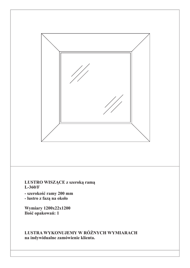 LUSTRO WISZ¥CE z szerok¹ ram¹ L-360/F - szerokoœæ ramy 200 mm - lustro z faz¹ na oko³o Wymiary 1200x22x1200 Iloœæ opakowañ: 1 LUSTRA WYKONUJEMY W RÓ¯NYCH WYMIARACH na indywidualne zamówienie klienta.