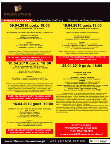 09.04.2010 godz. 19:00 18.04.2010 godz.18.00 Sala Koncertowa Filharmonii Sala Koncertowa Filharmonii MISTRZOWSKI PROGRAM: SALZBURG, WIEDEŃ I ŚPIEWACZKA ORKIESTRA SMYCZKOWA I ALTÓWKA SOLO Zbigniew Pilch dyrygent Marzena Lubaszka sopran Orkiestra Filharmonii Wrocławskiej Ernst Kovacic dyrygent Michał Micker altówka Wrocławska Orkiestra Kameralna „Leopoldinum” program: W. A. Mozart – 3 Divertimenti L. van Beethoven – Arie z Ah! Perfidio F. Schubert – Symfonia nr 5 B-dur program: T. Takemitsu – A Way a Lone na smyczki A. Schnittke – Monolog na altówkę i orkiestrę smyczkową A. Pärt – Festina lente; For Lenart in memoriam A. Tcherepnin – Serenada op. 97 Podczas tego wieczoru usłyszymy mistrzowski i bardzo atrakcyjny program! Solo wystąpi niezwykła śpiewaczka polska Marzena Lubaszka a całość poprowadzi Zbigniew Pilch. . Jest to wyjątkowy program i wyjątkowi kompozytorzy, których dzieła dość rzadko słyszymy w polskich salach koncertowych. BILETY PRACOWNIKÓW AKADEMII WYCH. FIZ. W CENIE PROMOCYJNEJ 20 zł BILETY DLA PRACOWNIKÓW AKADEMII WYCH. FIZ. W PROMOCYJNEJ CENIE 20 zł 10.04.2010 godz. 18:00 Sala Koncertowa Filharmonii GENI AL N A ODSŁO N A M UZYKI S ALONOW EJ Ursula Smith w iolonczela Lutosław ski Quart et W rocław 25.04.2010 godz. 18:00 Oratorium Marianum VIVA VIVALDI! program: W. A. Mozart – Kwartet smyczkowy d moll KV 421 F. Schubert – Kwintet wiolonczelowy C-dur op. 163 Podczas tego koncertu zespół zaprezentuje Kwintet smyczkowy C-dur op. 163 Franza Schuberta. Dzieło to zostało ukończone, niespełna dwa miesiące przed śmiercią kompozytora, a wykonane było po raz pierwszy dopiero w 1850 r. Melancholijny i smutny nastrój części drugiej kwintetu sprawia, Ŝe utwór stał się popularny jako tło muzyczne dla refleksyjnych lub nocnych scen w filmach. BILETY DLA PRACOWNIKÓW AKADEMII WYCH. FIZYCZNEGO W PROMOCYJNEJ CENIE 10 zł 16.04.2010 godz. 19:00 NIEMIECCY GIGANCI – BRAHMS Z HAMBURGA, STRAUSS Z MONACHIUM Marek Pijarowski dyrygent Krzysztof Jakowicz skrzypce Marcin Zdunik wiolonczela Orkiestra Filharmonii Wrocławskiej program: J. Brahms – Koncert podwójny a-moll na skrzypce i wiolonczelę R. Strauss – śycie bohatera op. 40 (Partia solowa Radosław Pujanek) BILETY DLA PRACOWNIKÓW AKADEMII WYCH. FIZYCZNEGO W PROMOCYJNEJ CENIE 20 zł Wrocławska Orkiestra Barokowa Jarosław Thiel wiolonczela, kierownictwo artystyczne program: Koncert na czworo skrzypiec op.3/7 F-dur RV 567 Koncert na dwie wiolonczele g-moll RV 531 Koncert kameralny na flet, obój, skrzypce, wiolonczelę i Bc. RV 90 D-dur Koncert na flet i orkiestrę „La Notte” g-moll RV 439 Koncert na obój i skrzypce B-dur RV 548 Koncert na czworo skrzypiec op. 3/10 h-moll RV 580 Anegdota mówi, Ŝe Antonio Vivaldi napisał Cztery pory roku i około sześćset wariacji na temat tej kompozycji. Faktem jest, Ŝe był on bardzo płodnym kompozytorem, a niemal wszystkie jego dzieła są równie udane. Choć za Ŝycia cieszył się duŜą popularnością, to po śmierci jego dokonania uległy zapomnieniu. Dopiero badania osiemnastu transkrypcji koncertów na róŜne instrumenty Vivaldiego, które opracował na klawesyn J. S. Bach, doprowadziło do obudzenia zainteresowania tym twórcą wśród muzykologów i rozpoczęcia badań w poszukiwaniu innych utworów Vivaldiego. Podczas wieczoru usłyszymy Wrocławską Orkiestrę Barokową, która zaprezentuje kilka koncertów Vivaldiego na róŜne instrumenty. Partie solowe wykonają soliści Orkiestry: Zbigniew Pilch, Marek Niewiedział, Jarosław Thiel i inni. Zapraszamy serdecznie do wysłuchania wspaniałej i niezwykle wdzięcznej muzyki barokowej! BILETY 25.04.2010 W PROMOCYJNEJ CENIE 20 ZŁ 71 791 100/71 342 24 59 [email protected]