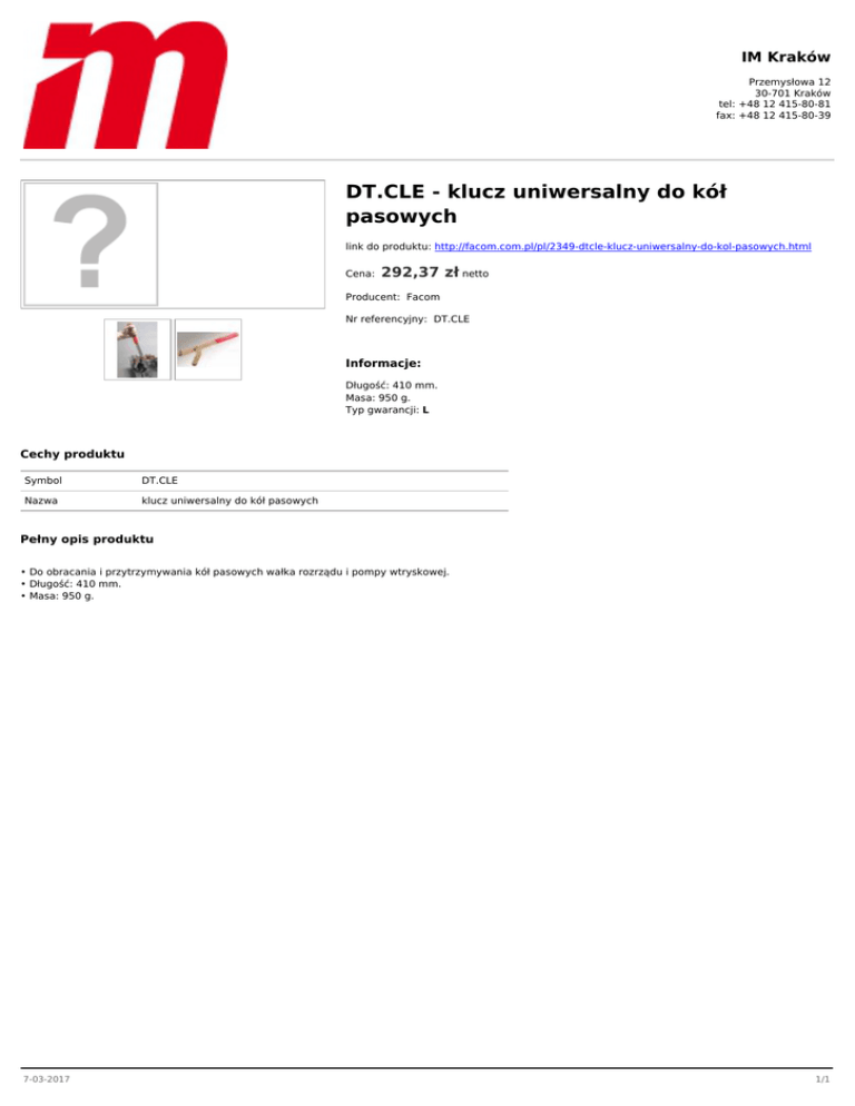 IM Kraków Przemysłowa 12 30-701 Kraków tel: +48 12 415-80-81 fax: +48 12 415-80-39 DT.CLE - klucz uniwersalny do kół pasowych link do produktu: http://facom.com.pl/pl/2349-dtcle-klucz-uniwersalny-do-kol-pasowych.html Cena: 292,37 zł netto Producent: Facom Nr referencyjny: DT.CLE Informacje: Długość: 410 mm. Masa: 950 g. Typ gwarancji: L Cechy produktu Symbol DT.CLE Nazwa klucz uniwersalny do kół pasowych Pełny opis produktu • Do obracania i przytrzymywania kół pasowych wałka rozrządu i pompy wtryskowej. • Długość: 410 mm. • Masa: 950 g. 7-03-2017 1/1