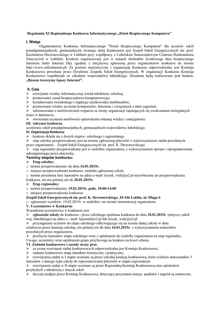 Regulamin XI Regionalnego Konkursu Informatycznego „Dzień Bezpiecznego Komputera” I. Wstęp Organizatorem Konkursu Informatycznego "Dzień Bezpiecznego Komputera" dla uczniów szkół ponadgimnazjalnych, gimnazjalnych zwanego dalej Konkursem jest Zespół Szkół Energetycznych im. prof. Kazimierza Drewnowskiego w Lublinie przy współpracy z Lubelskim Samorządowym Centrum Doskonalenia Nauczycieli w Lublinie. Konkurs organizowany jest w ramach obchodów światowego dnia bezpiecznego Internetu Safer Internet Day zgodnie z inicjatywą zgłoszoną przez organizatorów konkursu na stronie http://www.saferinternet.pl/ Za poziom merytoryczny i organizację Konkursu odpowiedzialna jest Komisja Konkursowa powołana przez Dyrektora Zespołu Szkół Energetycznych. W organizacji Konkursu Komisja Konkursowa współdziała ze szkołami województwa lubelskiego. Działania będą realizowane pod hasłem: „Razem tworzymy lepszy Internet”. II. Cele rozwijanie wiedzy informatycznej wśród młodzieży szkolnej, promowanie zasad bezpieczeństwa komputerowego, kształtowanie świadomego i mądrego użytkownika multimediów, promowanie wiedzy na temat komputerów, Internetu i związanych z nimi zagrożeń, informowanie o możliwościach wsparcia ze strony organizacji zajmujących się zwalczaniem nielegalnych treści w Internecie, stworzenie uczniom możliwości sprawdzenia własnej wiedzy i umiejętności. III. Adresaci konkursu uczniowie szkół ponadgimnazjalnych, gimnazjalnych województwa lubelskiego. IV. Organizacja Konkursu konkurs składa się z dwóch etapów: szkolnego i regionalnego. etap szkolny przeprowadzany jest na terenie zgłoszonej placówki z wykorzystaniem zadań przesłanych przez organizatora – Zespół Szkół Energetycznych im. prof. K. Drewnowskiego. etap regionalny przeprowadzany jest w siedzibie organizatora, z wykorzystaniem sprzętu i oprogramowania udostępnionego przez placówkę. Terminy etapów konkursu: Etap szkolny: o termin przeprowadzenia: do dnia 16.01.2015r. o miejsce przeprowadzenia konkursu: siedziba zgłoszonej szkoły o termin przesłania listy laureatów na adres e-mail: [email protected] niezwłocznie po przeprowadzeniu konkursu, ale nie później niż do 20.01.2015r. Etap regionalny: o termin przeprowadzenia: 19.02.2015r. godz. 10:00-14:00 o miejsce przeprowadzenia konkursu: Zespół Szkół Energetycznych im. prof. K. Drewnowskiego, 20-346 Lublin, ul. Długa 6 o ogłoszenie wyników: 19.02.2015r. w siedzibie i na stronie internetowej organizatora. V. Uczestnictwo w Konkursie Warunkiem uczestnictwa w konkursie jest: zgłoszenie szkoły do konkursu - przez szkolnego opiekuna konkursu do dnia 10.01.2015r. (dotyczy szkół woj. lubelskiego) na adres e - mail: [email protected] lub [email protected] przystąpienie uczniów do etapu szkolnego odbywającego się na terenie danej szkoły w dniu ustalonym przez komisję szkolną, nie później niż do dnia 16.01.2015r. z wykorzystaniem materiałów przesłanych przez organizatora. przybycie laureatów etapu szkolnego wraz z opiekunem do siedziby organizatora na etap regionalny. Uwaga: uczestnicy wraz opiekunem grupy przybywają na konkurs na koszt własny. VI. Zadania konkursowe i zasady oceny prac za ocenę rozwiązań zadań konkursowych odpowiedzialna jest Komisja Konkursowa, zadania konkursowe mają charakter teoretyczny i praktyczny, rozwiązania zadań w I etapie oceniane są przez szkolną komisję konkursową, która wybiera maksymalnie 3 laureatów z danego typu szkoły do reprezentowania placówki w etapie regionalnym rozwiązania zadań w II etapie oceniane są przez Regionalną Komisję Konkursową oraz opiekunów przybyłych z młodzieżą z innych szkół decyzje podjęte przez Komisję Konkursową, dotyczące przyznania miejsc, punktów i nagród są ostateczne, w kwestiach nieobjętych niniejszym regulaminem sytuacje sporne rozstrzyga Przewodniczący Komisji Konkursowej. VII. Komisja Konkursowa Do zadań Regionalnej Komisji Konkursowej należą: opracowanie zadań konkursowych, przygotowanie zawodów od strony organizacyjnej i technicznej, ocena prac konkursowych etapu regionalnego konkursu i wyłonienie zwycięzców, powiadomienie uczestników o wynikach, zabezpieczenie tajności materiałów konkursowych i samodzielności pracy uczniów w trakcie zawodów finałowych, wydanie uczestnikom zaświadczeń o udziale w Konkursie i zdobytym miejscu. VIII. Wyróżnienia i nagrody Na podstawie wyników etapu regionalnego Komisja Konkursowa wyłania laureatów i wyróżnionych finalistów, dla najlepszych uczestników konkursu przewidziane są dyplomy i nagrody, dla uczestników II etapu, którzy nie zostali laureatami, opiekunów przygotowujących młodzież do II etapu i szkół biorących udział w etapie regionalnym przewidziane są zaświadczenia o udziale w konkursie. Doradca metodyczny nauczycieli informatyki i przedmiotów informatycznych miasta Lublin