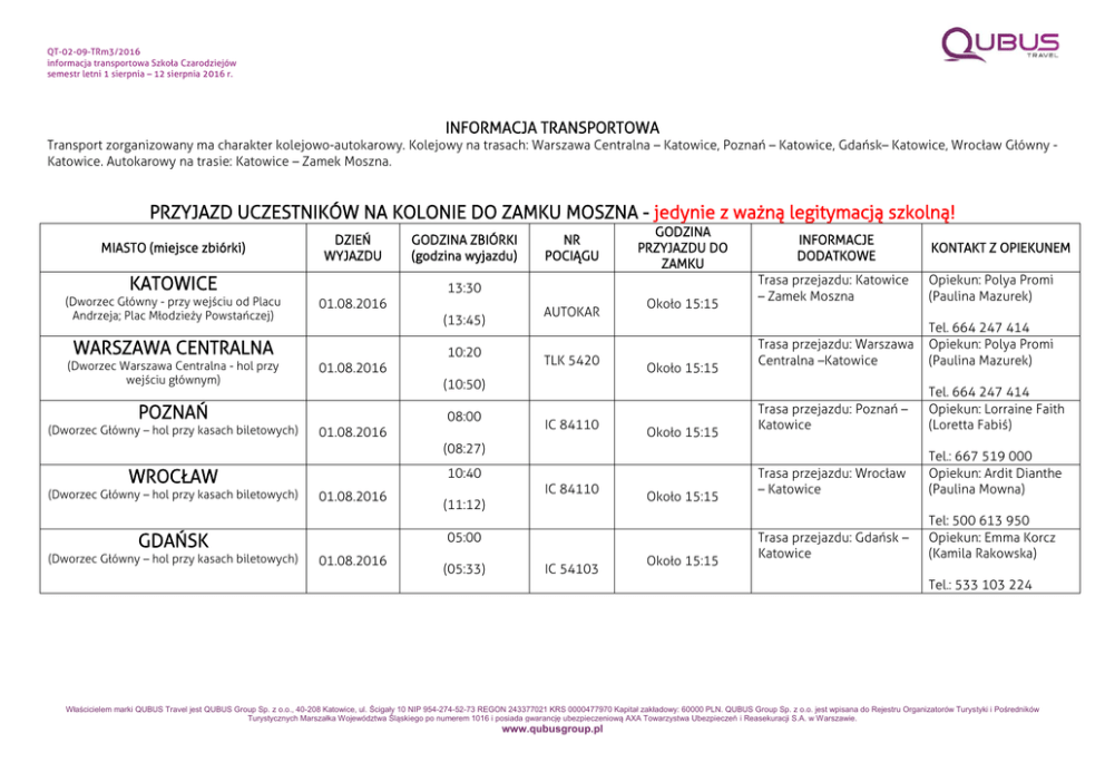 QT-02-09-TRm3/2016 informacja transportowa Szkoła Czarodziejów semestr letni 1 sierpnia – 12 sierpnia 2016 r. INFORMACJA TRANSPORTOWA Transport zorganizowany ma charakter kolejowo-autokarowy. Kolejowy na trasach: Warszawa Centralna – Katowice, Poznań – Katowice, Gdańsk– Katowice, Wrocław Główny Katowice. Autokarowy na trasie: Katowice – Zamek Moszna. PRZYJAZD UCZESTNIKÓW NA KOLONIE DO ZAMKU MOSZNA - jedynie z ważną legitymacją szkolną! MIASTO (miejsce zbiórki) DZIEŃ WYJAZDU KATOWICE (Dworzec Główny - przy wejściu od Placu Andrzeja; Plac Młodzieży Powstańczej) 01.08.2016 (13:45) 10:20 01.08.2016 GODZINA PRZYJAZDU DO ZAMKU AUTOKAR TLK 5420 Około 15:15 Około 15:15 INFORMACJE DODATKOWE 08:00 01.08.2016 IC 84110 Około 15:15 Opiekun: Polya Promi (Paulina Mazurek) Trasa przejazdu: Warszawa Centralna –Katowice Tel. 664 247 414 Opiekun: Polya Promi (Paulina Mazurek) Trasa przejazdu: Poznań – Katowice Tel. 664 247 414 Opiekun: Lorraine Faith (Loretta Fabiś) Trasa przejazdu: Wrocław – Katowice Tel.: 667 519 000 Opiekun: Ardit Dianthe (Paulina Mowna) Trasa przejazdu: Gdańsk – Katowice Tel: 500 613 950 Opiekun: Emma Korcz (Kamila Rakowska) (08:27) 10:40 WROCŁAW (Dworzec Główny – hol przy kasach biletowych) 01.08.2016 Około 15:15 05:00 GDAŃSK (Dworzec Główny – hol przy kasach biletowych) IC 84110 (11:12) 01.08.2016 (05:33) IC 54103 Około 15:15 KONTAKT Z OPIEKUNEM Trasa przejazdu: Katowice – Zamek Moszna (10:50) POZNAŃ (Dworzec Główny – hol przy kasach biletowych) NR POCIĄGU 13:30 WARSZAWA CENTRALNA (Dworzec Warszawa Centralna - hol przy wejściu głównym) GODZINA ZBIÓRKI (godzina wyjazdu) Tel.: 533 103 224 Właścicielem marki QUBUS Travel jest QUBUS Group Sp. z o.o., 40-208 Katowice, ul. Ścigały 10 NIP 954-274-52-73 REGON 243377021 KRS 0000477970 Kapitał zakładowy: 60000 PLN. QUBUS Group Sp. z o.o. jest wpisana do Rejestru Organizatorów Turystyki i Pośredników Turystycznych Marszałka Województwa Śląskiego po numerem 1016 i posiada gwarancję ubezpieczeniową AXA Towarzystwa Ubezpieczeń i Reasekuracji S.A. w Warszawie. www.qubusgroup.pl QT-02-09-TRm3/2016 informacja transportowa Szkoła Czarodziejów semestr letni 1 sierpnia – 12 sierpnia 2016 r. INFORMACJA TRANSPORTOWA Transport zorganizowany ma charakter kolejowo-autokarowy. Kolejowy na trasach: Katowice – Warszawa Centralna, Katowice – Poznań Główny, Katowice – Gdańsk Główny, Katowice - Wrocław. Autokarowy na trasie: Zamek Moszna – Katowice. POWRÓT UCZESTNIKÓW Z KOLONII - jedynie z ważną legitymacją szkolną! MIASTO DOCELOWE (odbiór uczestnika) DZIEŃ POWROTU GODZINA PRZYJAZDU (odbiór uczestnika) NR POCIĄGU GODZINA WYJAZDU Z ZAMKU KATOWICE (Dworzec Główny - przy wejściu od Placu Andrzeja; Plac Młodzieży Powstańczej) 12.08.2016 12:00 WARSZAWA CENTRALNA (Dworzec Warszawa Centralna - hol przy wejściu głównym) 12.08.2016 17:00 Autokar TLK 4520 (KORMORAN) 10:00 10:00 POZNAŃ (Dworzec Główny – hol przy kasach biletowych) 12.08.2016 WROCŁAW (Dworzec Główny – hol przy kasach biletowych) 12.08.2016 20:03 17:26 IC 48111 IC 48111 10:00 10:00 GDAŃSK (Dworzec Główny – hol przy kasach biletowych) 12.08.2016 23:12 IC 45103 10:00 INFORMACJE DODATKOWE KONTAKT Z OPIEKUNEM Trasa przejazdu: Zamek Moszna – Katowice Opiekun: Polya Promi (Paulina Mazurek) Trasa przejazdu: Katowice – Warszawa Centralna Tel. 664 247 414 Opiekun: Polya Promi (Paulina Mazurek) Trasa przejazdu: Katowice – Poznań Główny Tel. 664 247 414 Opiekun: Lorraine Faith (Loretta Fabiś) Trasa przejazdu: Wrocław – Katowice Tel.: 667 519 000 Opiekun: Emma Korcz (Kamila Rakowska) Trasa przejazdu: Katowice Gdańsk Tel.: 533 103 224 Opiekun: Flavio Polo (Piotr Mikler) Tel.: 693 359 636 Właścicielem marki QUBUS Travel jest QUBUS Group Sp. z o.o., 40-208 Katowice, ul. Ścigały 10 NIP 954-274-52-73 REGON 243377021 KRS 0000477970 Kapitał zakładowy: 60000 PLN. QUBUS Group Sp. z o.o. jest wpisana do Rejestru Organizatorów Turystyki i Pośredników Turystycznych Marszałka Województwa Śląskiego po numerem 1016 i posiada gwarancję ubezpieczeniową AXA Towarzystwa Ubezpieczeń i Reasekuracji S.A. w Warszawie. www.qubusgroup.pl QT-02-09-TRm3/2016 informacja transportowa Szkoła Czarodziejów semestr letni 1 sierpnia – 12 sierpnia 2016 r. INFORMACJA TRANSPORTOWA dla transportu własnego Rodzica PRZYWÓZ UCZESTNIKA NA KOLONIE DO ZAMKU 01.08.2016 od godziny 13:00 do godziny 14:00 ODBIÓR UCZESTNIKA Z KOLONII 12.08.2016 od godziny 08:30 do godziny 09:30 INFORMACJE OGÓLNE 1. Turnus rozpoczyna się obiadem 01.08.2016 r. około godziny 16:00, a kończy śniadaniem 12.08.2016 r. o godzinie 08:00. 2. Kierownikiem turnusu jest Jolanta Jarosz-Jędrzejak, nr kontaktowy (nr tel. 609 766 075). 3. Wychowawcami w czasie wypoczynku są: Aleksiej Jakosma (Ziemowit Winiecki), Polya Promi (Paulina Mazurek), Emma Korcz (Kamila Rakowska), Flavio Polo (Piotr Mikler), Lorraine Faith (Loretta Fabiś). 4. We wszelkich sprawach dot. organizacji kolonii, uczestników, zakwaterowania itp. można kontaktować się wyłącznie z kierownikiem wypoczynku, najlepiej w godzinach: 09:30 - 10:30; 13:30 - 15:00; 18:45 - 19:30. 5. Uczestnicy korzystający z transportu organizatora mają obowiązek posiadania ważnej legitymacji szkolnej. 6. Prosimy o punktualne przybycie na miejsce zbiórki w czasie transportu w dniu 01.08.2016 na kolonie oraz o punktualne przybycie na miejsce odebrania uczestnika w dniu 12.08.2016 r. 7. Telefony do opiekunów transportu oraz kierownika turnusu, zawarte w poniższej informacji, są aktywne od 31 lipca 2016 r. 8. Odpowiedzi na nurtujące Państwa pytania, prosimy odnaleźć w strefie dla rodzica na stronie www.queverton.pl lub dzwonić do biura obsługi 728 66 33 23 (pn. - pt. w godzinach 09:00 - 16:30). Właścicielem marki QUBUS Travel jest QUBUS Group Sp. z o.o., 40-208 Katowice, ul. Ścigały 10 NIP 954-274-52-73 REGON 243377021 KRS 0000477970 Kapitał zakładowy: 60000 