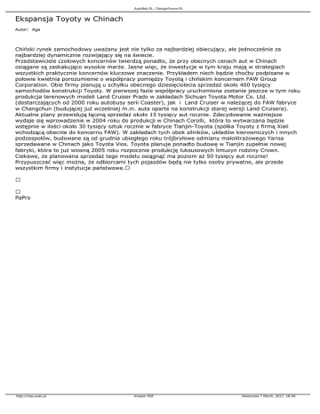 AutoRok.PL / DesignForum.PL Ekspansja Toyoty w Chinach Autor: Aga Chiński rynek samochodowy uważany jest nie tylko za najbardziej obiecujący, ale jednocześnie za najbardziej dynamicznie rozwijający się na świecie. Przedstawiciele czołowych koncernów twierdzą ponadto, że przy obecnych cenach aut w Chinach osiągane są zaskakująco wysokie marże. Jasne więc, że inwestycje w tym kraju mają w strategiach wszystkich praktycznie koncernów kluczowe znaczenie. Przykładem niech będzie choćby podpisane w połowie kwietnia porozumienie o współpracy pomiędzy Toyotą i chińskim koncernem FAW Group Corporation. Obie firmy planują u schyłku obecnego dziesięciolecia sprzedaż około 400 tysięcy samochodów konstrukcji Toyoty. W pierwszej fazie współpracy uruchomiona zostanie jeszcze w tym roku produkcja terenowych modeli Land Cruiser Prado w zakładach Sichuan Toyota Motor Co. Ltd. (dostarczających od 2000 roku autobusy serii Coaster), jak i Land Cruiser w należącej do FAW fabryce w Changchun (budującej już wcześniej m.in. auta oparte na konstrukcji starej wersji Land Cruisera). Aktualne plany przewidują łączną sprzedaż około 15 tysięcy aut rocznie. Zdecydowanie ważniejsze wydaje się wprowadzenie w 2004 roku do produkcji w Chinach Corolli, która to wytwarzana będzie wstępnie w ilości około 30 tysięcy sztuk rocznie w fabryce Tianjin-Toyota (spółka Toyoty z firmą Xiali wchodzącą obecnie do koncernu FAW). W zakładach tych obok silników, układów kierowniczych i innych podzespołów, budowane są od grudnia ubiegłego roku trójbryłowe odmiany małolitrażowego Yarisa sprzedawane w Chinach jako Toyota Vios. Toyota planuje ponadto budowę w Tianjin zupełnie nowej fabryki, która to już wiosną 2005 roku rozpocznie produkcję luksusowych limuzyn rodziny Crown. Ciekawe, że planowana sprzedaż tego modelu osiągnąć ma poziom aż 50 tysięcy aut rocznie! Przypuszczać więc można, że odbiorcami tych pojazdów będą nie tylko osoby prywatne, ale przede wszystkim firmy i instytucje państwowe. PaPro http://mas.auto.pl Kreator PDF Utworzono 7 March, 2017, 18:49