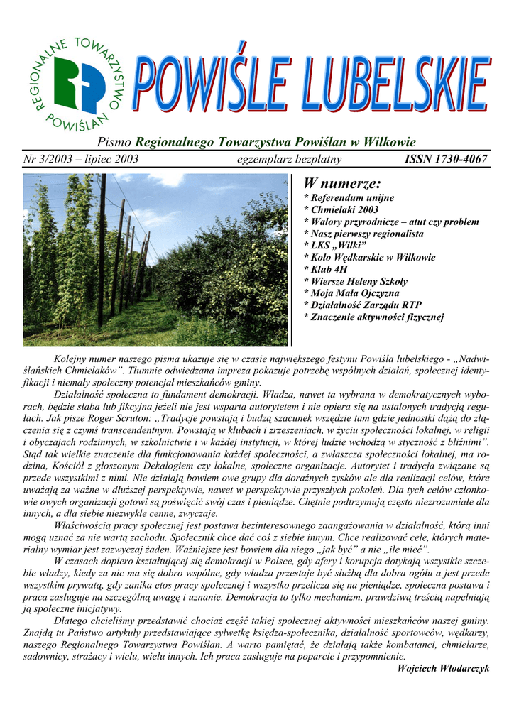 Pismo Regionalnego Towarzystwa Powiślan w Wilkowie Nr 3/2003 – lipiec 2003 egzemplarz bezpłatny ISSN 1730-4067 W numerze: * Referendum unijne * Chmielaki 2003 * Walory przyrodnicze – atut czy problem * Nasz pierwszy regionalista * LKS „Wilki” * Koło Wędkarskie w Wilkowie * Klub 4H * Wiersze Heleny Szkoły * Moja Mała Ojczyzna * Działalność Zarządu RTP * Znaczenie aktywności fizycznej Kolejny numer naszego pisma ukazuje się w czasie największego festynu Powiśla lubelskiego - „Nadwiślańskich Chmielaków”. Tłumnie odwiedzana impreza pokazuje potrzebę wspólnych działań, społecznej identyfikacji i niemały społeczny potencjał mieszkańców gminy. Działalność społeczna to fundament demokracji. Władza, nawet ta wybrana w demokratycznych wyborach, będzie słaba lub fikcyjna jeżeli nie jest wsparta autorytetem i nie opiera się na ustalonych tradycją regułach. Jak pisze Roger Scruton: „Tradycje powstają i budzą szacunek wszędzie tam gdzie jednostki dążą do złączenia się z czymś transcendentnym. Powstają w klubach i zrzeszeniach, w życiu społeczności lokalnej, w religii i obyczajach rodzinnych, w szkolnictwie i w każdej instytucji, w której ludzie wchodzą w styczność z bliźnimi”. Stąd tak wielkie znaczenie dla funkcjonowania każdej społeczności, a zwłaszcza społeczności lokalnej, ma rodzina, Kościół z głoszonym Dekalogiem czy lokalne, społeczne organizacje. Autorytet i tradycja związane są przede wszystkimi z nimi. Nie działają bowiem owe grupy dla doraźnych zysków ale dla realizacji celów, które uważają za ważne w dłuższej perspektywie, nawet w perspektywie przyszłych pokoleń. Dla tych celów członkowie owych organizacji gotowi są poświęcić swój czas i pieniądze. Chętnie podtrzymują często niezrozumiałe dla innych, a dla siebie niezwykle cenne, zwyczaje. Właściwością pracy społecznej jest postawa bezinteresownego zaangażowania w działalność, którą inni mogą uznać za nie wartą zachodu. Społecznik chce dać coś z siebie innym. Chce realizować cele, których materialny wymiar jest zazwyczaj żaden. Ważniejsze jest bowiem dla niego „jak być” a nie „ile mieć”. W czasach dopiero kształtującej się demokracji w Polsce, gdy afery i korupcja dotykają wszystkie szczeble władzy, kiedy za nic ma się dobro wspólne, gdy władza przestaje być służbą dla dobra ogółu a jest przede wszystkim prywatą, gdy zanika etos pracy społecznej i wszystko przelicza się na pieniądze, społeczna postawa i praca zasługuje na szczególną uwagę i uznanie. Demokracja to tylko mechanizm, prawdziwą treścią napełniają ją społeczne inicjatywy. Dlatego chcieliśmy przedstawić chociaż część takiej społecznej aktywności mieszkańców naszej gminy. Znajdą tu Państwo artykuły przedstawiające sylwetkę księdza-społecznika, działalność sportowców, wędkarzy, naszego Regionalnego Towarzystwa Powiślan. A warto pamiętać, że działają także kombatanci, chmielarze, sadownicy, strażacy i wielu, wielu innych. Ich praca zasługuje na poparcie i przypomnienie. Wojciech Włodarczyk 2_____________________________ POWIŚLE LUBELSKIE – nr 3, lipiec 2003r._____________________________ Referendum unijne w gminie Wilków W dniach 7-8 czerwca 2003 roku odbyło się w Polsce referendum akcesyjne. Uprawnionych do głosowania było 29,86 mln obywateli. Za wejściem Polski do Unii Europejskiej opowiedziało się 77,45% (13,51 mln Polaków). Frekwencja wyniosła 58,85%. W województwie lubelskim za wejściem Polski do UE opowiedziało się 63,3% mieszkańców regionu. Był to najniższy wynik w skali kraju. Frekwencja w skali województwa wyniosła 55,5%. W lubelskiej gminie Godziszów odnotowano najmniejsze poparcie dla wejścia Polski do UE w skali kraju - tylko 12%. Przeciw było 88% głosujących mieszkańców gminy Godziszów. Warto wiedzieć, że z chwilą wejścia Polski do UE w dniu 1 maja 2004 roku, województwo lubelskie będzie najuboższym regionem w całej Unii Europejskiej. To oznacza także, że będzie mogło liczyć na największe fundusze strukturalne. W powiecie Opole Lubelskie liczba osób uprawnionych do głosowania w referendum wynosiła 50576. Przy frekwencji 48,72%, na „tak” głosowało 58% (14067 głosów) osób biorących udział w referendum. W gminie Wilków uprawnionych do głosowania było 4008 osób. Frekwencja wyniosła 44,59%. Za przystąpieniem Polski do UE opowiedziało się 51% (894 osób) głosujących, przeciwnych wejściu do Unii było 49% (867 ważnych głosów mieszkańców gminy Wilków). 26 głosów było nieważnych. Wyniki referendum w gminie Wilków w poszczególnych obwodach przedstawiają się następująco: 1. Wilków - lokal Urzędu Gminy. Liczba uprawnionych do głosowania - 1487. Frekwencja 40,89%. Liczba Głosów na „tak” - 294. Liczba głosów na „nie” 301. 2. Dobre - lokal Szkoły Podstawowej. Liczba uprawnionych do głosowania 296. Frekwencja 51,69%. Liczba głosów na „tak” - 70. Liczba głosów na „nie” - 82. 3. Rogów - lokal Szkoły Podstawowej. Liczba uprawnionych do głosowania 515. Frekwencja 44,27%. Liczba głosów na „tak” - 93. Liczba głosów na „nie” - 132. 4. Zagłoba - lokal Szkoły Podstawowej. Liczba uprawnionych do głosowania 728. Frekwencja 46,15%. Liczba głosów na „tak” - 195. Liczba głosów na „nie” - 138. 5. Kępa Chotecka - świetlica wiejska. Liczba osób uprawnionych do głosowania - 220. Frekwencja 50,00%. Liczba głosów na „tak” - 63. Liczba głosów na „nie” - 47. 6. Zastów Polanowski - Wodomistrzówka. Liczba osób uprawnionych do głosowania - 279. Frekwencja - 42,29%. Liczba głosów na „tak” - 64. Liczba głosów na „nie” - 51. 7. Żmijowiska - lokal Szkoły Podstawowej. Liczba osób uprawnionych do głosowania - 243. Frekwencja - 40,74%. Liczba głosów na „tak” - 48. Liczba głosów na „nie” - 49. 8. Wólka Polanowska - Remiza OS