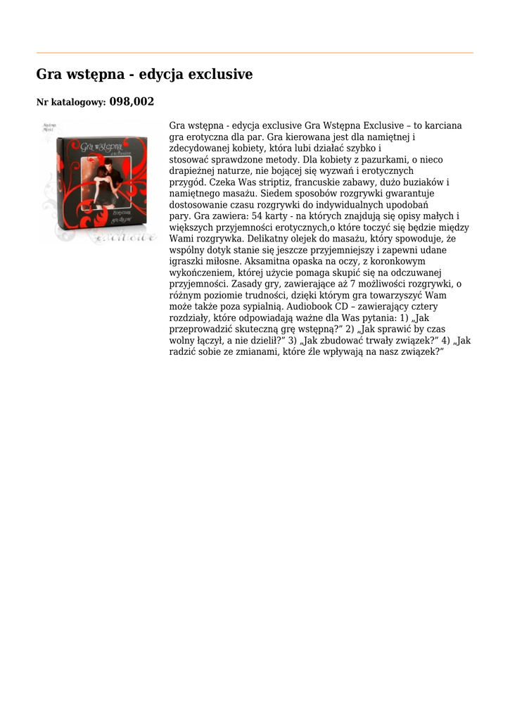 Gra wstępna - edycja exclusive Nr katalogowy: 098,002 Gra wstępna - edycja exclusive Gra Wstępna Exclusive – to karciana gra erotyczna dla par. Gra kierowana jest dla namiętnej i zdecydowanej kobiety, która lubi działać szybko i stosować sprawdzone metody. Dla kobiety z pazurkami, o nieco drapieżnej naturze, nie bojącej się wyzwań i erotycznych przygód. Czeka Was striptiz, francuskie zabawy, dużo buziaków i namiętnego masażu. Siedem sposobów rozgrywki gwarantuje dostosowanie czasu rozgrywki do indywidualnych upodobań pary. Gra zawiera: 54 karty - na których znajdują się opisy małych i większych przyjemności erotycznych,o które toczyć się będzie między Wami rozgrywka. Delikatny olejek do masażu, który spowoduje, że wspólny dotyk stanie się jeszcze przyjemniejszy i zapewni udane igraszki miłosne. Aksamitna opaska na oczy, z koronkowym wykończeniem, której użycie pomaga skupić się na odczuwanej przyjemności. Zasady gry, zawierające aż 7 możliwości rozgrywki, o różnym poziomie trudności, dzięki którym gra towarzyszyć Wam może także poza sypialnią. Audiobook CD – zawierający cztery rozdziały, które odpowiadają ważne dla Was pytania: 1) „Jak przeprowadzić skuteczną grę wstępną?” 2) „Jak sprawić by czas wolny łączył, a nie dzielił?” 3) „Jak zbudować trwały związek?” 4) „Jak radzić sobie ze zmianami, które źle wpływają na nasz związek?”
