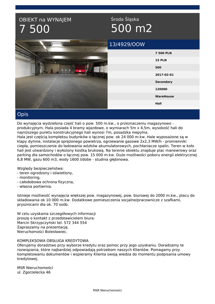 Środa Śląska OBIEKT na WYNAJEM 500 m2 7 500 13/4929/OOW 7 500 PLN 15 PLN 500 2017-02-01 Secondary 120000 WareHouse Hall Opis Do wynajęcia wydzielona część hali o pow. 500 m.kw., o przeznaczeniu magazynowo produkcyjnym. Hala posiada 4 bramy wjazdowe, o wymiarach 5m x 4,5m, wysokość hali do najniższego punktu konstrukcyjnego hali wynosi 7m, posadzka niepylna. Hala jest częścią kompleksu budynków o łącznej pow. ok 24 000 m.kw. Hale wyposażone są w klapy dymne, instalacje sprężonego powietrza, ogrzewanie gazowe 2x2,3 MW/h - promienniki ciepła, pomieszczenie do ładowania wózków akumulatorowych, pochłaniacze spalin. Teren w koło hali jest utwardzony i wyłożony kostką brukową. Na terenie obiektu znajduje plac manewrowy oraz parking dla samochodów o łącznej pow. 15 000 m.kw. Duże możliwości poboru energii elektrycznej 6,8 MW, gazu 600 m3, wody 1600 l/dobe - studnia głębinowa. Względy bezpieczeństwa: - teren ogrodzony i oświetlony, - monitoring, - całodobowa ochrona fizyczna, - własna portiernia. Istnieje możliwość wynajęcia większej pow. magazynowej, pow. biurowej do 2000 m.kw., placu do składowania ok 10 000 m.kw. Dodatkowe pomieszczenia socjalne/pracownicze z szafkami, prysznicami dla ok. 70 osób. W celu uzyskania szczegółowych informacji proszę o kontakt z przedstawicielem biura: Marcin Skrzypczyński tel. 572 344 554 Zapraszamy na prezentację. Nieruchomości Bolesławiec. KOMPLEKSOWA OBSŁUGA KREDYTOWA Oferujemy doradztwo przy wyborze kredytu oraz pomoc przy jego uzyskaniu. Doradzamy te rozwiązania, które najbardziej odpowiadają potrzebom naszych Klientów. Pomagamy przy kompletowaniu dokumentów i wspieramy Klienta swoją wiedza do momentu podpisania umowy kredytowej. MSR Nieruchomości ul. Zgorzelecka 46 MSR Nieruchomości 59-700 Bolesławiec www.nieruchomosciboleslawiec.pl Marcin Skrzypczynski tel. 572 344 554 email: [email protected] MSR Nieruchomości Powered by TCPDF (www.tcpdf.org)
