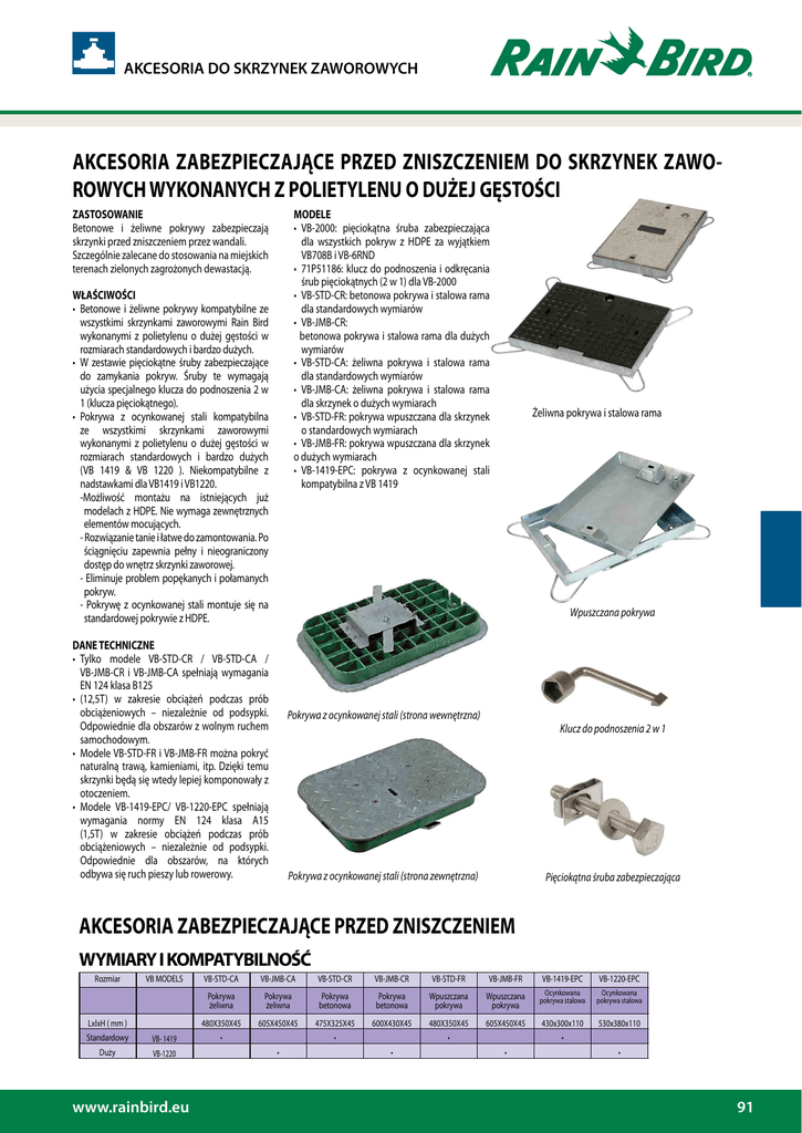 AKCESORIA DO SKRZYNEK ZAWOROWYCH AKCESORIA ZABEZPIECZAJĄCE PRZED ZNISZCZENIEM DO SKRZYNEK ZAWOROWYCH WYKONANYCH Z POLIETYLENU O DUŻEJ GĘSTOŚCI MODELE • VB-2000: pięciokątna śruba zabezpieczająca dla wszystkich pokryw z HDPE za wyjątkiem VB708B i VB-6RND • 71P51186: klucz do podnoszenia i odkręcania śrub pięciokątnych (2 w 1) dla VB-2000 • VB-STD-CR: betonowa pokrywa i stalowa rama dla standardowych wymiarów • VB-JMB-CR: betonowa pokrywa i stalowa rama dla dużych wymiarów • VB-STD-CA: żeliwna pokrywa i stalowa rama dla standardowych wymiarów • VB-JMB-CA: żeliwna pokrywa i stalowa rama dla skrzynek o dużych wymiarach • VB-STD-FR: pokrywa wpuszczana dla skrzynek o standardowych wymiarach • VB-JMB-FR: pokrywa wpuszczana dla skrzynek o dużych wymiarach • VB-1419-EPC: pokrywa z ocynkowanej stali kompatybilna z VB 1419 ZASTOSOWANIE Betonowe i żeliwne pokrywy zabezpieczają skrzynki przed zniszczeniem przez wandali. Szczególnie zalecane do stosowania na miejskich terenach zielonych zagrożonych dewastacją. WŁAŚCIWOŚCI • Betonowe i żeliwne pokrywy kompatybilne ze wszystkimi skrzynkami zaworowymi Rain Bird wykonanymi z polietylenu o dużej gęstości w rozmiarach standardowych i bardzo dużych. • W zestawie pięciokątne śruby zabezpieczające do zamykania pokryw. Śruby te wymagają użycia specjalnego klucza do podnoszenia 2 w 1 (klucza pięciokątnego). • Pokrywa z ocynkowanej stali kompatybilna ze wszystkimi skrzynkami zaworowymi wykonanymi z polietylenu o dużej gęstości w rozmiarach standardowych i bardzo dużych (VB 1419 & VB 1220 ). Niekompatybilne z nadstawkami dla VB1419 i VB1220. -Możliwość montażu na istniejących już modelach z HDPE. Nie wymaga zewnętrznych elementów mocujących. - Rozwiązanie tanie i łatwe do zamontowania. Po ściągnięciu zapewnia pełny i nieograniczony dostęp do wnętrz skrzynki zaworowej. - Eliminuje problem popękanych i połamanych pokryw. - Pokrywę z ocynkowanej stali montuje się na standardowej pokrywie z HDPE. Żeliwna pokrywa i stalowa rama Wpuszczana pokrywa DANE TECHNICZNE • Tylko modele VB-STD-CR / VB-STD-CA / VB-JMB-CR i VB-JMB-CA spełniają wymagania EN 124 klasa B125 • (12,5T) w zakresie obciążeń podczas prób obciążeniowych – niezależnie od podsypki. Odpowiednie dla obszarów z wolnym ruchem samochodowym. • Modele VB-STD-FR i VB-JMB-FR można pokryć naturalną trawą, kamieniami, itp. Dzięki temu skrzynki będą się wtedy lepiej komponowały z otoczeniem. • Modele VB-1419-EPC/ VB-1220-EPC spełniają wymagania normy EN 124 klasa A15 (1,5T) w zakresie obciążeń podczas prób obciążeniowych – niezależnie od podsypki. Odpowiednie dla obszarów, na których odbywa się ruch pieszy lub rowerowy. Pokrywa z ocynkowanej stali (strona wewnętrzna) Klucz do podnoszenia 2 w 1 Pokrywa z ocynkowanej stali (strona zewnętrzna) Pięciokątna śruba zabezpieczająca AKCESORIA ZABEZPIECZAJĄCE PRZED ZNISZCZENIEM WYMIARY I KOMPATYBILNOŚĆ Rozmiar VB МODELS LxlxH ( mm ) Standardowy VB- 1419 Duży VB-1220 www.rainbird.eu VB-STD-CA VB-JМB-CA VB-STD-CR VB-JМB-CR VB-STD-FR VB-JМB-FR VB-1419-EPC VB-1220-EPC Pokrywa żeliwna Pokrywa żeliwna Pokrywa betonowa Pokrywa betonowa Wpuszczana pokrywa Wpuszczana pokrywa Ocynkowana pokrywa stalowa Ocynkowana pokrywa stalowa 480X350X45 605X450X45 475X325X45 600X430X45 480X350X45 605X450X45 430x300x110 530x380x110 • • • • • • • • 91