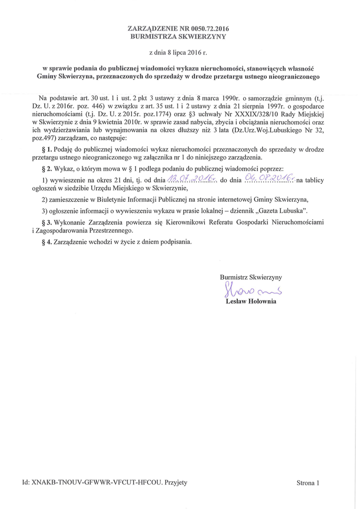 Burmistrza Skw ierzyny z dnia 8 lipca 2016r.