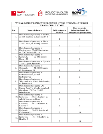 WYKAZ DOMÓW POMOCY SPOŁECZNEJ, KTÓRE OTRZYMAŁY SPRZĘT W RAMACH I i II ETAPU Ilość zestawów Lp. Nazwa jednostki Ilość zestawów indywidualnych dla dla DPS pielęgniarek/pielęgniarzy Dom Pomocy Społecznej w Bochni, 1. 32-700 Bochnia, ul. Karolina 14 d 2 2 Dom Pomocy Społecznej w Płazie, 2. 32-552 Płaza, ul. Wiosny Ludów 4 2 2 Dom Pomocy Społecznej w 3. Karniowicach, 32-082 Karniowice, os. XXXV-Lecia PRL 10 1 3 Dom Pomocy Społecznej w 4. Konarach, 32-040 Konary, Konary 21 2 2 Dom Pomocy Społecznej w Ojcowie, 5. 32-047 Ojców, Ojców 64 2 1 Dom Pomocy Społecznej w 6. Oczarach, 32-088 Owczary, ul. Kasztanowa 20 1 6 Dom Pomocy Społecznej w 7. Radwanowicach, 32-064 Radwanowice 1 2 2 Dom Pomocy Społecznej w 8. Więckowicach, 32-082 Więckowice, ul. Słoneczna 3 1 4 Dom Pomocy Społecznej ,,Na Farmie Życia” w Więckowicach, ul. 9. Ogrodowa 17 i 17A, 32-082 Bolechowice 1 1 Dom Pomocy Społecznej w 10. Krakowie, 30-336 Kraków, ul. Adolfa Nowaczyńskiego 1 1 9 Dom Pomocy Społecznej w 11. Krakowie, 30-725 Kraków, ul. Łanowa 41 2 5 Dom Pomocy Społecznej w 12. Krakowie, 31-066 Kraków, ul. Krakowska 55 2 10 Dom Pomocy Społecznej w Krakowie, 31-148 Kraków, ul. 13. Helclów 2 2 18 Dom Pomocy Społecznej w 14. Krakowie, 30-329 Kraków, ul. Praska 25 Dom Pomocy Społecznej w 15. Krakowie, 30-725 Kraków, ul. Łanowa 39 Dom Pomocy Społecznej w 16. Krakowie, 31-419 Kraków, ul. Rozrywka 1 Dom Pomocy Społecznej w 17. Szczyrzycu, 34-623 Szczyrzyc, Szczyrzyc 182 Dom Pomocy Społecznej w 18. Miechowie, 32-200 Miechów, ul. Warszawska 49 a Dom Pomocy Społecznej w 19. Miechowie, 32-200 Miechów, ul. Ks. Skorupki 19 Dom Pomocy Społecznej w 20. Harbutowicach, 32-440 Harbutowice 1 Dom Pomocy Społecznej w Pcimiu, 21. 32-432 Pcim 638 Dom Pomocy Społecznej w 22. Trzemeśni, 32-425 Trzemeśnia 377 Dom Pomocy Społecznej w 23. Zbyszycach, 33-318 Gródek nad Dunajcem, Zbyszyce 12 Dom Pomocy Społecznej w Rabce 24. Zdrój, 34-700 Rabka Zdrój, ul. Parkowa 4 Dom Pomocy Społecznej w Zaskalu, 25. 34-424 Zaskale, ul. Kardynała Karola Wojtyły 136 Dom Pomocy Społecznej w Nowym 26. Sączu, 33-300 Nowy Sącz, ul. Nawojowska 159 Dom Pomocy Społecznej w Bobrku, 27. 32-661 Bobrek, ul. Księżnej Ogińskiej 2 28. 2 1 2 2 2 1 2 6 2 3 2 2 1 1 2 3 1 2 1 11 2 1 2 1 2 2 2 9 2 3 Dom Pomocy Społecznej w Zatorze, 32-640 Zator, Jana Pawła II 3 Dom Pomocy Społecznej w 29. Łyszkowicach, 32-104 Łyszkowice, Łyszkowice 64 Dom Pomocy Społecznej w 30. Pieczonogach, 32-109 Pieczonogi, Pieczonogi 54 Dom Pomocy Społecznej w Makowie Podhalańskim, 34-220 31. Maków Podhalański, ul. Żeromskiego 17 Dom Pomocy Społecznej w 32. Nowodworzu, 33-112 Nowodworze, Nowodworze 64 Dom Pomocy Społecznej w 33. Sieradzy, 33-240 Sieradza, Sieradza 208 Dom Pomocy Społecznej w 34. Stróżach, 32-840 Stróże, Stróże 1 Dom Pomocy Społecznej w 35. Tuchowie, 33-170 Tuchów, ul. Józefa 9 Dom Pomocy Społecznej w 36. Zakopanym, 34-500 Zakopane, ul. Szpitalna 21 Dom Pomocy Społecznej w 37. Izdebniku, 34-144 Izdebnik, Izdebnik 3 Dom Pomocy Społecznej w 38. Wadowicach, 34-100 Wadowice, ul. Parkowa 1 Dom Pomocy Społecznej w 39. Wadowicach, 34-100 Wadowice, ul. Lwowska 31 Dom Pomocy Społecznej w 40. Wadowicach, 34-100 Wadowice, ul. Pułaskiego 5 Dom Pomocy Społecznej w 41. Zebrzydowicach, 34-130 Zebrzydowice, Zebrzydowice 1 Dom Pomocy Społecznej w Czernej, 42. 32-065 Krzeszowice, Czerna 110 Dom Pomocy Społecznej w 43. Mianocicach, 32-210 Książ Wielki, Mianocice 51 2 5 2 4 2 3 1 8 1 4 1 3 2 1 1 2 2 2 2 1 2 2 1 1 2 4 1 1 1 2 Dom Pomocy Społecznej w 44. Bulowicach, 32-652 Bulowice, Bł. Faustyny 4 Dom Pomocy Społecznej w 45. Krakowie, 30-725 Kraków, ul. Łanowa 43 Dom Pomocy Społecznej w 46. Klimkówce, 38-312 Ropa, Klimkówka 67 Dom pomocy Społecznej w Mszanie 47. Dolnej, 34-730 Mszana Dolna, ul. Rakoczego 9 1 1 1 2 1 1 1 3
