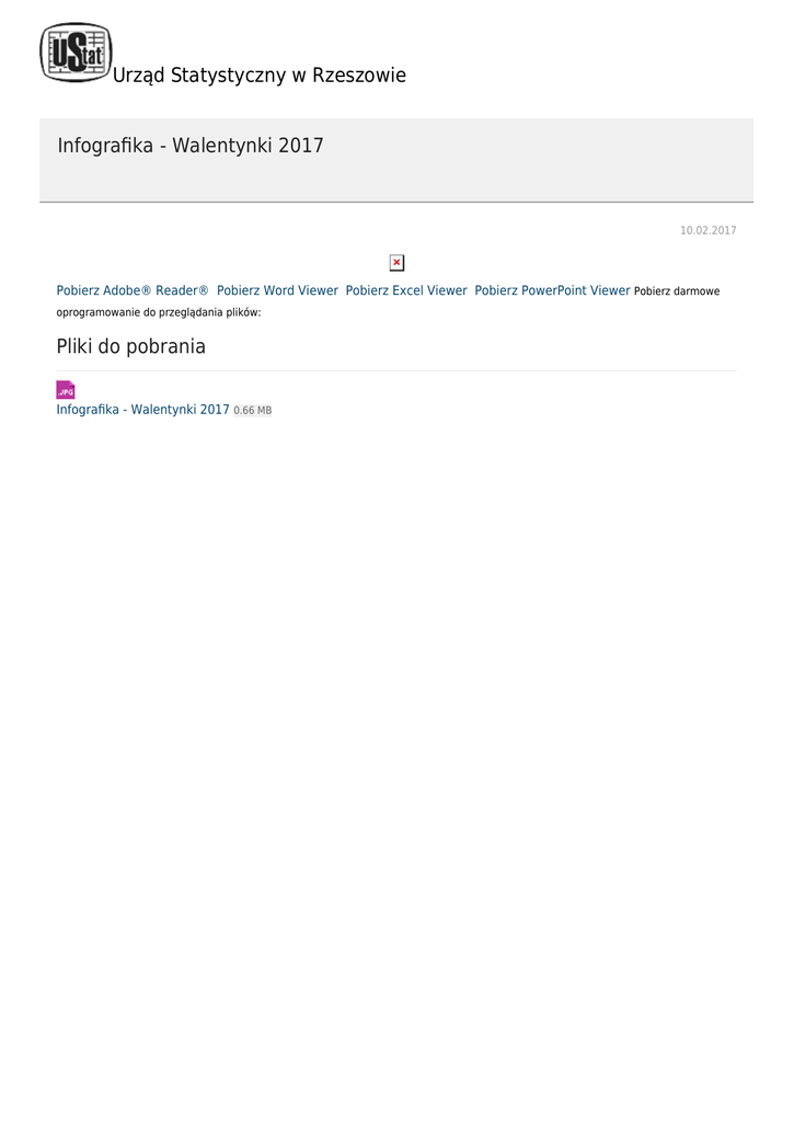 Urząd Statystyczny w Rzeszowie Infografika - Walentynki 2017 10.02.2017 Pobierz Adobe® Reader® Pobierz Word Viewer Pobierz Excel Viewer Pobierz PowerPoint Viewer Pobierz darmowe oprogramowanie do przeglądania plików: Pliki do pobrania Infografika - Walentynki 2017 0.66 MB