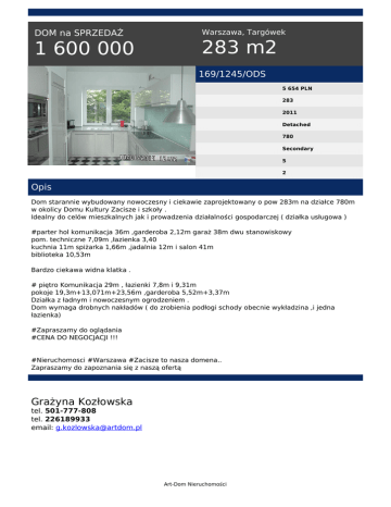 DOM na SPRZEDAŻ 1 600 000 Warszawa, Targówek 283 m2 169/1245/ODS 5 654 PLN 283 2011 Detached 780 Secondary 5 2 Opis Dom starannie wybudowany nowoczesny i ciekawie zaprojektowany o pow 283m na działce 780m w okolicy Domu Kultury Zacisze i szkoły . Idealny do celów mieszkalnych jak i prowadzenia działalności gospodarczej ( działka usługowa ) #parter hol komunikacja 36m ,garderoba 2,12m garaż 38m dwu stanowiskowy pom. techniczne 7,09m ,łazienka 3,40 kuchnia 11m spiżarka 1,66m ,jadalnia 12m i salon 41m biblioteka 10,53m Bardzo ciekawa widna klatka . # piętro Komunikacja 29m , łazienki 7,8m i 9,31m pokoje 19,3m+13,071m+23,56m ,garderoba 5,52m+3,37m Działka z ładnym i nowoczesnym ogrodzeniem . Dom wymaga drobnych nakładów ( do zrobienia podłogi schody obecnie wykładzina ,i jedna łazienka) #Zapraszamy do oglądania #CENA DO NEGOCJACJI !!! #Nieruchomosci #Warszawa #Zacisze to nasza domena.. Zapraszamy do zapoznania się z naszą ofertą Grażyna Kozłowska tel. 501-777-808 tel. 226189933 email: [email protected] Art-Dom Nieruchomości Powered by TCPDF (www.tcpdf.org)