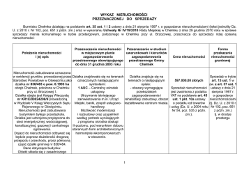WYKAZ NIERUCHOMOŚCI PRZEZNACZONEJ DO SPRZEDAŻY Burmistrz Chełmka działając na podstawie art. 35 ust. 1 i 2 ustawy z dnia 21 sierpnia 1997 r. o gospodarce nieruchomościami (tekst jednolity Dz. U. z 2010 r. Nr 102, poz. 651 z późn. zm.) oraz w wykonaniu Uchwały Nr IV/19/2010 Rady Miejskiej w Chełmku z dnia 29 grudnia 2010 roku w sprawie sprzedaży mienia komunalnego w trybie przetargowym, położonego w Chełmku przy ul. Brzozowej, przeznacza do sprzedaży niżej opisaną nieruchomości: Położenie nieruchomości i jej opis Przeznaczenie nieruchomości Przeznaczenie w studium w miejscowym planie uwarunkowań i kierunków zagospodarowania zagospodarowania przestrzennego obowiązującego przestrzennego Gminy do dnia 31 grudnia 2003 roku Chełmek Nieruchomość zabudowana oznaczona w ewidencji gruntów, prowadzonej przez Działka znajdowała się na terenach Działka znajduje się na Starostwo Powiatowe w Oświęcimiu jako oznaczonych następującymi terenach o następującym działka nr 836/483 o pow. 0.1993 ha symbolami: opisie: obręb Chełmek, położona w Chełmku 1 AUC – Centralny ośrodek - obszary wymagające przy ul. Brzozowej 1. usługowy. przekształceń Działka objęta jest Księgą Wieczystą Utrzymanie istniejącego zagospodarowania i nr KR1E/00024296/9 prowadzoną zainwestowania m.in. Urząd rehabilitacji zabudowy, obszar w Wydziale V Ksiąg Wieczystych Sądu Miejski, banki, zespół usługowo- kształtowania centrum miasta. Rejonowego w Oświęcimiu. handlowy. Nieruchomości jest zabudowana Możliwość modernizacji budynkiem byłego przedszkola. i rozbudowy oraz uzupełnień Działka jest uzbrojona przyłączona do według potrzeb wynikających sieci energetycznej, wodociągowej, z programu ośrodka obsługi kanalizacyjnej, gazowej i centralnego II-poziomu, pod warunkiem doboru ogrzewania. starannych form architektonicznych Dojazd do nieruchomości odbywać się harmonijnie wkomponowanych będzie poprzez służebność drogową w otoczenie. przejazdu i przechodu, przez północną część działki gminnej nr 836/484. Dane dotyczące budynku: Obiekt składa się z zasadniczego 1 Cena nieruchomości 597.000,00 złotych Sprzedaż nieruchomości jest zwolniona z podatku VAT na podstawie art. 43 ust. 1 pkt. 10a ustawy o podatku od towarów i usług (Dz. U. z 2004 roku Nr 54, poz. 535 z późn. zm.). Forma przekazania nieruchomości gruntowej Sprzedaż w trybie art. 13 ust. 1 w zw. z art. 37 ust. 1 ustawy z dnia 21 sierpnia 1997 r. o gospodarce nieruchomościami (tj. Dz. U. z 2010 r. Nr 102, poz. 651 z późn. zm.) tj. w drodze przetargu Położenie nieruchomości i jej opis budynku dwukondygnacyjnego, przylegającego do niego budynku kotłowni i parterowego budynku biurowego z łącznikiem. Pow. zabudowy 815,54 m2, pow. użytkowa 1042,87 m2, kubatura obiektu 4586,25 m3. Budynek zasadniczy nie podpiwniczony przykryty dachem ze stropodachem wentylowanym. Budynek o prostym układzie bryły wykonany metodą tradycyjną jako murowany. Konstrukcja budynku nie wykazuje uszkodzeń. Przeznaczenie nieruchomości Przeznaczenie w studium w miejscowym planie uwarunkowań i kierunków zagospodarowania zagospodarowania przestrzennego obowiązującego przestrzennego Gminy do dnia 31 grudnia 2003 roku Chełmek Cena nieruchomości Forma przekazania nieruchomości gruntowej Przebudowa, nadbudowa, rozbudowa istniejącego budynku wymaga uzyskania decyzji o warunkach zabudowy z przeznaczeniem go na cele usługowe i mieszkaniowe. Działka przeznaczona do sprzedaży powstała w wyniku: podziału działki 836/86 na nowe nieruchomości, zatwierdzonego decyzją Burmistrza Chełmka znak: AGK. 7430-1-24/2009 z dnia 03 września 2009 roku. Wartość rynkowa w/w nieruchomości przeznaczonej do sprzedaży została ustalona przez uprawnionego rzeczoznawcę w zakresie szacowania nieruchomości i przedstawiona w postaci operatu szacunkowego. Ustala się termin zakończenia robót budowlanych w/w obiektu, obejmujących: zakończenie przebudowy, nadbudowy, rozbudowy, zmianę sposobu użytkowania w terminie do końca 2013 roku. Za zakończenie przebudowy, nadbudowy, rozbudowy uważa się zgodnie z obowiązującymi przepisami przystąpienie do użytkowania obiektu budowlanego, w szczególności na mocy pozwoleń, decyzji odpowiednich organów, o ile są wymagane. Przedmiotowa nieruchomość została objęta decyzją o ustaleniu lokalizacji inwestycji celu publicznego. Decyzja z dnia 30 grudnia 2009 roku, znak: AGK.ICP.7331-16/09, obejmuje budowę układu drogowego oraz zagospodarowania terenów w centrum Chełmka w rejonie ulicy Krakowskiej i Brzozowej. Ponadto opracowany został: - projekt wykonawczy dla budowy układu drogowego oraz zagospodarowania terenu w centrum Chełmka, obejmujący swoim zakresem przedmiotową nieruchomość – marzec 2010 rok, - projekt koncepcyjny – koncepcja przebudowy, nadbudowy oraz zmiany sposobu użytkowania budynku, byłego przedszkola położonego w Chełmku przy ul. Brzozowej 1 – kwiecień 2010 rok. 2 Przedmiotowy wykaz został wywieszony w siedzibie Urzędu Miejskiego w Chełmku oraz na tablicach ogłoszeń na terenie całej gminy na okres 21 dni tj. w terminie od dnia 23 lutego 2011 roku do dnia 17 marca 2011 roku. Ponadto informacja o wywieszeniu wykazu została podana do publicznej wiadomości przez ogłoszenie w prasie lokalnej. Osoby, którym przysługuje pierwszeństwo w nabyciu nieruchomości na podstawie art. 34 ust. 1 pkt 1, 2 i 3 ustawy z dnia 21 sierpnia 1997 r. o gospodarce nieruchomościami (tekst jednolity Dz. U. z 2010 r. Nr 102, poz. 651 z późn. zm.), mogą w terminie 6 tygodni od dnia wywieszenia niniejszego wykazu tj. od dnia 23 lutego 2011 roku do dnia 06 kwietnia 2011 roku składać wnioski o nabycie przedmiotowych nieruchomości. Dodatkowych informacji w sprawie sprzedaży w/w nieruchomości można uzyskać w pok. nr 14 Urzędu Miejskiego w Chełmku ul. Krakowska 11 lub telefonicznie pod numerem telefonu 0-33 844-90-33 lub 844 90 34 w Wydzia