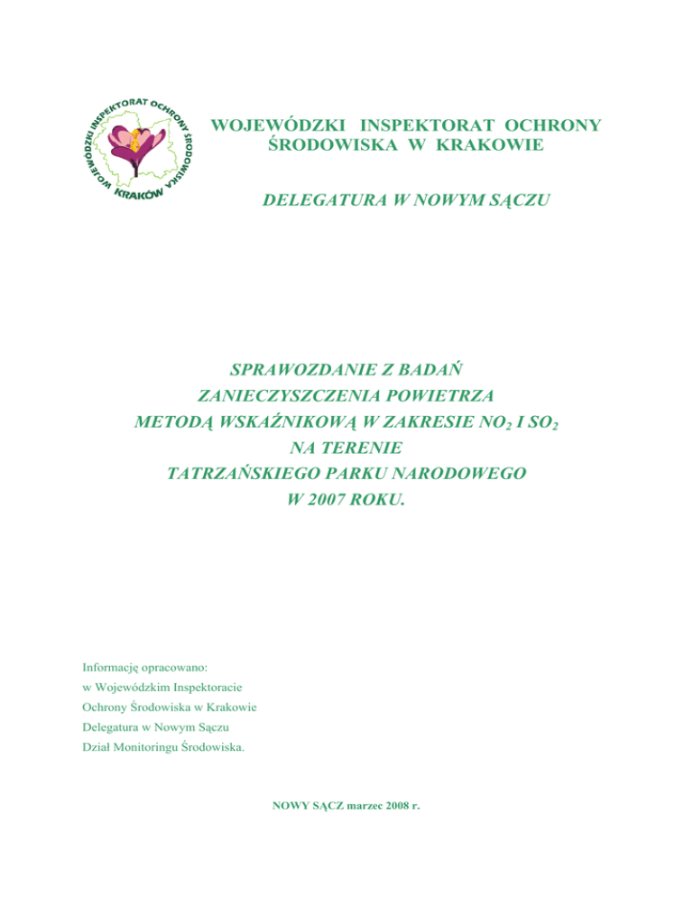 WOJEWÓDZKI INSPEKTORAT OCHRONY ŚRODOWISKA W KRAKOWIE DELEGATURA W NOWYM SĄCZU SPRAWOZDANIE Z BADAŃ ZANIECZYSZCZENIA POWIETRZA METODĄ WSKAŹNIKOWĄ W ZAKRESIE NO2 I SO2 NA TERENIE TATRZAŃSKIEGO PARKU NARODOWEGO W 2007 ROKU. Informację opracowano: w Wojewódzkim Inspektoracie Ochrony Środowiska w Krakowie Delegatura w Nowym Sączu Dział Monitoringu Środowiska. NOWY SĄCZ marzec 2008 r. Autorzy: mgr Grażyna Cieśla mgr inż. Linda Tyrkiel-Cebula Kierownik Delegatury: mgr inż. Ewa Gondek Pomiary zanieczyszczeń powietrza metodą wskaźnikową na terenie Województwa Małopolskiego w 2007 roku Zgodnie z Programem Monitoringu Środowiska w Województwie Małopolskim w 2007 roku kontynuowano badania jakości powietrza w zakresie stężeń dwutlenku azotu i dwutlenku siarki metodą pasywną (wskaźnikową) co pozwoliło na określenie aktualnego stanu zanieczyszczenia powietrza w rejonach, gdzie czynniki techniczne lub ekonomiczne uniemożliwiają zastosowanie bardziej złożonych metod pomiarowych. Metoda pasywnego pobierania próbek powietrza oparta jest na zjawisku samoistnej dyfuzji gazów oraz ich pochłanianiu na odpowiednio dobranym absorbencie. Metoda ta została opracowana w Zakładzie Chemii Analitycznej Politechniki Krakowskiej i znormalizowana [PN89/Z – 04092/08]. Do pasywnego pobierania próbek powietrza wykorzystano próbniki pasywne z siateczkami ze stali nierdzewnej, które po miesięcznej ekspozycji na stanowiskach pomiarowych poddawano analizie chemicznej z użyciem chromatografu jonowego. Zastosowanie chromatografii jonowej pozwoliło jednocześnie oznaczyć produkty absorpcji SO2 i NO2 w badanej próbce. Dla zwiększenia dokładności pomiarów w każdym punkcie pomiarowym zawieszono po trzy próbniki. W 2007 roku badania stężeń SO2 i NO2 metodą wskaźnikową na terenie Województwa Małopolskiego przeprowadzono w okresie od stycznia do grudnia w ograniczonej, w stosunku do lat poprzednich liczbie punktów pomiarowo-kontrolnych, łącznie na 21 stanowiskach pomiarowych, w tym 6 punktów zlokalizowano na obszarach Parków Narodowych oraz 1 punkt na obszarze ochrony uzdrowiskowej, w miejscowości Muszyna. Punkty na terenach Parków Narodowych rozmieszczono w sposób następujący: • Ojcowski Park Narodowy - 1 punkt pomiarowy (Jerzmanowice-Lepianka), • Gorczański Park Narodowy - 1 punkt pomiarowy (Góra Suhora), • Babiogórski Park Narodowy - 1 punkt pomiarowy (O.O. Stonów oddz.57h), • Pieniński Park Narodowy - 1 punkt pomiarowy (Majerz), • Tatrzański Park Narodowy - 1 punkt pomiarowy (Łysa Polana), • Magurski Park Narodowy - 1 punkt pomiarowy (Nieznajowa). Pozostałych 15 stanowisk pomiarowych usytuowano w większych miastach Województwa Małopolskiego. Kontynuowano badania rozpoczęte w roku 2003: w Dąbrowie Tarnowskiej, Bochni, Brzesku, Ciężkowicach, Gorlicach, Limanowej, Myślenicach oraz badania rozpoczęte w roku 2004 w punktach zlokalizowanych w : Suchej Beskidzkiej, Proszowicach, Miechowie, Wieliczce, Wadowicach, Niepołomicach, Starym Sączu. Punkty pomiarowe do pasywnego poboru próbek powietrza zlokalizowano w rejonach spodziewanych wyższych stężeń zanieczyszczeń. Roczna seria badań pozwoliła określić średnioroczne stężenia SO2 i NO2 na badanych obszarach, a wyniki badań metodą pasywną będzie można wykorzystać przy wyznaczaniu docelowych lokalizacji punktów pomiarowych pod kątem modernizacji systemu monitoringu powietrza zgodnie z wymogami Dyrektyw unijnych i nowych przepisów krajowych. Lokalizację punktów pomiarowych do badań zanieczyszczeń powietrza dwutlenkiem azotu i dwutlenkiem siarki metodą pasywną na obszarze Województwa Małopolskiego przedstawiono w tabeli i na mapie nr 1. Tab. Lokalizacja punktów pomiarowych do badań zanieczyszczeń powietrza NO2 i SO2 metodą pasywną w 2007 roku. Nr punktu 1 2 3 4 5 6 7 8 9 10 11 12 13 Miejscowość Dąbrowa Tarnowska 33-200, ul. Zaręby 22, Gimnazjum Nr 1 Bochnia 32-700, ul. Legionów Polskich 8, Miejskie Przedszkole Nr 2 Brzesko 32-800, ul. Ogrodowa 10, Przedszkole Publiczne Nr 4 Ciężkowice 33-190, ul. Zdrowa 2, Ośrodek Zdrowia w Ciężkowicach Muszyna 33-370, ul. Rynek 13, Zespół Szkół Ogólnokształcących Gorlice 38-300, ul. Rynek 2, Urząd Miasta Gorlice Limanowa 34-600, ul. J.Marka, Starostwo Powiatowe Sucha Beskidzka 34-200, ul. Rynek 1, Karczma „Rzym” Myślenice 32-400, ul. Poniatowskiego 11A, Prasowalnia Proszowice 32-100, ul. 3 Maja 72, Urząd Miasta i Gminy w Proszowicach Miechów 32-200, ul. Służba Polsce 11 FHU „ALFA” Wieliczka 32-020, Plac Targowy, Ochotnicza Straż Pożarna Wadowice ul. Wojtyłów 16, Środowiskowy Dom Samopomocy Powiat Wysokość poboru prób dąbrowski 2m bocheński 2m brzeski 2m tarnowski 2m nowosądecki 2,5 m gorlicki 3,5 m limanowski 4m suski 2,5 m myślenicki 3,0 m proszowicki 2,5 m miechowski 2m wielicki 3m wadowicki 4m Współrzędne geograficzne φ – szerokość geograficzna, λ - długość geograficzna φ=50o10’40” λ=20o59’00” φ=49o57 ’57” λ=20o24’46” φ=49o58’16” λ=20o36’06” φ=49o47’10” λ=20o58’35” φ=49o21’22” λ=20o 53’31” φ=49o39’27” λ=21o09’27” φ=49 o42 ’16” λ= 20o 25’ 14” φ= 49o 44’33” λ=19o 36 ’05” φ=49o50’02” λ=19o56 ’17” φ=50o11’30” λ=20o17’41” φ=50o21’28” λ=20o 01’46” φ= 49o58’52” λ=20o03’47” φ=49o53’06” λ=19o29’37” 14 15 Niepołomice, ul. 3 Maja, obok boiska sportowego Szkoły Podstawowej Stary Sącz 33-340, ul. Daszyńskiego 3, Budynek Popradzkiego Parku Krajobrazowego wielicki 1,8 m nowosądecki 2,5 m Parki Narodowe 16 17 Jerzmanowice-Lepianka, Ojcowski Park Narodowy Zawoja, Stonów oddz.57h, Babiogórski Park Narodowy krakowski 1,8 m suski 2,0 m 18 Góra Suhora, Gorczański Park Narodowy limanowski 2,0 m 19 Łysa Polana, Tatrzański Park Narodowy tatrzański 2,1 m 20 Majerz, Pieniński Park Narodowy 21 Nieznajowa, Magurski Park Narodowy nowotarski 2,0 m go
