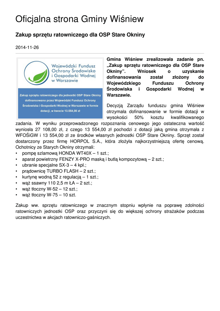 Oficjalna strona Gminy Wiśniew Zakup sprzętu ratowniczego dla OSP Stare Okniny 2014-11-26 Gmina Wiśniew zrealizowała zadanie pn. „Zakup sprzętu ratowniczego dla OSP Stare Okniny”. Wniosek o uzyskanie dofinansowania został złożony do Wojewódzkiego Funduszu Ochrony Środowiska i Gospodarki Wodnej w Warszawie. Decyzją Zarządu funduszu gmina Wiśniew otrzymała dofinansowanie w formie dotacji w wysokości 50% kosztu kwalifikowanego zadania. W wyniku przeprowadzonego rozpoznania cenowego jego ostateczna wartość wyniosła 27 108,00 zł, z czego 13 554,00 zł pochodzi z dotacji jaką gmina otrzymała z WFOŚiGW i 13 554,00 zł ze środków własnych jednostki OSP Stare Okniny. Sprzęt został dostarczony przez firmę HORPOL S.A., która złożyła najkorzystniejszą ofertę cenową. Ochotnicy ze Starych Okniny otrzymali: • pompę szlamową HONDA WT40X – 1 szt.; • aparat powietrzny FENZY X-PRO maską i butlą kompozytową – 2 szt.; • ubranie specjalne SX-3 – 4 kpl.; • prądownicę TURBO FLASH – 2 szt.; • kurtynę wodną 52 z regulacją – 1 szt.; • wąż ssawny 110 2,5 m ŁA – 2 szt.; • wąż tłoczny W-52 – 12 szt.; • wąż tłoczny W-75 – 10 szt. Zakup ww. sprzętu ratowniczego w znacznym stopniu wpłynie na poprawę zdolności ratowniczych jednostki OSP oraz przyczyni się do większej ochrony strażaków podczas uczestnictwa w akcjach ratowniczo-gaśniczych.