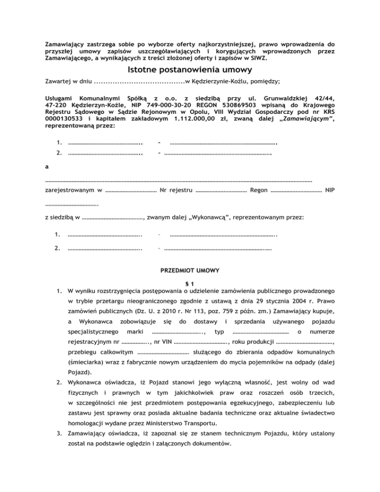 Zamawiający zastrzega sobie po wyborze oferty najkorzystniejszej, prawo wprowadzenia do przyszłej umowy zapisów uszczegóławiających i korygujących wprowadzonych przez Zamawiającego, a wynikających z treści złożonej oferty i zapisów w SIWZ. Istotne postanowienia umowy Zawartej w dniu .......................................w Kędzierzynie-Koźlu, pomiędzy; Usługami Komunalnymi Spółką z o.o. z siedzibą przy ul. Grunwaldzkiej 42/44, 47-220 Kędzierzyn-Koźle, NIP 749-000-30-20 REGON 530869503 wpisaną do Krajowego Rejestru Sądowego w Sądzie Rejonowym w Opolu, VIII Wydział Gospodarczy pod nr KRS 0000130533 i kapitałem zakładowym 1.112.000,00 zł, zwaną dalej „Zamawiającym”, reprezentowaną przez: 1. ……………………………………….. – 2. ……………………………………….. – ……………………………………………………….…. ………………………………………………………….. a ……………………………………………………………………………………………………………………………………………………… zarejestrowanym w …………………………… Nr rejestru …………………………… Regon …………………………… NIP ……………………………. z siedzibą w …………………………………, zwanym dalej „Wykonawcą”, reprezentowanym przez: 1. ……………………………………….. – ………………………………………………………….. 2. ……………………………………….. – ……………………………………………………….…. PRZEDMIOT UMOWY §1 1. W wyniku rozstrzygnięcia postępowania o udzielenie zamówienia publicznego prowadzonego w trybie przetargu nieograniczonego zgodnie z ustawą z dnia 29 stycznia 2004 r. Prawo zamówień publicznych (Dz. U. z 2010 r. Nr 113, poz. 759 z późn. zm.) Zamawiający kupuje, a Wykonawca specjalistycznego zobowiązuje marki się do dostawy ………………………….., i typ sprzedania używanego ……………………………… o pojazdu numerze rejestracyjnym nr …………….., nr VIN ……………………………., roku produkcji ………………………………, przebiegu całkowitym …………………………… służącego do zbierania odpadów komunalnych (śmieciarka) wraz z fabrycznie nowym urządzeniem do mycia pojemników na odpady (dalej Pojazd). 2. Wykonawca oświadcza, iż Pojazd stanowi jego wyłączną własność, jest wolny od wad fizycznych i prawnych w tym jakichkolwiek praw oraz roszczeń osób trzecich, w szczególności nie jest przedmiotem postępowania egzekucyjnego, zabezpieczeniu lub zastawu jest sprawny oraz posiada aktualne badania techniczne oraz aktualne świadectwo homologacji wydane przez Ministerstwo Transportu. 3. Zamawiający oświadcza, iż zapoznał się ze stanem technicznym Pojazdu, który ustalony został na podstawie oględzin i załączonych dokumentów. 4. Wykonawca dostarczy Zamawiającemu wyżej wskazany pojazd o właściwościach zgodnych z opisanymi w szczegółowym opisie przedmiotu zamówienia - załączniku nr 1 do specyfikacji istotnych warunków zamówienia, traktowanym jako załącznik do niniejszej umowy. 5. Przedmiot Umowy obejmuje ponadto: - przeszkolenie personelu Zamawiającego w zakresie obsługi i eksploatacji Pojazdu, - świadczenie serwisu gwarancyjnego Pojazdu na zasadach określonych w niniejszej Umowie. WYDANIE PRZEDMIOTU UMOWY §2 1. Wykonawca zobowiązuje się dostarczyć na własne ryzyko i koszt, a następnie wydać Pojazd, w siedzibie Zamawiającego (Kędzierzyn-Koźle ul. Grunwaldzka 42/44) w terminie 45 (słownie: czterdzieści pięć) dni od daty zawarcia niniejszej umowy. 2. Wykonawca zobowiązuje się zawiadomić Zamawiającego o planowanej dostawie z co najmniej 3-dniowym wyprzedzeniem. 3. Wykonawca wraz z Pojazdem dostarczy podstawowy komplet wyposażenia dodatkowego tj. apteczkę, trójkąt, zestaw narzędzi naprawczych, gaśnica. 4. Wraz z przekazaniem Pojazdu Wykonawca zobowiązuje się wydać wszelką dokumentację związaną z eksploatacją Pojazdu, w szczególności: a. dowód rejestracyjny, b. kartę pojazdu, c. instrukcje obsługi, d. kartę gwarancyjną. 5. Wydanie Pojazdu nastąpi na podstawie protokołu zdawczo-odbiorczego podpisanego przez osoby upoważnione przez obydwie strony Umowy. 6. Warunkiem dokonania odbioru bez zastrzeżeń jest: a. kompletność dostarczonego Pojazdu, zgodnie z wymaganiami Zamawiającego i złożoną ofertą, b. brak widocznych usterek lub wad w poszczególnych elementach Pojazdu, c. spełnienie wymagań dla tego typu pojazdu, określone w Rozporządzeniu Ministra Infrastruktury z dnia 31 grudnia 2002 roku w sprawie warunków technicznych pojazdów oraz zakresu ich niezbędnego wyposażenia (Dz. U.z 2003 r. Nr 32 poz. 262 z późniejszymi zmianami), warunkujące dopuszczenie do ruchu. d. kompletność dokumentacji pojazdu wraz z zabudową. 7. Podpisany obustronnie protokół odbioru, bez zastrzeżeń, o którym mowa w ust. 5 niniejszego paragrafu stanowić będzie podstawę do wystawienia faktury przez Wykonawcę, a data jego wystawienia stanowi datę dostawy Pojazdu (tożsamą z datą podpisania protokołu zdawczo-odbiorczego). 8. Wszelkie stwierdzone niezgodności, podstawionego do odbioru Pojazdu z ustaleniami niniejszej umowy, mogą być powodem odmowy dokonania jego odbioru z przyczyn, za które odpowiedzialność ponosi Wykonawca, co zostanie potwierdzone odpowiednim protokołem. 9. Z chwilą dostarczenia przez Wykonawcę Pojazdu oraz niezbędnych do jego zarejestrowania dokumentów, zamawiający zobowiązany jest niezwłocznie podjąć czynności zmierzające do jego rejestracji. 10. Czynności związane z rejestracją Pojazdu przeprowadzi na własny koszt Zamawiający. Gdyby jednak, na podstawie dostarczonych przez Wykonawcę dokumentów, odmówiono rejestracji i dopuszc