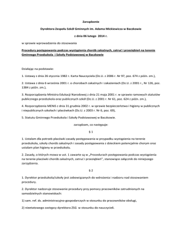 Zarządzenie Dyrektora Zespołu Szkół Gminnych im. Adama Mickiewicza w Baczkowie z dnia 06 lutego 2014 r. w sprawie wprowadzenia do stosowania Procedury postępowania podczas wystąpienia chorób zakaźnych, zatruć i przeziębień na terenie Gminnego Przedszkola i Szkoły Podstawowej w Baczkowie Działając na podstawie: 1. Ustawy z dnia 26 stycznia 1982 r. Karta Nauczyciela (Dz.U. z 2006 r. Nr 97, poz. 674 z późn. zm.), 2. Ustawa z dnia 6 września 2001 r. o chorobach zakaźnych i zakażeniach (Dz.U. z 2001 r., Nr 126, poz. 1384 z późn. zm.), 3. Rozporządzenia Ministra Edukacji Narodowej z dnia 21 maja 2001 r. w sprawie ramowych statutów publicznego przedszkola oraz publicznych szkół (Dz.U. z 2001 r. Nr 61, poz. 624 z późn. zm.), 4. Rozporządzenia MENiS z dnia 31 grudnia 2002 r. w sprawie bezpieczeństwa i higieny w publicznych i niepublicznych szkołach i placówkach (Dz.U. z 2003 r. Nr 6, poz. 69), 5. Statutu Gminnego Przedszkola i Szkoły Podstawowej w Baczkowie. zarządzam, co następuje: §1 1. Ustalam dla potrzeb placówki zasady postępowania w przypadku wystąpienia na terenie przedszkola, szkoły chorób zakaźnych i zasady postępowania z dzieckiem potencjalnie chorym oraz ustalam plan higieny w przedszkolu. 2. Zasady, o których mowa w ust. 1 zawarte są w „Procedurach postępowania podczas wystąpienia na terenie placówki chorób zakaźnych, zatruć i przeziębień”, stanowiące załącznik do niniejszego zarządzenia. §2 1. Dyrektor przedszkola/szkoły jest zobowiązanych do wdrożenia i nadzoru nad stosowaniem procedury. 2. Dyrektor nadzoruje stosowanie procedury przy pomocy pracowników zatrudnionych na samodzielnych stanowiskach: 1) sam. ref. ds. administracyjno-gospodarczych w stosunku do pracowników obsługi, 2) nieetatowego zastępcy dyrektora ZSG w stosunku do nauczycieli. 3. Do przestrzegania postanowień niniejszej procedury zobowiązani są wszyscy pracownicy przedszkola i szkoły. §3 Zobowiązuję pracowników na samodzielnych stanowiskach, o których mowa w § 2 ust 2 zarządzenia do: 1) zapoznania podległych pracowników z procedurami, 2) zorganizowania i zapewnienia skutecznej i efektywnej kontroli przestrzegania przez podległych pracowników procedur i planu higieny w przedszkolu i szkole, 3) zapoznania rodziców naszych wychowanków z procedurami, 4) zapewnienia realizacji niniejszego zarządzenia. §4 Zarządzenie wchodzi w życie z dniem podpisania, z mocą obowiązującą od 07 lutego 2014 roku. §5 Wykonanie zarządzenia powierza się dyrektorowi ZSG w Baczkowie. Dyrektor Wiesława Kowalska Zarządzenie przekazać do wiadomości: Nauczycielom. Rodzicom wychowanków. Pracownikom administracji i obsługi. ROZDZIAŁ I CEL PROCEDURY §1 1. Podstawowym celem organu prowadzącego przedszkole/szkołę jest zapewnienie dzieciom bezpieczeństwa i utrzymanie higienicznych warunków w placówkach. 2. Bezpieczeństwo wychowanków może być zagrożone, gdy zdrowe dzieci są zmuszone do kontaktu z chorymi w grupie. 3. Placówka nie może represjonować żadnego dziecka, a kwestia oceny, czy jest ono przeziębione i zaraża, czy zdrowe, jest kwestią subiektywną. Nauczyciel czy dyrektor nie może odmówić przyjęcia dziecka potencjalnie chorego. §2 1. Celem niniejszej procedury jest ustalenie zasad postępowania z dziećmi potencjalnie chorymi oraz ustalenie planów higieny w przedszkolu tak, aby zdrowe dzieci nie były narażane na niebezpieczeństwo zarażenia się od dziecka chorego lub ustalenie działań, które zminimalizują to ryzyko. 2. Niniejsza procedura jest tylko wytyczną do postępowania, jednak wszystko jest kwestią zdrowego rozsądku, rozmów i współpracy z rodzicami. ROZDZIAŁ II PRZEDMIOT I ZAKRES STOSOWANIA PROCEDURY §3 1. Przedmiotem procedury jest: 1) określenie zasad postępowania z dzieckiem potencjalnie chorym, 2) określenie zasad postępowania z dzieckiem chorym – objawy chorób, 3) określenie zasad higieny w przedszkolu. 2. Zakres stosowania dotyczy wszystkich pracowników placówek przedszkola, wychowanków przedszkola, a także rodziców i opiekunów prawnych wychowanków placówki. ROZDZIAŁ III DEFINICJE I TERMINY §4 1. Choroba – jedno z podstawowych pojęć medycznych; ogólne określenie każdego odstępstwa od pełni zdrowia organizmu. Zdefiniowanie stanu chorobowego jest tak samo trudne, jak sprecyzowanie stanu pełni zdrowia. Choroba polega na zaburzeniu funkcji lub uszkodzeniu struktury organizmu. O zaistnieniu choroby można mówić wtedy, gdy działanie czynnika chorobotwórczego wywołuje niepożądane objawy, różniące się od czynności zdrowego organizmu. 2. Przeziębienie – wirusowa infekcja górnych dróg oddechowych. Główne objawy to katar, kaszel, ból gardła i podwyższona temperatura ciała. Objawy zwykle ustępują po 5–7 dniach. 3. Zatrucie - zespół objawów chorobowych wywołanych działaniem trucizny na organizm. 4. Wirusy (łac. virus – trucizna, jad) – skomplikowane cząsteczki organiczne niemające struktury komórkowej, zbudowane z białek i kwasów nukleinowych. Zawierają materiał genetyczny w postaci RNA (wirusy RNA) lub DNA, wykazują jednak zarówno cechy komórkowych organizmów żywych, jak i materii nieożywionej. 5. Bakterie (łac. bacteria, od gr. bakterion – pałeczka) – grupa mikroorganizmów, stanowiących osobne królestwo. Są to jednokomórkowce lub zespoły komórek o budowie prokariotycznej. 6. Choroby zakaźne, choroby infekcyjne – grupa chorób ludzi, będących następstwem zakażenia ustroju czynnikiem zakaźnym i złamania sił odpornościowych organizmu (lub w odwrotnej kolejności) lub obecności w organizmie bioaktywnych toksyn (jadów) drobnoustrojów. Do niedawna mianem choroby zakaźnej określano choroby wywoływane także przez robaki (np. owsica), pierwotniaki (np. malaria) i małe stawonogi (np. wszawica). Obecnie te choroby nazywane są chorobami pasożytniczymi. Choroba zakaźna, która może łatwo przenosić się po