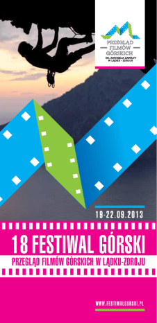 WST¢PNIAK Góry Stołowe i Broumowskie Steny to prawdziwy raj dla miłośników nart biegowych, rakiet śnieżnych, słowem - dla entuzjastów zimowej wędrówki wśród wspaniałych krajobrazów. Nasza wypożyczalnia przy Schronisku PTTK Pasterka oferuje sprzęt nowy sprzęt najwyższej klasy firmy Salomon. Również mamy specjalną przyczepkę do przewożenia jednego lub dwóch dzieci. Ceny wypożyczenia od 15 zł/dzień za komplet (narty, buty, kijki). Przegląd nigdy nie był tylko festiwalem lub tylko okazją do spotkań. W Lądku powstawały projekty następnych wypraw i w Lądku wykuwała się historia polskiego himalaizmu, przynajmniej w jakiejś części. Tu zawiązywały się przyjaźnie, tu miały początek małżeństwa. Widziałem, jak rodzice przyjeżdżają ze swoimi nastoletnimi dziećmi, a później te dzieci, już jako osoby dorosłe, przywożą własne filmy. Wiele filmów powstało specjalnie na Przegląd. Gdyby nie lądeckie spotkania, nigdy by ich nie było… Mam wrażenie, że na Przeglądzie wychowało się i wyrosło całe pokolenie. Że wizyty w Lądku były dla wielu ludzi ważnym doświadczeniem, że zostawiło w nich ślad. Dlatego cieszę się, że mogłem w tym uczestniczyć. Zbyszek Piotrowicz Bardzo się cieszę że 19 września już po raz osiemnasty rusza w Lądku-Zdroju Przegląd Filmów Górskich im. Andrzeja Zawady. Osiemnaście edycji Przeglądu to bardzo dużo. To spory kawałek współczesnej historii Lądka. Oczywiście to niewiele w porównaniu z ośmioma wiekami naszego kurortu, ale sporo choćby z perspektywy każdego człowieka. A Przegląd to ludzie! Ludzie gór, miłośnicy podróży, przygód. Ludzie pozytywnie zakręceni na poznawanie świata, mierzenie się z naturą i samym sobą. To wszystko tworzy niepowtarzalną atmosferę, jakże inną od codziennej ciszy i spokoju kurortu. Z radością witam w Lądku-Zdroju gości Przeglądu Filmów Górskich im. Andrzeja Zawady. Życzę wszystkim, by uczestnictwo w tegorocznym Przeglądzie było inspiracją do realizacji własnych marzeń o bliskich i dalekich podróżach, poznawania świata i samych siebie. Dobrej Zabawy! Kazimierz Szkudlarek Wszyscy wiedzą, że ludzie gór to jedna wielka rodzina, w której każdy za każdego by rękę oddał. No palec w każdym razie na pewno. Jednak podczas zeszłorocznego Przeglądu zauważyłem, że te odwieczne prawa przyrody przestają obowiązywać kiedy trzeba stanąć do walki o fotel w Kinoteatrze, podczas co ciekawszych prezentacji. Co się wtedy nie działo… Hasła “ale ja zdobyłem Everest!!!” tłumione były przez wyprzedzający tłum który rzucał tylko “a ja dwa razy!”. Ten, co go zdobył zimą, w ogóle by nie wszedł, ale okazało się, że to jego prezentacja, więc chcąc nie chcąc złowrogi tłum wciągnął powietrze i wpuścił prelegenta na scenę. Wiek, płeć, staż społeczny, ilość punktów GOT, nic się nie liczyło! Aby uniknąć zawieszania zasad na kołku w tym roku mamy trzy razy bardziej pojemną salę Wielki Namiot na prawie 1000 osób. Miejmy nadzieję, że się zmieścimy! Maciek Sokołowski WSTĘPNIAK 3 KOMITET ORGANIZACYJNY ZBYSZEK PIOTROWICZ honorowy przewodniczący komitetu organizacyjnego MACIEK SOKOŁOWSKI / Szef Festiwalu MATEUSZ KURDZIEL / Zastępca szefa Festiwalu, EWA JASZEK / Szefowa Biura Festiwalowego KATARZYNA BIERNACKA / dobór filmów ADRIANNA PŁUCIENNIK / koordynacja wolontariuszy MONIKA STROJNY / PR & Media, koordynacja program WOJTEK HELIŃSKI / prowadzenie i oprawa artystyczna PIOTR HERCOG / zawody Lądek Trail ŁUKASZ BUSZKA / projekty graficzne GRZEGORZ PIETRZAK / webmastering DAMIAN WODECKI / przygotowanie emisji Jakub Morisson / Telewizja Festiwalowa WOJCIECH SZYMAŃSKI koncert “W Górach jest wszystko co kocham” SYLWESTAR KOŹMIC / szef ekipy technicznej SEBASTIAN DZIURDZIKOWSKI / szef Wielkiego Namiotu EMANUEL LIS / szef obiektu Geovita EWA KANIEWSKA / szef obiektu Kinoteatr/Amfiteatr KAROLINA SZAMBORSKA / księżniczka WWW.FESTIWALGORSKI.PL 4 KOMITET ORGANIZACYJNY JURORZY FILMOWI Reżyser telewizyjny i filmowy, operator (absolwent PWSTiF w Łodzi), taternik, himalaista, podróżnik. Działalność filmową w znacznej części związał z górami. Jako filmowiec i alpinista brał udział m.in. w podróży na Mount Everest (1971 - jako pierwszy Polak), oraz na oba bieguny. W 2004 roku jego film “Odwrót” zdobył Grand Prix prestiżowego Banff Mountain Film Festival. W roku 2005 jako jedyny Polak został uhonorowany nagrodą Camera Extreme. JURORZY KSIÑ˚KOWI Taternik, alpinista, wieloletni kierownik i profesor Zakładu Alpinizmu AWF w Krakowie, z wykształcenia polonista. Pod koniec lat 60. i w latach 70. XX wieku intensywnie uprawiał taternictwo i alpinizm, wspinając się m.in. w Górach Spitsbergenu, Hindukuszu, Kaukazie i Górach Ałtaju. Polski szermierz, taternik i alpinista, dwukrotny indywidualny (1961 i 1965) mistrz Polski w szpadzie, uczestnik Olimpiady w 1960 r. Spośród jego wspinaczkowych osiągnięć w latach 60. i 70. warto wyróżnić wytyczanie nowych dróg na europejskie szczyty oraz trzy owocne wyprawy w Himalaje i Karakorum.. Absolwent Łódzkiej Szkoły Filmowej, od 2000 roku współpracownik TVN. Uczestnik wielu wypraw do Azji i Afryki. Autor kilkunastu filmów dokumentalnych dla kanału Discovery Historia - w tym przede wszystkim wielokrotnie nagradzanego cyklu “Himalaiści”. Współautor scenariuszy oraz producent filmów fabularnych “Mój biegun” oraz “Cisza”. W 2011 roku wraz z Wojtkiem Słotą zrealizował nagrodzony na wielu festiwalach film “Sztuka wolności” . Polski alpinista i himalaista. Jako trzeci Polak w historii zdobył wszystkie 14 szczytów Himalajów i Karakorum, liczących powyżej 8000 m n.p.m. Koronę zamknęło wejście na Annapurnę w 2010 r. Do 2007 redaktor naczelny miesięcznika górskiego “n.p.m.”, kilkukrotny prezes Akademickiego Klubu Górskiego w Łodzi, laureat prestiżowej Nagrody Explorera, nadawane