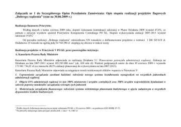 Załącznik nr 1 do Szczegółowego Opisu Przedmiotu Zamówienia: Opis stopnia realizacji projektów flagowych „Dobrego rządzenia” (stan na 30.06.2009 r.) Realizacja finansowa Priorytetu: Według danych z końca czerwca 2009 roku, stopień wykonania kontraktacji załoŜonej w Planie Działania 2009 wyniósł 47,6%, co jednym z niŜszym wyników spośród Priorytetów Komponentu Centralnego PO KL. Stopień wykorzystania alokacji 2007-2013 wyniósł natomiast 19,4%1 Od początku realizacji „Dobrego rządzenia” zatwierdzono 528 wniosków o dofinansowanie projektów o wartości 1 206 545 619 zł. Dodatkowo 23 wnioski na ogólną pulę 54 744 290 zł znajdują się obecnie w trakcie oceny Realizacja projektów w Priorytecie V PO KL przez poszczególne instytucje: A. Kancelaria Prezesa Rady Ministrów Kancelaria Prezesa Rady Ministrów odpowiada za realizację Działania 5.1 Wzmocnienie potencjału administracji rządowej. Alokacja na Działanie na lata 2007-2013 wynosi 103 583 000 euro2 (ok. 430 mln zł). Wartość podpisanych umów do dnia 30 czerwca 2009 r. wynosiła 173 941 736,85 zł (co stanowiło 40,5% alokacji planowanej do wykorzystania na lata 2007-2013). Kancelaria Prezesa Rady Ministrów odpowiada za osiągnięcie trzech oczekiwanych efektów wsparcia w Priorytecie V: 1. Usprawnienie zarządzania zasobami ludzkimi: wdroŜenie nowego systemu kształtowania wynagrodzeń we wszystkich jednostkach administracji rządowej 2. Objęcie 65% administracji rządowej (w tym 100% ministerstw i urzędów centralnych oraz 100% urzędów wojewódzkich) działaniami w zakresie poprawy standardów zarządzania wewnątrz tych jednostek 3. Modernizacja zarządzania finansowego: wdroŜenie systemu wieloletniego planowania budŜetowego w ujęciu zadaniowym u wszystkich dysponentów środków budŜetowych. 1 2 Źródło danych: Informacja miesięczna na temat wdraŜania PO KL z 30 czerwca 2009 r. na podstawie KSI SIMIK 07-13. Na potrzeby niniejszego opisu przyjęto przelicznik: 1 euro = 4, 1465 zł Realizowane projekty systemowe IP II w Działaniu 5.1: Poddzia łanie Projekt Beneficjent Okres realizacji 5.1.1 Przeprowadzenie badania i analiza potrzeb szkoleniowych, opracowanie planu działań (strategii szkoleniowej) w słuŜbie publicznej na lata 2008-2010 oraz realizacja szkoleń Departament SłuŜby Cywilnej i Państwowego Zasobu Kadrowego 01.04.2008 30.06.2009 – 6 813 965 PodwyŜszenie kwalifikacji kadr administracji rządowej poprzez przyszkolnie pracowników realizujących zadania nałoŜone na tę administrację. 8% 5.1.1 Wartościowanie stanowisk pracy oraz zmiany w systemie wynagrodzeń administracji rządowej Departament SłuŜby Cywilnej i Państwowego Zasobu Kadrowego 01.04.2008 30.06.2009 – 5 378 997 Zwiększenie zdolności urzędów zatrudniających członków korpusu słuŜby cywilnej do wykorzystywania nowoczesnych narzędzi zarządzania zasobami ludzkimi i efektywnego zarządzania wynagrodzeniami 38% 5.1.1 Poprawa zdolności zarządczych w urzędach administracji rządowej Departament SłuŜby Cywilnej i Państwowego Zasobu Kadrowego 01.04.2008 31.12.2009 – 7 701 942 Upowszechnienie stosowania kompleksowego zarządzania jakością w urzędach administracji rządowej 18% 5.1.1 Opracowanie koncepcji systemu opisów stanowisk pracy i wartościowania wysokich stanowisk państwowych oraz powiązania jego wyników z systemem wynagrodzeń Departament SłuŜby Cywilnej i Państwowego Zasobu Kadrowego 07.04.2008 31.05.2009 – 545 347 Wzrost przejrzystości administracji publicznej w wyniku standaryzacji procesu zarządzania zasobami ludzkimi. 12% 5.1.1 Szkolenia osób powołanych na wysokie stanowiska państwowe z państwowego zasobu kadrowego Departament SłuŜby Cywilnej i Państwowego Zasobu Kadrowego 07.04.2008 31.03.2009 – 5 310 747 Podniesienie konkurencyjności polskiej gospodarki w wyniku budowy sprawnej, przejrzystej i przyjaznej administracji publicznej. 42% 5.1.1 Poprawa jakości zarządzania w administracji rządowej Akademia Zarządzania Publicznego II etap Departament Cywilnej KPRM SłuŜby 01.04.2009 31.12.2010 - 8 434 912 poprawa efektywności funkcjonowania i potencjału polskiej administracji publicznej 0% 5.1.1 Podniesienie jakości procesów decyzyjnych w administracji rządowej poprzez wykorzystanie potencjału środowisk naukowych i eksperckich Departament SłuŜby Cywilnej i Państwowego Zasobu Kadrowego 01.04.2009 31.12.2010 - 3 694 539 Usprawnienie mechanizmów decyzyjnych podejmowanych w administracji rządowej, a w konsekwencji sprawne i efektywne nią zarządzanie. 0% 5.1.1 Modernizacja systemów zarządzania i podnoszenie kompetencji kadr poprzez realizację wdroŜeń usprawniających Departament Cywilnej KPRM 01.04.2009 31.12.2011 - 5 405 400 Modernizacja systemów zarządzania oraz podnoszenie kompetencji kadr w administracji rządowej poprzez realizację ok. 30 wdroŜeń 0% SłuŜby Wartość projektu: Cel ogólny: Postęp finans. ukierunkowanych na poprawę procesów zarządzania w administracji rządowej usprawniających wybranych w trybie otwartej aplikacji, zgłaszanych przez urzędy administracji rządowej funkcjonujące na obszarze całego kraju, ukierunkowanych na poprawę procesów zarządzania. 5.1.1 Strategia zarządzania zasobami ludzkimi w słuŜbie cywilnej Departament SłuŜby Cywilnej i Państwowego Zasobu Kadrowego 01.04.2009 31.12.2011 - 10 289 848 Usprawnienie systemów zarządzania zasobami ludzkimi poprzez opracowanie i wdroŜenie strategii zarządzania zasobami ludzkimi 0% 5.1.1 WdroŜenie strategii szkoleniowej Departament Cywilnej KPRM SłuŜby 01.07.2009 31.12.2011 - 19 598 585 Stworzenie spójnej dla całej administracji rządowej polityki szkoleniowej 0% 5.1.2 Przygotowanie administracji rządowej do sporządzania zadaniowego planu wydatków na rok 2008 Departament BudŜetu Zadaniowego KPRM 01.06.2007 15.05.2008 - 2 468 060 PodwyŜszenie kompetencji pracowników dysponentów głównych w zakresie sporządzania zadanioweg