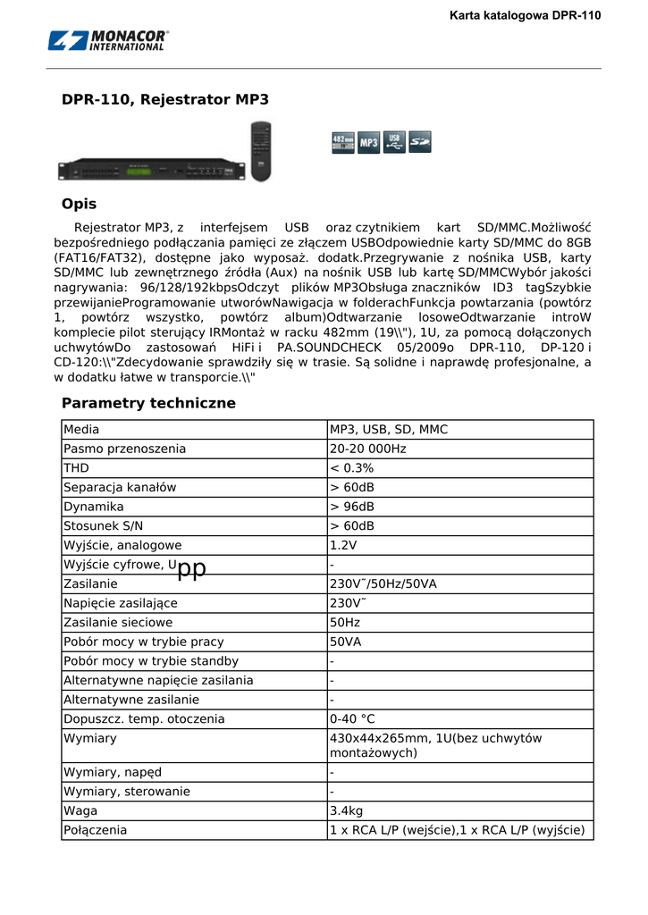 Karta katalogowa DPR-110 DPR-110, Rejestrator MP3 Opis Rejestrator MP3, z interfejsem USB oraz czytnikiem kart SD/MMC.Możliwość bezpośredniego podłączania pamięci ze złączem USBOdpowiednie karty SD/MMC do 8GB (FAT16/FAT32), dostępne jako wyposaż. dodatk.Przegrywanie z nośnika USB, karty SD/MMC lub zewnętrznego źródła (Aux) na nośnik USB lub kartę SD/MMCWybór jakości nagrywania: 96/128/192kbpsOdczyt plików MP3Obsługa znaczników ID3 tagSzybkie przewijanieProgramowanie utworówNawigacja w folderachFunkcja powtarzania (powtórz 1, powtórz wszystko, powtórz album)Odtwarzanie losoweOdtwarzanie introW komplecie pilot sterujący IRMontaż w racku 482mm (19\\"), 1U, za pomocą dołączonych uchwytówDo zastosowań HiFi i PA.SOUNDCHECK 05/2009o DPR-110, DP-120 i CD-120:\\"Zdecydowanie sprawdziły się w trasie. Są solidne i naprawdę profesjonalne, a w dodatku łatwe w transporcie.\\" Parametry techniczne Media MP3, USB, SD, MMC Pasmo przenoszenia 20-20 000Hz THD < 0.3% Separacja kanałów > 60dB Dynamika > 96dB Stosunek S/N > 60dB Wyjście, analogowe 1.2V pp Wyjście cyfrowe, U - Zasilanie 230V˜/50Hz/50VA Napięcie zasilające 230V˜ Zasilanie sieciowe 50Hz Pobór mocy w trybie pracy 50VA Pobór mocy w trybie standby - Alternatywne napięcie zasilania - Alternatywne zasilanie - Dopuszcz. temp. otoczenia 0-40 °C Wymiary 430x44x265mm, 1U(bez uchwytów montażowych) Wymiary, napęd - Wymiary, sterowanie - Waga 3.4kg Połączenia 1 x RCA L/P (wejście),1 x RCA L/P (wyjście)