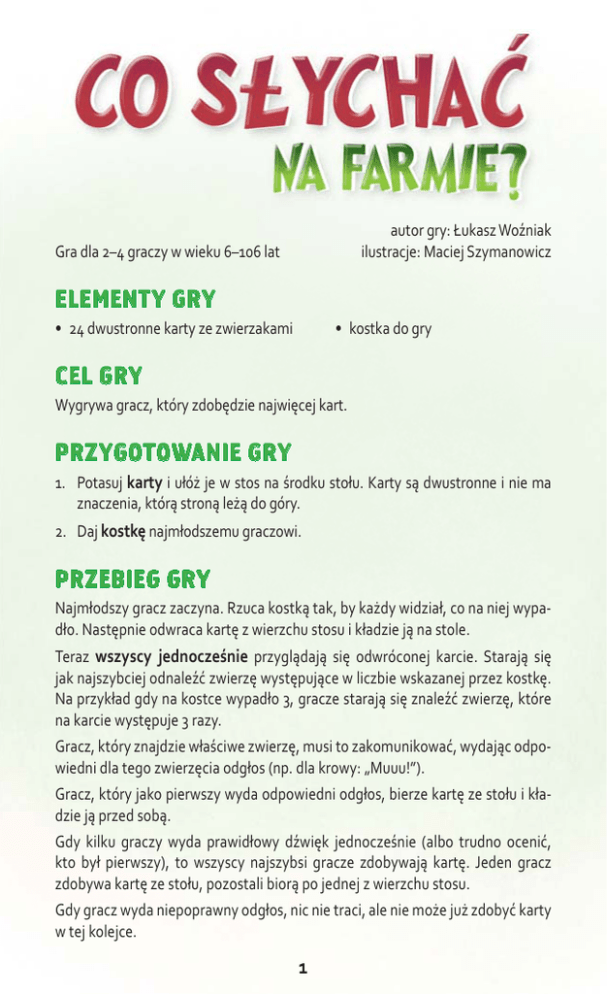 autor gry: Łukasz Woźniak ilustracje: Maciej Szymanowicz Gra dla 2–4 graczy w wieku 6–106 lat ELEMENTY GRY • 24 dwustronne karty ze zwierzakami • kostka do gry CEL GRY Wygrywa gracz, który zdobędzie najwięcej kart. PRZYGOTOWANIE GRY 1. Potasuj karty i ułóż je w stos na środku stołu. Karty są dwustronne i nie ma znaczenia, którą stroną leżą do góry. 2. Daj kostkę najmłodszemu graczowi. PRZEBIEG GRY Najmłodszy gracz zaczyna. Rzuca kostką tak, by każdy widział, co na niej wypadło. Następnie odwraca kartę z wierzchu stosu i kładzie ją na stole. Teraz wszyscy jednocześnie przyglądają się odwróconej karcie. Starają się jak najszybciej odnaleźć zwierzę występujące w liczbie wskazanej przez kostkę. Na przykład gdy na kostce wypadło 3, gracze starają się znaleźć zwierzę, które na karcie występuje 3 razy. Gracz, który znajdzie właściwe zwierzę, musi to zakomunikować, wydając odpowiedni dla tego zwierzęcia odgłos (np. dla krowy: „Muuu!”). Gracz, który jako pierwszy wyda odpowiedni odgłos, bierze kartę ze stołu i kładzie ją przed sobą. Gdy kilku graczy wyda prawidłowy dźwięk jednocześnie (albo trudno ocenić, kto był pierwszy), to wszyscy najszybsi gracze zdobywają kartę. Jeden gracz zdobywa kartę ze stołu, pozostali biorą po jednej z wierzchu stosu. Gdy gracz wyda niepoprawny odgłos, nic nie traci, ale nie może już zdobyć karty w tej kolejce. 1 MIAUUU! KOKOKO! ZUZIA MARCIN Przykład Na kostce wypadło 6. Trzeba znaleźć zwierzę, które na karcie występuje 6 razy. Marcin gdacze, ale jest to niepoprawny dźwięk, bo kura występuje tylko 5 razy. Zuzia miauczy i zdobywa kartę, bo kot występuje na karcie 6 razy. Nowa kolejka Gracz, który zdobył kartę, rozpoczyna nową kolejkę – rzuca kostką i odwraca kolejną kartę. Gracze ponownie starają się znaleźć odpowiednie zwierzę. KONIEC GRY Gra się kończy, gdy ostatnia karta ze stosu zostanie zdobyta. Wygrywa gracz, który zebrał najwięcej kart. W razie remisu wygrywa gracz, który wyda głośniejszy ryk krowy. GĘGĘ! GĘ BEEE! KOKO! KO UHAU! HA AA IHH A! GU LGUL! KU EGMONT Polska Sp. z o.o. ul. Dzielna 60, 01-029 Warszawa www.egmont.pl © 2015 Egmont Polska Sp. z o.o. Autor: Łukasz Woźniak Ilustracje: Maciej Szymanowicz Wydawca: Tomasz Kołodziejczak Redakcja: Patryk Blok Koordynacja produkcji: Agnieszka Kupczyk Opracowanie graficzne i DTP: Cezary Szulc 2 MKUM AUUU! MI MEEE! BZZZ! CHRUM! ! MUUU! GRĘ POLECAJĄ: