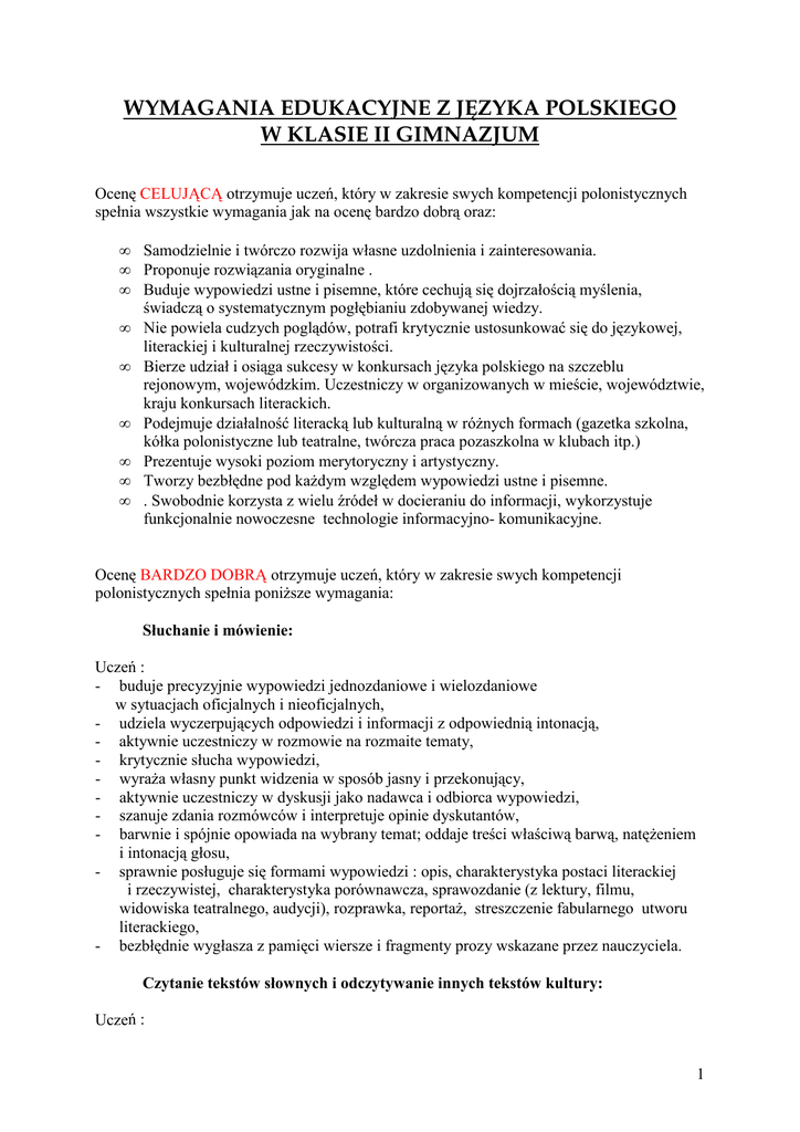 WYMAGANIA EDUKACYJNE Z JĘZYKA POLSKIEGO W KLASIE II GIMNAZJUM Ocenę CELUJĄCĄ otrzymuje uczeń, który w zakresie swych kompetencji polonistycznych spełnia wszystkie wymagania jak na ocenę bardzo dobrą oraz: • • • • • • • • • Samodzielnie i twórczo rozwija własne uzdolnienia i zainteresowania. Proponuje rozwiązania oryginalne . Buduje wypowiedzi ustne i pisemne, które cechują się dojrzałością myślenia, świadczą o systematycznym pogłębianiu zdobywanej wiedzy. Nie powiela cudzych poglądów, potrafi krytycznie ustosunkować się do językowej, literackiej i kulturalnej rzeczywistości. Bierze udział i osiąga sukcesy w konkursach języka polskiego na szczeblu rejonowym, wojewódzkim. Uczestniczy w organizowanych w mieście, województwie, kraju konkursach literackich. Podejmuje działalność literacką lub kulturalną w różnych formach (gazetka szkolna, kółka polonistyczne lub teatralne, twórcza praca pozaszkolna w klubach itp.) Prezentuje wysoki poziom merytoryczny i artystyczny. Tworzy bezbłędne pod każdym względem wypowiedzi ustne i pisemne. . Swobodnie korzysta z wielu źródeł w docieraniu do informacji, wykorzystuje funkcjonalnie nowoczesne technologie informacyjno- komunikacyjne. Ocenę BARDZO DOBRĄ otrzymuje uczeń, który w zakresie swych kompetencji polonistycznych spełnia poniższe wymagania: Słuchanie i mówienie: Uczeń : - buduje precyzyjnie wypowiedzi jednozdaniowe i wielozdaniowe w sytuacjach oficjalnych i nieoficjalnych, - udziela wyczerpujących odpowiedzi i informacji z odpowiednią intonacją, - aktywnie uczestniczy w rozmowie na rozmaite tematy, - krytycznie słucha wypowiedzi, - wyraża własny punkt widzenia w sposób jasny i przekonujący, - aktywnie uczestniczy w dyskusji jako nadawca i odbiorca wypowiedzi, - szanuje zdania rozmówców i interpretuje opinie dyskutantów, - barwnie i spójnie opowiada na wybrany temat; oddaje treści właściwą barwą, natężeniem i intonacją głosu, - sprawnie posługuje się formami wypowiedzi : opis, charakterystyka postaci literackiej i rzeczywistej, charakterystyka porównawcza, sprawozdanie (z lektury, filmu, widowiska teatralnego, audycji), rozprawka, reportaż, streszczenie fabularnego utworu literackiego, - bezbłędnie wygłasza z pamięci wiersze i fragmenty prozy wskazane przez nauczyciela. Czytanie tekstów słownych i odczytywanie innych tekstów kultury: Uczeń : 1 - płynnie i bezbłędnie czyta z właściwą intonacją, interpretacyjnie czyta teksty epickie, liryczne i dramatyczne, krytycznie, cicho czyta teksty inspirujące do konstruktywnego myślenia i działania, wykorzystuje i modyfikuje informacje zawarte w tekście, cytuje, zna literackie środki wyrazu, a także środki wyrazu teatru, filmu i mediów, umie krytycznie analizować treści przekazów medialnych, analizuje i interpretuje reklamy, korzysta z różnego rodzaju słowników. Pisanie: Uczeń: - sprawnie redaguje wszystkie pisemne formy wypowiedzi objęte programowymi treściami nauczania: notatka (tradycyjna i według schematu), opis (przedmiotu, postaci, przeżycia wewnętrznego), charakterystyka postaci (jednej, dwóch, zbiorowości, autocharakterystyka), opowiadanie, opowiadanie z dialogiem, sprawozdanie typu recenzja, głos w dyskusji, list (otwarty, motywacyjny, prywatny), dziennik, pamiętnik, teksty publicystyczne (notatka prasowa, reportaż, artykuł), teksty użytkowe (ogłoszenia drobne, instrukcje, regulaminy), - umiejętnie i sprawnie stylizuje tekst (archaizacja, dialektyzacja), - tworzy przypisy i bibliografię. Nauka o języku: Uczeń sprawnie, świadomie i funkcjonalnie wykorzystuje wiedzę językową z zakresu: - Fonetyki i ortofonii (zagadnienia zawarte w programie nauczania klasy I gimnazjum oraz umiejętność prawidłowego akcentowania); - Fleksji (części mowy odmienne i nieodmienne, osobliwości w odmianie, funkcje części mowy w formach mówionych); - Składni (wypowiedzenia, równoważnik zdania, zdania pojedyncze, zdanie złożone – współrzędnie złożone, podrzędnie złożone podmiotowe, orzecznikowe, przydawkowe, dopełnieniowe i okolicznikowe); - Słowotwórstwa (budowa słowotwórcza wyrazu, analiza słowotwórcza wyrazu, złożenia, zestawienia, zrosty, wyrazy modalne, wulgaryzmy, neologizmy, emocjonalizmy, zapożyczenia); - Ortografii i interpunkcji (znajomość zasad i reguł ortograficznych i interpunkcyjnych oraz umiejętność ich zastosowania udokumentowana bezbłędnym zapisem tekstu). Lektura: Uczeń: - bardzo dobrze zna wszystkie wskazane przez nauczyciela lektury programowe, co świadczy o świadomym i krytycznym zapoznaniu się z ich treścią, - w wypowiedziach ustnych stosuje dojrzały i krytyczny komentarz, - aktywnie uczestniczy w dyskusji nad lekturą, - oryginalnie, samodzielnie, krytycznie, na wysokim poziomie literackim tworzy prace pisemne, - dogłębnie zna biogramy autorów lektur. 2 Pojęcia: Uczeń bezbłędnie wskazuje, nazywa i definiuje obowiązujące według ustaleń programowych pojęcia teoretycznoliterackie, językowe i kulturowe, czynnie posługuje się nimi w pracach pisemnych i wypowiedziach ustnych. Ocenę DOBRĄ otrzymuje uczeń, który w zakresie swych kompetencji polonistycznych spełnia poniższe wymagania: Słuchanie i mówienie: Uczeń: - buduje precyzyjne wypowiedzi jednozdaniowe i wielozdaniowe w sytuacjach oficjalnych i nieoficjalnych, - udziela wyczerpujących odpowiedzi i informacji z odpowiednią intonacją, - aktywnie uczestniczy w rozmowie na rozmaite tematy, - krytycznie słucha wypowiedzi, - wyraża własny punkt widzenia w sposób jasny i przekonujący, - aktywnie uczestniczy w dyskusji jako nadawca i odbiorca wypowiedzi, - szanuje zdania rozmówcy i interpretuje opinie dyskutantów, - barwnie i spójnie opowiada na wybrany temat; oddaje treści właściwą barwą, natężeniem i intonacją głosu, - poprawnie posługuje się formami wypowiedzi: opis, charakterystyka postaci literackiej i rzeczywistej, cha