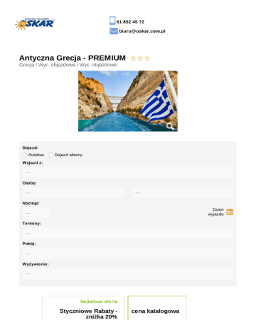 61 852 45 72 [email protected] Antyczna Grecja - PREMIUM Grecja / Wyc. objazdowe / Wyc. objazdowe Dojazd: Autobus Dojazd własny Wyjazd z: Osoby: Noclegi: Dzień wyjazdu Terminy: Pokój: Wyżywienie: Najtańsza oferta Styczniowe Rabaty zniżka 20% cena katalogowa Suma: do 10 marca 2017: 1399,00 zł do 10 marca 2017: 419,70 zł do 31 sierpnia 2017: 0,00 zł do 31 sierpnia 2017: 979,30 zł 1399,00 zł Suma: 1399,00 zł Opis oferty Miejscowość Przejazd autokarem PREMIUM autokar-premium-oskar-tablet-gniazdko-usb-wygodne-fotele Opinie Realizacja imprezy autokarami PREMIUM to gwarancja: transportu autokarami z roczników 2015 i 2016 produkcji Irizar i VDL Rozkład jazdy indywidualnego, multimedialnego systemu rozrywki - tablet z dotykowym ekranem w każdym zagłówku (filmy, gry, muzyka itp.). Możliwość podłączenia własnego nośnika danych poprzez wejście AUX lub USB. najwyższej klasy skórzanych lub półskórzanych foteli z możliwością regulacji oparcia lub/i zagłówka największej w Polsce przestrzeni między siedzeniami małej półki przed każdym siedzeniem + siateczki na czasopisma, książki czy telefon bezpłatnego dostępu do sieci WiFi na terenie Polski* gniazdek elektrycznych 230V wydajnej klimatyzacji sterowanej indywidualnie bogato wyposażonego barku udostępnionego w czasie jazdy WC na pokładzie autokaru Idealna i komfortowa podróż… ZAWSZE! Na ternie Polski GWARANTUJEMY, że wszystkie przejazdy realizowane są autobusem, busem lub samochodem osobowym. Zapewnimy komfortowy transport na każdym etapie podróży. Ważne: Autokar Premium jest autokarem docelowym. *jakość usług internetowych może różnić się w zależności od jakości sygnału TOUR GUIDE oprowadzanie z indywidualnym systemem nagłośnieniowym Mobilny zestaw audio: indywidulany zestaw słuchawkowy połączony bezprzewodowo z mikrofonem pilota/przewodnika. Zakwaterowanie Riwiera Olimpijska Studia 2 i 3 - osobowe z łazienkami, aneksami kuchennymi i lodówkami na Riwierze Olimpijskiej oddalone ok. 300 m od piaszczystych szerokich plaż. Studia mają balkony oraz możliwość klimatyzacji (płatna dodatkowo 5 €/doba); np. Willa Aegeon / Paralia Hotel ***- pokoje 2 i 3 - osobowe z łazienkami; np. Hotel Atlantis *** / Paralia Okolice Aten Hotel **/***- pokoje 2 i 3 - osobowe z łazienkami, np. Club Hotel Iliochari *** Przykładowe zakwaterowanie, które może różnić się w poszczególnych terminach. Dostępne opcje zakwaterowania: pokój 2 - osobowy pokój 3 - osobowy dokwaterowanie (bez dopłat*) lub pokój 1 - osobowy (dopłata) Dostępne opcje wyżywienia wyżywienie BB: 6 śniadań wyżywienie HB: 6 śniadań + 6 obiadokolacji; możliwość dokonania rezerwacji w wersji HB lub obowiązkowa dopłata do obiadokolacji 50 €/os. (płatne u pilota w autokarze) śniadania bufet: pieczywo, ser, szynka, jajka lub parówki itp., napoje: kawa, herbata, sok obiadokolacje serwowane: zupa, danie główne, sałatka, deser, owoc; napoje do obiadokolacji dodatkowo płatne Pakiet KOMFORT gwarancja wyboru miejsca w autokarze napoje w autokarze w cenie (6 x do wyboru: kawa, herbata, zimny napój 0,2l) cena: 50 zł/os Pakiet PRESTIGE gwarancja wyboru miejsca w autokarze napoje w autokarze w cenie (6 x do wyboru: kawa, herbata, zimny napój 0,2l) pierwszeństwo wejścia na pokład autokaru nadbagaż 5 kg w cenie napoje do obiadokolacji (0,2l) cena: 100 zł/os Warunki promocji FIRST MINUTE www.oskar.com.pl/zalaczniki/warunki_promocji Ubezpieczenie Warunki ubezpieczenia Bezpieczne Podróże Signal Iduna dokument do pobrania www.oskar.com.pl/zalaczniki/owu Warunki ubezpieczenia Kosztów Imprezy Turystycznej Signal Iduna dokument do pobrania www.oskar.com.pl/zalaczniki/owurg Turystyczny Fundusz Gwarancyjny W związku z powołaniem do życia w dniu 26.11.2016 Turystycznego Funduszu Gwarancyjnego każdy klient Biura Podróży Oskar zobowiązany jest do zapłaty kwoty w wysokości 10zł/os. przy każdorazowej rezerwacji imprezy turystycznej (obowiązuje od dnia 26.11.2016). Kwota przeznaczona na Turystyczny Fundusz Gwarancyjny zostanie automatycznie doliczona do wartości rezerwacji (w momencie jej dokonania). Wyjątkiem są imprezy turystyczne odbywające się w krajach posiadających granicę z Rzeczpospolitą Polską. Składka nie jest przychodem biura. Udogodnienia Regulowane fotele Tacki GPS Multimedia Nowoczesna flota Zawodowy kierowca Pasy bezpieczeństwa Toaleta w autokarze Podnóżki Bez paszportu Premium Elite Tour guide Program ramowy DZIEŃ 1 (sobota) Wyjazd z Polski zgodnie z rozkładem jazdy autokarów. Wyjazd z Polski w godzinach porannych/południowych, przejazd przez Słowację, Węgry, Serbię i Macedonię/Bułgarię. (Trasa od granicy ok. 1500 km) DZIEŃ 2 (niedziela) Przyjazd na Riwierę Olimpijską w godzinach popołudniowo - wieczornych. Zakwaterowanie. Obiadokolacja. Nocleg. DZIEŃ 3 (poniedziałek) Śniadanie. Przejazd w okolice Kalambaki - zwiedzanie klasztorów zawieszonych w chmurach M eteorów - jednego z cudów świata. To właśnie tutaj, na słupach skalnych, sięgających ok. 600 m n.p.m., średniowieczni mnisi wznieśli swoje siedziby. Najbardziej mistyczne miejsce w Grecji, znane z ascezy i modlitwy, nazywane przez Greków wiszącymi klasztorami. Monastery, wzniesione na poziomie niedostępnych skalnych szczytów, są unikatem zarówno pod względem architektonicznym, jak i widokowym. Tak wspaniałego dzieła ludzkiej wyobraźni, uporu, a przede wszystkim wiary, nie znajdziecie Państwo w żadnym innym zakątku tego kraju. Odwiedzając dwa, spośród sześciu czynnych klasztorów, można zapoznać się ze wspaniałą sztuką bizantyjską, która do dziś zachwyca swym ogromem i pięknem. Zwiedzanie wnętrz tych cudownych budowli, pozwala zapoznać się z ich bogatym wystrojem, zdobiącymi je średniowiecznymi freskami i ikonami. W programie zwiedzanie klasztorów oraz wytwórni ikon bizantyjskich. Przejazd na Riwierę Olimpijską. Obiadokolacja. Nocleg. (Trasa ok. 350 km) DZIEŃ 