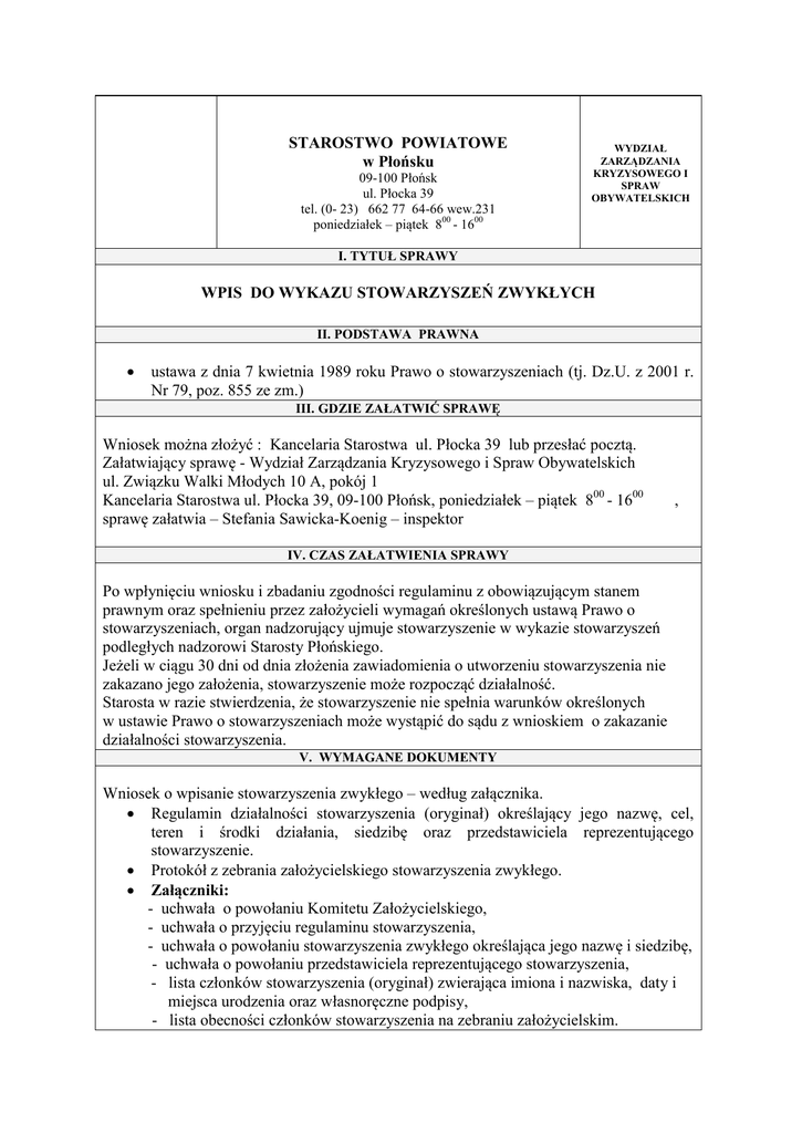STAROSTWO POWIATOWE w Płońsku 09-100 Płońsk ul. Płocka 39 tel. (0- 23) 662 77 64-66 wew.231 poniedziałek – piątek 800 - 1600 WYDZIAŁ ZARZĄDZANIA KRYZYSOWEGO I SPRAW OBYWATELSKICH I. TYTUŁ SPRAWY WPIS DO WYKAZU STOWARZYSZEŃ ZWYKŁYCH II. PODSTAWA PRAWNA ustawa z dnia 7 kwietnia 1989 roku Prawo o stowarzyszeniach (tj. Dz.U. z 2001 r. Nr 79, poz. 855 ze zm.) III. GDZIE ZAŁATWIĆ SPRAWĘ Wniosek można złożyć : Kancelaria Starostwa ul. Płocka 39 lub przesłać pocztą. Załatwiający sprawę - Wydział Zarządzania Kryzysowego i Spraw Obywatelskich ul. Związku Walki Młodych 10 A, pokój 1 Kancelaria Starostwa ul. Płocka 39, 09-100 Płońsk, poniedziałek – piątek 800 - 1600 sprawę załatwia – Stefania Sawicka-Koenig – inspektor , IV. CZAS ZAŁATWIENIA SPRAWY Po wpłynięciu wniosku i zbadaniu zgodności regulaminu z obowiązującym stanem prawnym oraz spełnieniu przez założycieli wymagań określonych ustawą Prawo o stowarzyszeniach, organ nadzorujący ujmuje stowarzyszenie w wykazie stowarzyszeń podległych nadzorowi Starosty Płońskiego. Jeżeli w ciągu 30 dni od dnia złożenia zawiadomienia o utworzeniu stowarzyszenia nie zakazano jego założenia, stowarzyszenie może rozpocząć działalność. Starosta w razie stwierdzenia, że stowarzyszenie nie spełnia warunków określonych w ustawie Prawo o stowarzyszeniach może wystąpić do sądu z wnioskiem o zakazanie działalności stowarzyszenia. V. WYMAGANE DOKUMENTY Wniosek o wpisanie stowarzyszenia zwykłego – według załącznika. Regulamin działalności stowarzyszenia (oryginał) określający jego nazwę, cel, teren i środki działania, siedzibę oraz przedstawiciela reprezentującego stowarzyszenie. Protokół z zebrania założycielskiego stowarzyszenia zwykłego. Załączniki: - uchwała o powołaniu Komitetu Założycielskiego, - uchwała o przyjęciu regulaminu stowarzyszenia, - uchwała o powołaniu stowarzyszenia zwykłego określająca jego nazwę i siedzibę, - uchwała o powołaniu przedstawiciela reprezentującego stowarzyszenia, - lista członków stowarzyszenia (oryginał) zwierająca imiona i nazwiska, daty i miejsca urodzenia oraz własnoręczne podpisy, - lista obecności członków stowarzyszenia na zebraniu założycielskim. VI. OPŁATY Nie podlega opłacie skarbowej. VII. DRUKI WNIOSKÓW Druk zgłoszenia organowi nadzorującemu utworzenie stowarzyszenia zwykłego - według załącznika. VIII. PROCEDURA ODWOŁAWCZA Sąd rejestrowy, na wniosek organu nadzorującego lub prokuratury, może zakazać założenia stowarzyszenia zwykłego, jeżeli nie spełnia ono warunków określonych w art. 16 ustawy z dnia 7 kwietnia 1989 roku Prawo o stowarzyszeniach (tj. Dz.U. z 2001 r. Nr 79, poz. 855 ze zm.) Opracowała : Stefania Sawicka-Koenig