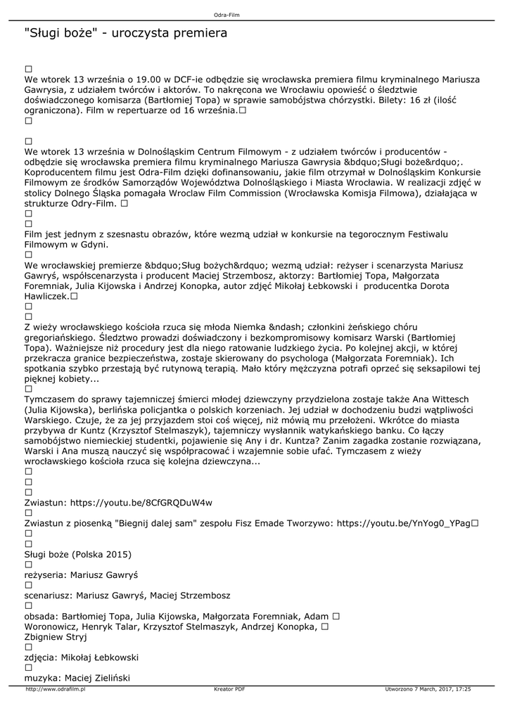 Odra-Film "Sługi boże" - uroczysta premiera We wtorek 13 września o 19.00 w DCF-ie odbędzie się wrocławska premiera filmu kryminalnego Mariusza Gawrysia, z udziałem twórców i aktorów. To nakręcona we Wrocławiu opowieść o śledztwie doświadczonego komisarza (Bartłomiej Topa) w sprawie samobójstwa chórzystki. Bilety: 16 zł (ilość ograniczona). Film w repertuarze od 16 września. We wtorek 13 września w Dolnośląskim Centrum Filmowym - z udziałem twórców i producentów odbędzie się wrocławska premiera filmu kryminalnego Mariusza Gawrysia „Sługi boże”. Koproducentem filmu jest Odra-Film dzięki dofinansowaniu, jakie film otrzymał w Dolnośląskim Konkursie Filmowym ze środków Samorządów Województwa Dolnośląskiego i Miasta Wrocławia. W realizacji zdjęć w stolicy Dolnego Śląska pomagała Wroclaw Film Commission (Wrocławska Komisja Filmowa), działająca w strukturze Odry-Film. Film jest jednym z szesnastu obrazów, które wezmą udział w konkursie na tegorocznym Festiwalu Filmowym w Gdyni. We wrocławskiej premierze „Sług bożych” wezmą udział: reżyser i scenarzysta Mariusz Gawryś, współscenarzysta i producent Maciej Strzembosz, aktorzy: Bartłomiej Topa, Małgorzata Foremniak, Julia Kijowska i Andrzej Konopka, autor zdjęć Mikołaj Łebkowski i producentka Dorota Hawliczek. Z wieży wrocławskiego kościoła rzuca się młoda Niemka – członkini żeńskiego chóru gregoriańskiego. Śledztwo prowadzi doświadczony i bezkompromisowy komisarz Warski (Bartłomiej Topa). Ważniejsze niż procedury jest dla niego ratowanie ludzkiego życia. Po kolejnej akcji, w której przekracza granice bezpieczeństwa, zostaje skierowany do psychologa (Małgorzata Foremniak). Ich spotkania szybko przestają być rutynową terapią. Mało który mężczyzna potrafi oprzeć się seksapilowi tej pięknej kobiety... Tymczasem do sprawy tajemniczej śmierci młodej dziewczyny przydzielona zostaje także Ana Wittesch (Julia Kijowska), berlińska policjantka o polskich korzeniach. Jej udział w dochodzeniu budzi wątpliwości Warskiego. Czuje, że za jej przyjazdem stoi coś więcej, niż mówią mu przełożeni. Wkrótce do miasta przybywa dr Kuntz (Krzysztof Stelmaszyk), tajemniczy wysłannik watykańskiego banku. Co łączy samobójstwo niemieckiej studentki, pojawienie się Any i dr. Kuntza? Zanim zagadka zostanie rozwiązana, Warski i Ana muszą nauczyć się współpracować i wzajemnie sobie ufać. Tymczasem z wieży wrocławskiego kościoła rzuca się kolejna dziewczyna... Zwiastun: https://youtu.be/8CfGRQDuW4w Zwiastun z piosenką "Biegnij dalej sam" zespołu Fisz Emade Tworzywo: https://youtu.be/YnYog0_YPag Sługi boże (Polska 2015) reżyseria: Mariusz Gawryś scenariusz: Mariusz Gawryś, Maciej Strzembosz obsada: Bartłomiej Topa, Julia Kijowska, Małgorzata Foremniak, Adam Woronowicz, Henryk Talar, Krzysztof Stelmaszyk, Andrzej Konopka, Zbigniew Stryj zdjęcia: Mikołaj Łebkowski muzyka: Maciej Zieliński http://www.odrafilm.pl Kreator PDF Utworzono 7 March, 2017, 17:25 Odra-Film gatunek: thriller/kryminalny dystrybucja: Next Film czas trwania: 101' http://www.odrafilm.pl Kreator PDF Utworzono 7 March, 2017, 17:25