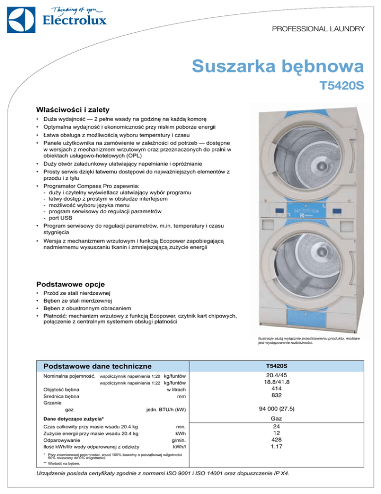 PROFESSIONAL LAUNDRY Suszarka bębnowa T5420S Właściwości i zalety • Duża wydajność — 2 pełne wsady na godzinę na każdą komorę • Optymalna wydajność i ekonomiczność przy niskim poborze energii • Łatwa obsługa z możliwością wyboru temperatury i czasu • Panele użytkownika na zamówienie w zależności od potrzeb — dostępne w wersjach z mechanizmem wrzutowym oraz przeznaczonych do pralni w obiektach usługowo-hotelowych (OPL) • Duży otwór załadunkowy ułatwiający napełnianie i opróżnianie • Prosty serwis dzięki łatwemu dostępowi do najważniejszych elementów z przodu i z tyłu • Programator Compass Pro zapewnia: - duży i czytelny wyświetlacz ułatwiający wybór programu - łatwy dostęp z prostym w obsłudze interfejsem - możliwość wyboru języka menu - program serwisowy do regulacji parametrów - port USB • Program serwisowy do regulacji parametrów, m.in. temperatury i czasu stygnięcia • Wersja z mechanizmem wrzutowym i funkcją Ecopower zapobiegającą nadmiernemu wysuszaniu tkanin i zmniejszającą zużycie energii Podstawowe opcje • • • • Przód ze stali nierdzewnej Bęben ze stali nierdzewnej Bęben z obustronnym obracaniem Płatność: mechanizm wrzutowy z funkcją Ecopower, czytnik kart chipowych, połączenie z centralnym systemem obsługi płatności Ilustracje służą wyłącznie przedstawieniu produktu, możliwe jest występowanie rozbieżności. Podstawowe dane techniczne Nominalna pojemność, Objętość bębna Średnica bębna Grzanie gaz T5420S współczynnik napełnienia 1:20 kg/funtów współczynnik napełnienia 1:22 kg/funtów w litrach mm jedn. BTU/h (kW) Dane dotyczące zużycia* Czas całkowity przy masie wsadu 20.4 kg Zużycie energii przy masie wsadu 20.4 kg Odparowywanie Ilość kWh/litr wody odparowanej z odzieży min. kWh g/min. kWh/l 20.4/45 18.8/41.8 414 832 94 000 (27.5) Gaz 24 12 428 1.17 * Przy znamionowej pojemności, wsad 100% bawełny o początkowej wilgotności 50% osuszany do 0% wilgotności. ** Wartość na bęben. Urządzenie posiada certyfikaty zgodnie z normami ISO 9001 i ISO 14001 oraz dopuszczenie IP X4. Połączenia elektryczne* Możliwe Napięcie Moc Moc rodzaje grzewcza całkowita podgrzewania Hz kW kW 1~ Podgrzewanie gazem 220–240V 50/60 - 50/60 - 50/60 - 220–240V 3~ 380-480V 3 ~ Zalecany bezpiecznik A A 1.4 10 1.4 10 1.4 10 Przyłącza gazu i powietrza 2 T5420S Gaz Ciśnienie gazu Gaz ziemny Propan Wylot powietrza Odprowadzane powietrze, gaz Spadek ciśnienia, gaz ISO 7/1-R Pa mbar Pa mbar ø mm m3/h Maks. w Pa 3/4” 1 2000 20 2800-5000 28-50 250 / 200 1020 300 C Poziomy hałasu 1 2 Poziom hałasu w powietrzu dB(A) <70 Ciepło emitowane % zainstalowanej mocy, maks. Dane transportowe** Strona przednia 15 netto, kg ze skrzynią, m3 B 438 2.95 3+4 H 5 Wymiary w mm A Szerokość B Głębokość C Wysokość D E F G H J K L M N1 N2 O P 1 2 3 4 5 868 1325 2144 1288 1222 262 186 1083 161 75 38 231 90 178 854 2175 Panel obsługi Otwór drzwiczek ø 686 mm Przyłącze elektryczne Przyłącze gazu Przyłącze wylotowe E D F G Strona lewa 5 J * Możliwe są również inne wartości napięcia, zob. instrukcja instalacji. ** Dane średnie. Waga brutto/objętość transportowa zależy od konfiguracji. W celu uzyskania dokładnych danych proszę skontaktować się z działem logistyki. N1 K N2 4 5 3 O Strona tylna www.electrolux.com/laundrysystems Share more of our thinking at www.electrolux.com Art. No. 438919536PL/2013.05.10 L Zastrzega się prawo do zmiany danych technicznym bez powiadomienia. P M