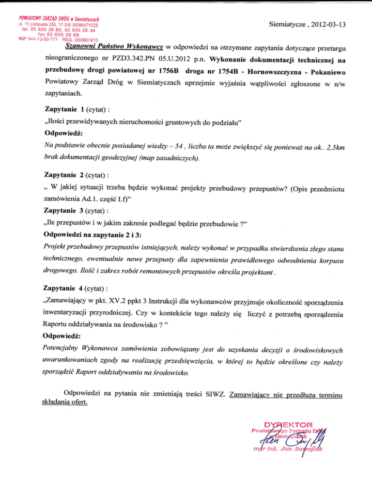 PllllilOw aą0 0łÓ€ v Siemląaoch Siemiatycze, 2012-03-13 ul, 11 Listopada 253, 17-300 SiEM|ATYCZE tel. 85 655 26 B0, 85 655 26 34 fax 85 655 26 68 NlP 544-13_00_171 REG, 050667410 Szanowni Państwo Wvkonawcv w odpowie dzi na otrzymane zapytania doĘczące przetargu nieograniczonego nr PZD3.342.PN 05.U.20I2 p.n. Wykonanie dokumentacji technicznej na Przebudowę drogi Powiatowej nr 17568 droga nr 17548 - HornowszcTyzna _ pokaniewo PowiatowY Zarząd Dróg w Siemia§czach uprzejmie wyjaśnia wątpliwościzgloszone w n/w zapytańach. Zapytanie 1(cytat): ,,Ilościprzewidywanych nieruchomości gruntowych do podziału'' Odpowiedź: Na Podstawie obecnie posiadanej wiedzy br ak do lume nt a cj i ge o de zyj nej (map z as - 54 , liczba ta może zwięlrszyć się ponieważ na ok.. 2,5km adni c zy c h). Zapytanie 2 (cytat): ,, W jakiej sltuacji trzeba będzie wykonać pĄekty przebudowy przepustów? (opis przedmiotu zamówienia Ad.1. częśó I.f)" Zapytanie 3 (cytat) ,,Ile przepustów i w : jakim zakresie podlegać będzie przebudowie ?'' Odpowiedzinazapytanie 2 i 3: Projeh Przebudowy przepustów istniejących, naleĄ wykonać w przypadku stwierdzenia złego stanu technicznego, ewentualnie nowe przepusĘ dla zapewnienia prawidłowego odwodnienia korpusu drogowego. IloŚĆ i zalcres robót remontowych przepustów olcreśla projektant . Zapytanie 4 (cytat): ,,Zamawiający w pkt. XV.2 ppkt 3 InstrŃcji dla wykonawców przyjmuje okoliczno śó sporządzenia inwentarYzacji Przyrodniczej. Czry w kontekście tego należy się liczyć z potrzebąsporządzenia Raportu oddziaływania na środowisko ? '' Odpowiedź: PotencjalnY WYkonawca zamówienia zobowiązany jest do uzyskania decyzji o środowiskowych uwarunkowaniach zgody ną realizację przedsięwzięcia, w której to będzie olłeśloneczy należy sp or z ądz i ć Rap or t o ddz i aływ ani a na śr o dow is ko. Odpowiedzi na pytania nie zmieniają treści slwz. zamawiaiacv nie orzedłuża terminu składania ofert. EKToR