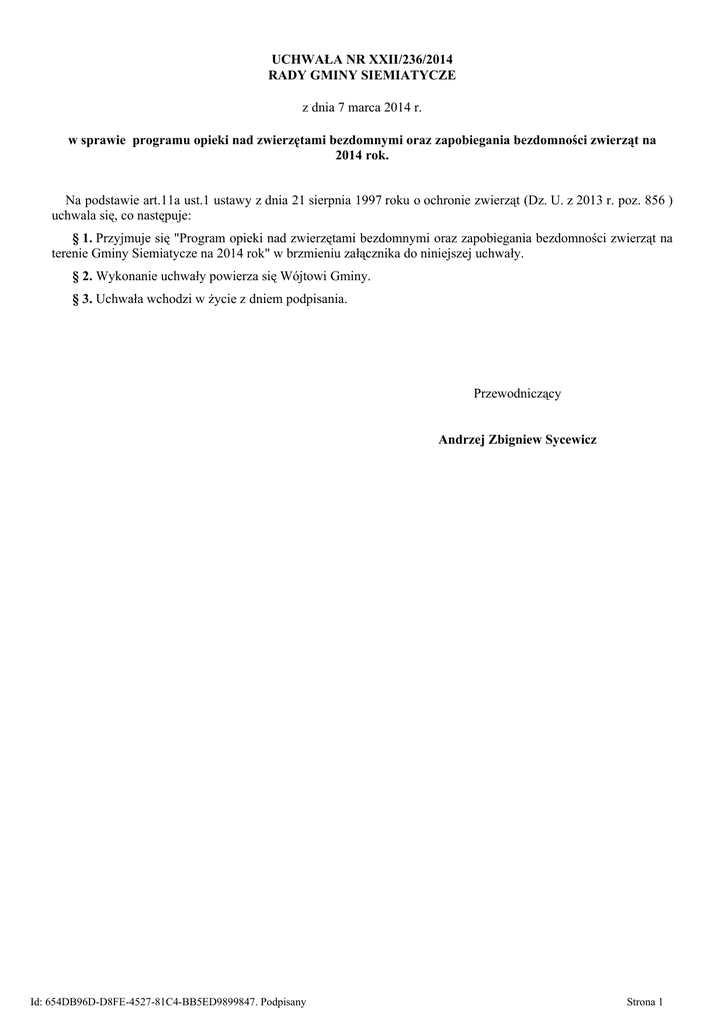 UCHWAŁA NR XXII/236/2014 RADY GMINY SIEMIATYCZE z dnia 7 marca 2014 r. w sprawie programu opieki nad zwierzętami bezdomnymi oraz zapobiegania bezdomności zwierząt na 2014 rok. Na podstawie art.11a ust.1 ustawy z dnia 21 sierpnia 1997 roku o ochronie zwierząt (Dz. U. z 2013 r. poz. 856 ) uchwala się, co następuje: § 1. Przyjmuje się "Program opieki nad zwierzętami bezdomnymi oraz zapobiegania bezdomności zwierząt na terenie Gminy Siemiatycze na 2014 rok" w brzmieniu załącznika do niniejszej uchwały. § 2. Wykonanie uchwały powierza się Wójtowi Gminy. § 3. Uchwała wchodzi w życie z dniem podpisania. Przewodniczący Andrzej Zbigniew Sycewicz Id: 654DB96D-D8FE-4527-81C4-BB5ED9899847. Podpisany Strona 1 Załącznik do Uchwały Nr XXII/236/2014 Rady Gminy Siemiatycze z dnia 7 marca 2014 r. Program opieki nad zwierzętami bezdomnymi oraz zapobieganie bezdomności zwierząt na terenie Gminy Siemiatycze na 2014 rok. Rozdział 1. Postanowienia ogólne. § 1. Program opieki nad zwierzętami bezdomnymi oraz zapobiegania bezdomności zwierząt na terenie Gminy Siemiatycze określa zasady opieki nad zwierzętami bezdomnymi oraz zasady bezdomności zwierząt i obejmuje: 1. Zapewnienie bezdomnym zwierzętom miejsca w schronisku dla zwierząt, 2. Opiekę nad wolno żyjącymi kotami, w tym ich dokarmianie 3. Odławianie bezdomnych zwierząt, 4. Obligatoryjną sterylizację albo kastrację zwierząt w schroniskach dla zwierząt, 5. Poszukiwanie właścicieli dla bezdomnych zwierząt, 6. Usypianie ślepych miotów, 7. Wskazanie gospodarstwa rolnego w celu zapewnienia miejsca dla zwierząt gospodarskich, 8. Zapewnienie całodobowej opieki weterynaryjnej w przypadkach zdarzeń drogowych z udziałem zwierząt . Rozdział 2. Zapewnienie bezdomnym zwierzętom miejsca w schronisku dla zwierząt. § 2. W celu zapewnienia opieki nad bezdomnymi zwierzętami podejmowane będą następujące czynności: 1. odławianie psów i innych zwierząt bezdomnych, transport przekazanych zwierząt z miejsca odbioru do schroniska prowadzone będzie w ramach zawartej umowy z firmą „CENTAUR” Firma Wielobranżowa– Marek Kulesza z siedzibą w Długiej Szlacheckiej przy ulicy Ks.Jerzego Popiełuszki 4 05-071 Sulejówek. 2. opieka tymczasowa, schronienie, wyżywienie, opieka weterynaryjna, dozór całodobowy sprawowana będzie w Schronisku dla zwierząt mieszczącym się pod adresem: Długa Szlachecka, ul. Ks. Jerzego Popiełuszki 4, 05-071 Sulejówek, gmina Halinów powiat miński województwo mazowieckie 3. poszukiwanie właścicieli dla bezdomnych zwierząt, uruchomienie procedury adopcyjnej w stosunku do zwierząt dla których nie ma możliwości ustalenia prawowitych właścicieli, przeprowadzana jest przez firmę „CENTAUR” Firma Wielobranżowa – Marek Kulesza z siedzibą w Długiej Szlacheckiej Rozdział 3. Opieka nad wolno żyjącymi kotami. § 3. Opieka nad wolno żyjącymi kotami na terenie Gminy Siemiatycze realizowana jest przez Gminę Siemiatycze oraz firmę „CENTAUR” Firma Wielobranżowa – Marek Kulesza z siedzibą w Długiej Szlacheckiej w zakresie: 1. Udzielanie pomocy weterynaryjnej, 2. Obligatoryjną sterylizację, 3. Usypianie ślepych miotów, Id: 654DB96D-D8FE-4527-81C4-BB5ED9899847. Podpisany Strona 1 § 4. 1. W celu udzielenia pomocy, przeprowadzenia leczenia i sterylizacji wolno żyjące koty będą w razie potrzeby odławiane przez pracowników firmy „CENTAUR” Firma Wielobranżowa – Marek Kulesza 2. Udzielanie pomocy, oraz dokarmianie wolno żyjących kotów odbywa się w miejscu ich bytowania, zaś leczenie i sterylizacja przeprowadzana jest przez lekarza weterynarii współpracującego z firmą „CENTAUR” Firma Wielobranżowa – Marek Kulesza. 3. Po zakończeniu leczenia, przeprowadzeniu sterylizacji wolno żyjące koty umieszcza się w miejscu, z którego zostały odłowione. 4. Dokarmianie wolno żyjących kotów bytujących na terenie Gminy Siemiatycze realizowane jest przez Urząd Gminy przy współpracy osób, które zobowiążą się do opieki nad tymi zwierzętami. Rozdział 4. Odławianie bezdomnych zwierząt § 5. 1. Czynność odławiania bezdomnych zwierząt, transport, zapewnienie bezdomnym zwierzętom miejsca w schronisku dla zwierząt, oraz poszukiwania właścicieli, uruchomienie procedury adopcyjnej w stosunku do zwierząt dla których nie ma możliwości ustalenia prawowitych właścicieli, przeprowadzana jest przez pracowników firmy „CENTAUR” Firma Wielobranżowa – Marek Kulesza z siedzibą w Długiej Szlacheckiej na wniosek Urzędu Gminy, zgodnie z posiadana umową . 2. Odłowione zwierzęta są przewożone i przetrzymywane w schronisku, z którym współpracuje wyżej wymieniona Firma, gdzie są: 1) poddawane opiece weterynaryjnej, 2) kwarantannie, Rozdział 5. Obligatoryjna sterylizacja zwierząt w schroniskach dla zwierząt. § 6. 1. Odłowione z terenu Gminy Siemiatycze i przewiezione do schroniska dla zwierząt z którym współpracuje firma „CENTAUR” Firma Wielobranżowa– Marek Kulesza, bezdomne zwierzęta po odbyciu kwarantanny oraz dostarczone wolno żyjące koty poddawane są obowiązkowej sterylizacji. 2. Przeprowadzone zabiegi sterylizacji wolno żyjących kotów bytujących na terenie Gminy Siemiatycze opłacone będą po wystawieniu faktury przez firmę „CENTAUR” Firma Wielobranżowa – Marek Kulesza. Rozdział 6. Usypianie ślepych miotów bezdomnych zwierząt i wolno żyjących kotów. § 7. W ramach zapobiegania bezdomności zwierząt lekarz weterynarii współpracujący z firmą „CENTAUR” Firma Wielobranżowa– Marek Kulesza z siedzibą w Długiej Szlacheckiej, które prowadzi odławianie zwierząt z terenu naszej gminy dokonuje usypiania ślepych miotów, które trafią lub urodzą się w schronisku. Rozdział 7. Wskazanie gospodarstwa rolnego w celu zapewnienia miejsca dla zwierząt gospodarskich. § 8. 1. Bezdomnym zwierzętom gospodarskim z terenu Gminy Siemiatycze zapewnia się miejsce w gospodarst