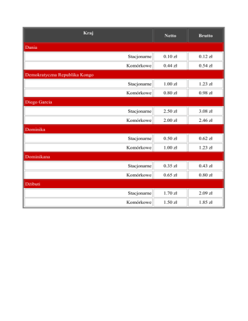 Kraj Netto Brutto Stacjonarne 0.10 zł 0.12 zł Komórkowe 0.44 zł 0.54 zł Stacjonarne 1.00 zł 1.23 zł Komórkowe 0.80 zł 0.98 zł Stacjonarne 2.50 zł 3.08 zł Komórkowe 2.00 zł 2.46 zł Stacjonarne 0.50 zł 0.62 zł Komórkowe 1.00 zł 1.23 zł Stacjonarne 0.35 zł 0.43 zł Komórkowe 0.65 zł 0.80 zł Stacjonarne 1.70 zł 2.09 zł Komórkowe 1.50 zł 1.85 zł Dania Demokratyczna Republika Kongo Diego Garcia Dominika Dominikana Dżibuti
