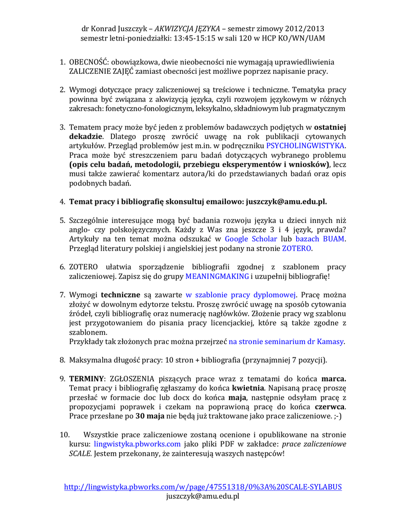 dr Konrad Juszczyk – AKWIZYCJA JĘZYKA – semestr zimowy 2012/2013 semestr letni-‐poniedziałki: 13:45-‐15:15 w sali 120 w HCP KO/WN/UAM 1. OBECNOŚĆ: obowiązkowa, dwie nieobecności nie wymagają uprawiedliwienia ZALICZENIE ZAJĘĆ zamiast obecności jest możliwe poprzez napisanie pracy. 2. Wymogi dotyczące pracy zaliczeniowej są treściowe i techniczne. Tematyka pracy powinna być związana z akwizycją języka, czyli rozwojem językowym w różnych zakresach: fonetyczno-‐fonologicznym, leksykalno, składniowym lub pragmatycznym 3. Tematem pracy może być jeden z problemów badawczych podjętych w ostatniej dekadzie. Dlatego proszę zwrócić uwagę na rok publikacji cytowanych artykułów. Przegląd problemów jest m.in. w podręczniku PSYCHOLINGWISTYKA. Praca może być streszczeniem paru badań dotyczących wybranego problemu (opis celu badań, metodologii, przebiegu eksperymentów i wniosków), lecz musi także zawierać komentarz autora/ki do przedstawianych badań oraz opis podobnych badań. 4. Temat pracy i bibliografię skonsultuj emailowo: [email protected]. 5. Szczególnie interesujące mogą być badania rozwoju języka u dzieci innych niż anglo-‐ czy polskojęzycznych. Każdy z Was zna jeszcze 3 i 4 język, prawda? Artykuły na ten temat można odszukać w Google Scholar lub bazach BUAM. Przegląd literatury polskiej i angielskiej jest podany na stronie ZOTERO. 6. ZOTERO ułatwia sporządzenie bibliografii zgodnej z szablonem pracy zaliczeniowej. Zapisz się do grupy MEANINGMAKING i uzupełnij bibliografię! 7. Wymogi techniczne są zawarte w szablonie pracy dyplomowej. Pracę można złożyć w dowolnym edytorze tekstu. Proszę zwrócić uwagę na sposób cytowania źródeł, czyli bibliografię oraz numerację nagłówków. Złożenie pracy wg szablonu jest przygotowaniem do pisania pracy licencjackiej, które są także zgodne z szablonem. Przykłady tak złożonych prac można przejrzeć na stronie seminarium dr Kamasy. 8. Maksymalna długość pracy: 10 stron + bibliografia (przynajmniej 7 pozycji). 9. TERMINY: ZGŁOSZENIA piszących prace wraz z tematami do końca marca. Temat pracy i bibliografię zgłaszamy do końca kwietnia. Napisaną pracę proszę przesłać w formacie doc lub docx do końca maja, następnie odsyłam pracę z propozycjami poprawek i czekam na poprawioną pracę do końca czerwca. Prace przesłane po 30 maja nie będą już traktowane jako prace zaliczeniowe. ;-‐) 10. Wszystkie prace zaliczeniowe zostaną ocenione i opublikowane na stronie kursu: lingwistyka.pbworks.com jako pliki PDF w zakładce: prace zaliczeniowe SCALE. Jestem przekonany, że zainteresują waszych następców! http://lingwistyka.pbworks.com/w/page/47551318/0%3A%20SCALE-‐SYLABUS [email protected]