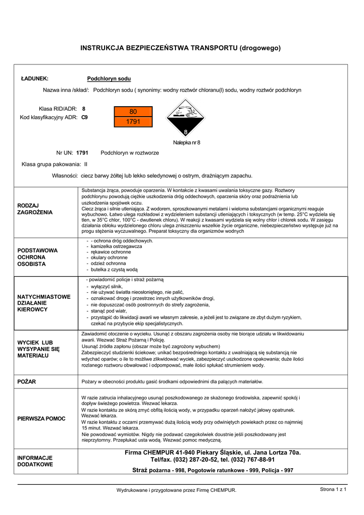 INSTRUKCJA BEZPIECZEŃSTWA TRANSPORTU (drogowego) ŁADUNEK: Podchloryn sodu Nazwa inna /skład/: Podchloryn sodu ( synonimy: wodny roztwór chloranu(l) sodu, wodny roztwór podchloryn Klasa RID/ADR: 8 Kod klasyfikacyjny ADR: C9 80 1791 Nalepka nr 8 Nr UN: 1791 Podchloryn w roztworze Klasa grupa pakowania: II Własności: ciecz barwy żółtej lub lekko seledynowej o ostrym, drażniącym zapachu. RODZAJ ZAGROŻENIA Substancja żrąca, powoduje oparzenia. W kontakcie z kwasami uwalania toksyczne gazy. Roztwory podchlorynu powodują ciężkie uszkodzenia dróg oddechowych, oparzenia skóry oraz podrażnienia lub uszkodzenia spojówek oczu. Ciecz żrąca i silnie utleniająca. Z wodorem, sproszkowanymi metalami i wieloma substancjami organicznymi reaguje wybuchowo. Łatwo ulega rozkładowi z wydzieleniem substancji utleniających i toksycznych (w temp. 25°C wydziela się tlen, w 35°C chlor, 100°C - dwutlenek chloru). W reakcji z kwasami wydziela się wolny chlor i chlorek sodu. W zasięgu działania obłoku wydzielonego chloru ulega zniszczeniu wszelkie życie organiczne, niebezpieczeństwo występuje już na progu stężenia wyczuwalnego. Preparat toksyczny dla organizmów wodnych PODSTAWOWA OCHRONA OSOBISTA - - ochrona dróg oddechowych. kamizelka ostrzegawcza rękawice ochronne okulary ochronne odzież ochronna butelka z czystą wodą NATYCHMIASTOWE DZIAŁANIE KIEROWCY - powiadomić policje i straż pożarną - wyłączyć silnik, - nie używać światła nieosłoniętego, nie palić, - oznakować drogę i przestrzec innych użytkowników drogi, - nie dopuszczać osób postronnych do strefy zagrożenia, - stanąć pod wiatr, - przystąpić do likwidacji awarii we własnym zakresie, a jeżeli jest to związane ze zbyt dużym ryzykiem, czekać na przybycie ekip specjalistycznych. WYCIEK LUB WYSYPANIE SIĘ MATERIAŁU Zawiadomić otoczenie o wycieku. Usunąć z obszaru zagrożenia osoby nie biorące udziału w likwidowaniu awarii. Wezwać Straż Pożarną i Policję. Usunąć źródła zapłonu (obszar może być zagrożony wybuchem) Zabezpieczyć studzienki ściekowe; unikać bezpośredniego kontaktu z uwalniającą się substancją nie wdychać oparów; o ile to możliwe zlikwidować wyciek, zabezpieczyć uszkodzone opakowania; duże ilości rozlanego roztworu obwałować i odpompować, małe ilości spłukać strumieniem wody. POŻAR Pożary w obecności produktu gasić środkami odpowiednimi dla palących materiałów. PIERWSZA POMOC W razie zatrucia inhalacyjnego usunąć poszkodowanego ze skażonego środowiska, zapewnić spokój i dopływ świeżego powietrza. Wezwać lekarza. W razie kontaktu ze skórą zmyć obfitą ilością wody, w przypadku oparzeń nałożyć jałowy opatrunek. Wezwać lekarza. W razie kontaktu z oczami przemywać dużą ilością wody przy odwiniętych powiekach przez co najmniej 15 minut. Wezwać lekarza. Nie powodować wymiotów. Nigdy nie podawać czegokolwiek doustnie jeśli poszkodowany jest nieprzytomny. Przepłukać usta wodą. Wezwać pomoc medyczną. INFORMACJE DODATKOWE Firma CHEMPUR 41-940 Piekary Śląskie, ul. Jana Lortza 70a. Tel/fax. (032) 287-20-52, tel. (032) 767-88-91 Straż pożarna - 998, Pogotowie ratunkowe - 999, Policja - 997 Wydrukowane i przygotowane przez Firmę CHEMPUR. Strona 1 z 1