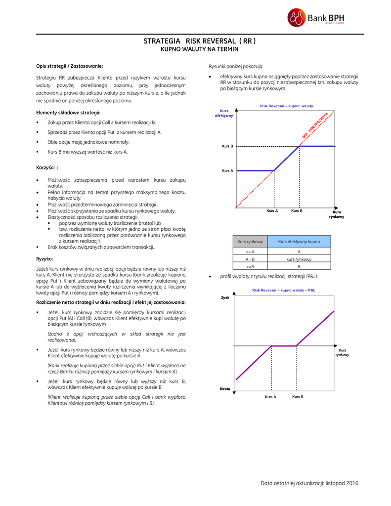 STRATEGIA RISK REVERSAL ( RR ) KUPNO WALUTY NA TERMIN Opis strategii / Zastosowanie: Rysunki poniżej pokazują: Strategia RR zabezpiecza Klienta przed ryzykiem wzrostu kursu waluty powyżej określonego poziomu, przy jednoczesnym zachowaniu prawa do zakupu waluty po niższym kursie, o ile jednak nie spadnie on poniżej określonego poziomu. efektywny kurs kupna osiągnięty poprzez zastosowanie strategii RR w stosunku do pozycji niezabezpieczonej tzn. zakupu waluty po bieżącym kursie rynkowym: Ri sk Reversal – kupno waluty Elementy składowe strategii: Obie opcje mają jednakowe nominały. Kurs B ma wyższą wartość niż kurs A. Kurs A Możliwość zabezpieczenia przed wzrostem kursu zakupu waluty. Pełna informacja na temat przyszłego maksymalnego kosztu nabycia waluty. Możliwość przedterminowego zamknięcia strategii. Możliwość skorzystania ze spadku kursu rynkowego waluty. Elastyczność sposobu rozliczenia strategii: poprzez wymianę waluty (rozliczenie brutto) lub tzw. rozliczenie netto, w którym jedna ze stron płaci kwotę rozliczenia (obliczoną przez porównanie kursu rynkowego z kursem realizacji). Brak kosztów związanych z zawarciem transakcji.. Kurs A Kurs rynkowy Ryzyko: Jeżeli kurs rynkowy w dniu realizacji opcji będzie równy lub niższy niż kurs A, Klient nie skorzysta ze spadku kursu (bank zrealizuje kupioną opcję Put i Klient zobowiązany będzie do wymiany walutowej po kursie A lub do wypłacenia kwoty rozliczenia wynikającej z iloczynu kwoty opcji Put i różnicy pomiędzy kursem A i rynkowym). Rozliczenie netto strategii w dniu realizacji i efekt jej zastosowania: IA Kurs B Korzyści : ZE N Sprzedaż przez Kienta opcji Put z kursem realizacji A. PI EC ZA BE Z Zakup przez Klienta opcji Call z kursem realizacji B. BE Z Kurs efektywny Kurs B Kurs rynkowy Kurs efektywny kupna <= A A A-B kurs rynkowy >=B B profil wypłaty z tytułu realizacji strategii (P&L): Ri sk Reversal – kupno waluty – P&L Zysk Jeżeli kurs rynkowy znajdzie się pomiędzy kursami realizacji opcji Put (A) i Call (B), wówczas Klient efektywnie kupi walutę po bieżącym kursie rynkowym (żadna z opcji wchodzących w skład strategii nie jest realizowana). Jeżeli kurs rynkowy będzie równy lub niższy niż kurs A, wówczas Klient efektywnie kupuje walutę po kursie A Kurs rynkowy (Bank realizuje kupioną przez siebie opcję Put i Klient wypłaca na rzecz Banku różnicę pomiędzy kursem rynkowym i kursem A). Jeżeli kurs rynkowy będzie równy lub wyższy niż kurs B, wówczas Klient efektywnie kupuje walutę po kursie B (Klient realizuje kupioną przez siebie opcję Call i bank wypłaca Klientowi różnicę pomiędzy kursem rynkowym i B). Strata Kurs A Kurs B Data ostatniej aktualizacji: listopad 2016 STRATEGIA RISK REVERSAL ( RR ) KUPNO WALUTY NA TERMIN Ryzyka związane z zawieraniem transakcji terminowych: • Ryzyko niedopasowania – polega na możliwości niedopasowania przepływów Klienta z jego zobowiązaniami wynikającymi z zawarcia transakcji. Ryzyko niedopasowania dotyczy przede wszystkim transakcji zawieranych przez Klienta w celu zabezpieczenia ekspozycji naturalnej przed niekorzystnym kształtowaniem się rynkowych stóp procentowych i/lub kursów walutowych. • Ryzyko rynkowe – wynika z niekorzystnych (innych od oczekiwań Klienta) zmian wartości parametrów otoczenia rynkowego (kursów walutowych, stóp procentowych, etc.) w trakcie trwania transakcji, co może skutkować zmianami wartości nabytego instrumentu finansowego • Ryzyko operacyjne – wynika z zawodności procesów wewnętrznych, ludzi i systemów lub ze zdarzeń zewnętrznych, mających pośredni lub bezpośredni wpływ na rozliczenie zawartych transakcji; • Ryzyko kredytowe – polega na zagrożeniu nieuregulowania przez jedną ze stron transakcji zobowiązań wynikających z zawarcia transakcji. • Ryzyko księgowe – związane jest z niewłaściwym sposobem ewidencji transakcji przez Klienta, czego efektem może być w szczególności zawyżanie lub zaniżanie faktycznych wyników. • Ryzyko podatkowe – związane jest z możliwością wystąpienia błędu, opóźnienia rozliczenia podatkowego lub wystąpienia nieprawidłowości wynikających z braku pewności co do konsekwencji podatkowych związanych z transakcjami; Zabezpieczanie transakcji: • Zabezpieczanie wykonania transakcji odbywa się zgodnie z Regulaminem „Ogólne Warunki Współpracy z Klientami w zakresie transakcji rynku finansowego”. • Bank na podstawie oceny sytuacji finansowo-ekonomicznej Klienta, może ustalić Limit, w ramach którego są zawierane transakcje. • Od rodzaju i wysokości przyznanego limitu skarbowego zależy sposób, w jaki Klient ustanawia i uzupełnia zabezpieczenie zawieranych transakcji skarbowych (zabezpieczenie wstępne / zabezpieczenie bieżące) • Bank na bieżąco wycenia i monitoruje wartość rynkową wszystkich zawartych transakcji z Klientem i w zależności od zmian wyceny, na bieżąco prosi o uzupełnienie zabezpieczenia bieżącego lub dokonuje jego zwrotu: Jeżeli wartość zabezpieczenia jest mniejsza niż suma wartości rynkowej transakcji i ekwiwalentu ryzyka pakietu transakcji (po ewentualnym pomniejszeniu o Limit Skarbowy), wówczas Klient jest zobowiązany do uzupełnienia zabezpieczenia bieżącego w ciągu 1 dnia roboczego. Jeżeli wartość zabezpieczenia jest większa niż suma wartości rynkowej transakcji i ekwiwalentu ryzyka pakietu transakcji (po ewentualnym pomniejszeniu o Limit Skarbowy), wówczas Bank zwraca Klientowi zabezpieczenie w ciągu 1 dnia roboczego. „Niniejsza publikacja stanowi informację o instrumentach finansowych będących instrumentami pochodnymi.” Niniejsza publikacja nie stanowi oferty w rozumieniu art. 66 Kodeksu cywilnego. Ma ona charakter wyłącznie informacyjny. Alior Bank SA w ramach działalności przejętej z Banku BPH, w szczególności poprzez informacje zawarte w niniejszej publikacji, nie świadczy doradztwa inwest