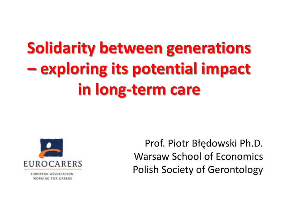 Solidarity between generations – exploring its potential impact in long-term care Prof. Piotr Błędowski Ph.D. Warsaw School of Economics Polish Society of Gerontology Self-assessment of health conditions and activities of Poles (2009) Samoocena stanu zdrowia i aktywności Polaków (2009 r.) Age group (years) Health condition: poor and very poor Long-term health problems Daily activities very limited Zły i bardzo zły stan zdrowia Długotrwałe Sprawność bardzo problemy ograniczona zdrowotne Daily activities rather limited Sprawność dość ograniczona 16 – 29 2.3% 8.5% 1.5% 3.8% 30 – 44 5.1% 14.8% 1.9% 6.9% 45 – 59 17.5% 37.3% 5.9% 18.6% 60 – 74 38.3% 63.7% 13.8% 30.5% 75 + 58.4% 78.3% 28.3% 37.9% Men 52.3% 74.5% 24.7% 36.5% Women 51.4% 80.2% 30.1% 38.6% Source: Polish Statistical Office (GUS) 2009. People claiming they need round the clock the respective support in the age groups (in per cent) Osoby wymagające stałej opieki i pielęgnacji według wieku (w %) Age groups (years) 65 – 69 70 – 74 75 – 79 80 – 84 85 - 89 90 or more Men 18.3 16.2 19.1 17.6 22.1 24.7 Women 17.3 11.6 23.3 22.5 27.3 33.7 Source: results of the representative PolSenior survey conducted 2010 on the sample of 5695 elderly people in Poland Percentage of one-person households in Poland run by persons aged 65 or more in years 2002 and 2030 Odsetek gospodarstw jednoosobowych, prowadzonych w Polsce przez osoby w wieku 65 lat i więcej w latach 2002 - 2030 age brackets 2002 % 65 – 69 70 – 74 75 – 79 80 or more Total Source: Polish Statistical Office (GUS) 2009. 2030 % 9,4 10,7 9,5 9,2 38,7 9,5 12,9 13,7 17,3 53,3 in 1000 487,5 663,5 702,3 886,9 2740,3 Most important type of support in opinion of service providers and family carers in Poland 2004 (in per cent) Najważniejsze typy wsparcia opiekunów rodzinnych w opinii opiekunów profesjonalnych i opiekunów rodzinnych (w %) Types of support Training to help family carers develop the skills they need to care Szkolenie opiekunów rodzinnych w celu poprawy ich umiejętności Help with planning future care Pomoc w planowaniu przyszłej opieki The possibility to combine caregiving with paid employment Możliwość łączenia sprawowania opieki z praca zarobkową Service providers Family carers 9.8 1.8 - 4.9 2.4 8.9 Eurofamcare Source: Family Caregiving for the Elderly in Poland, 2006. Informal carers – a silent, unvisible … Opiekunowie nieformalni – cicha, niewidoczna … … and unnoticed … … i niedostrzegana… …army of people who want to obey the basic rights of patients to be properly and efficiently taken care of. …armia osób chcących dbać o prawa pacjenta do starannej i troskliwej opieki. Eurocarers were asked by EC to express their opinions on the following issues: • The disability strategy and agenda 2020 • Sustainable and affordable pension systems • Active ageing and solidarity between generations • Healthy ageing • Flexicurity, flexibility in labour market and social security • Sustainable workforce for health • The Open Method of Coordination in European Policy For more information: www.eurocarers.org Thank you very much [email protected]