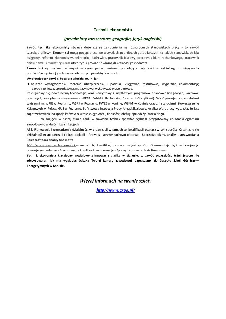 Technik ekonomista (przedmioty rozszerzone: geografia, język angielski) Zawód technika ekonomisty stwarza duże szanse zatrudnienia na różnorodnych stanowiskach pracy - to zawód szerokoprofilowy. Ekonomiści mogą podjąć pracę we wszystkich podmiotach gospodarczych na takich stanowiskach jak: księgowy, referent ekonomiczny, sekretarka, kadrowiec, pracownik biurowy, pracownik biura rachunkowego, pracownik działu handlu i marketingu oraz utworzyć i prowadzić własną działalności gospodarczą. Ekonomiści są osobami cenionymi na rynku pracy, ponieważ posiadają umiejętności samodzielnego rozwiązywania problemów występujących we współczesnych przedsiębiorstwach. Wybierając ten zawód, będziesz wiedział m. in. jak: naliczać wynagrodzenia, rozliczać ubezpieczenia i podatki, księgować, fakturować, wypełniać dokumentację zaopatrzeniową, sprzedażową, magazynową, wykonywać prace biurowe. Posługujemy się nowoczesną technologią oraz korzystamy z użytkowych programów finansowo-księgowych, kadrowopłacowych, zarządzania magazynem (INSERT: Subiekt, Rachmistrz, Rewizor i Gratyfikant). Współpracujemy z uczelniami wyższymi m.in. UE w Poznaniu, WSPS w Poznaniu, PWSZ w Koninie, WSKM w Koninie oraz z instytucjami: Stowarzyszenie Księgowych w Polsce, GUS w Poznaniu, Państwowa Inspekcja Pracy, Urząd Skarbowy. Analiza ofert pracy wykazała, że jest zapotrzebowanie na specjalistów w zakresie księgowości, finansów, obsługi sprzedaży i marketingu. Po podjęciu w naszej szkole nauki w zawodzie technik spedytor będziesz przygotowany do zdania egzaminu zawodowego w dwóch kwalifikacjach: A35. Planowanie i prowadzenie działalności w organizacji w ramach tej kwalifikacji poznasz w jaki sposób: Organizuje się działalność gospodarczą i oblicza podatki - Prowadzi sprawy kadrowo-płacowe - Sporządza plany, analizy i sprawozdania i przeprowadza analizy finansowe A36. Prowadzenie rachunkowości w ramach tej kwalifikacji poznasz w jaki sposób: -Dokumentuje się i ewidencjonuje operacje gospodarcze - Przeprowadza i rozlicza inwentaryzację - Sporządza sprawozdania finansowe. Technik ekonomista kształcony modułowo z innowacją grafika w biznesie, to zawód przyszłości. Jeżeli jeszcze nie zdecydowałeś, jak ma wyglądać ścieżka Twojej kariery zawodowej, zapraszamy do Zespołu Szkół Górniczo— Energetycznych w Koninie. Więcej informacji na stronie szkoły http://www.zsge.pl/